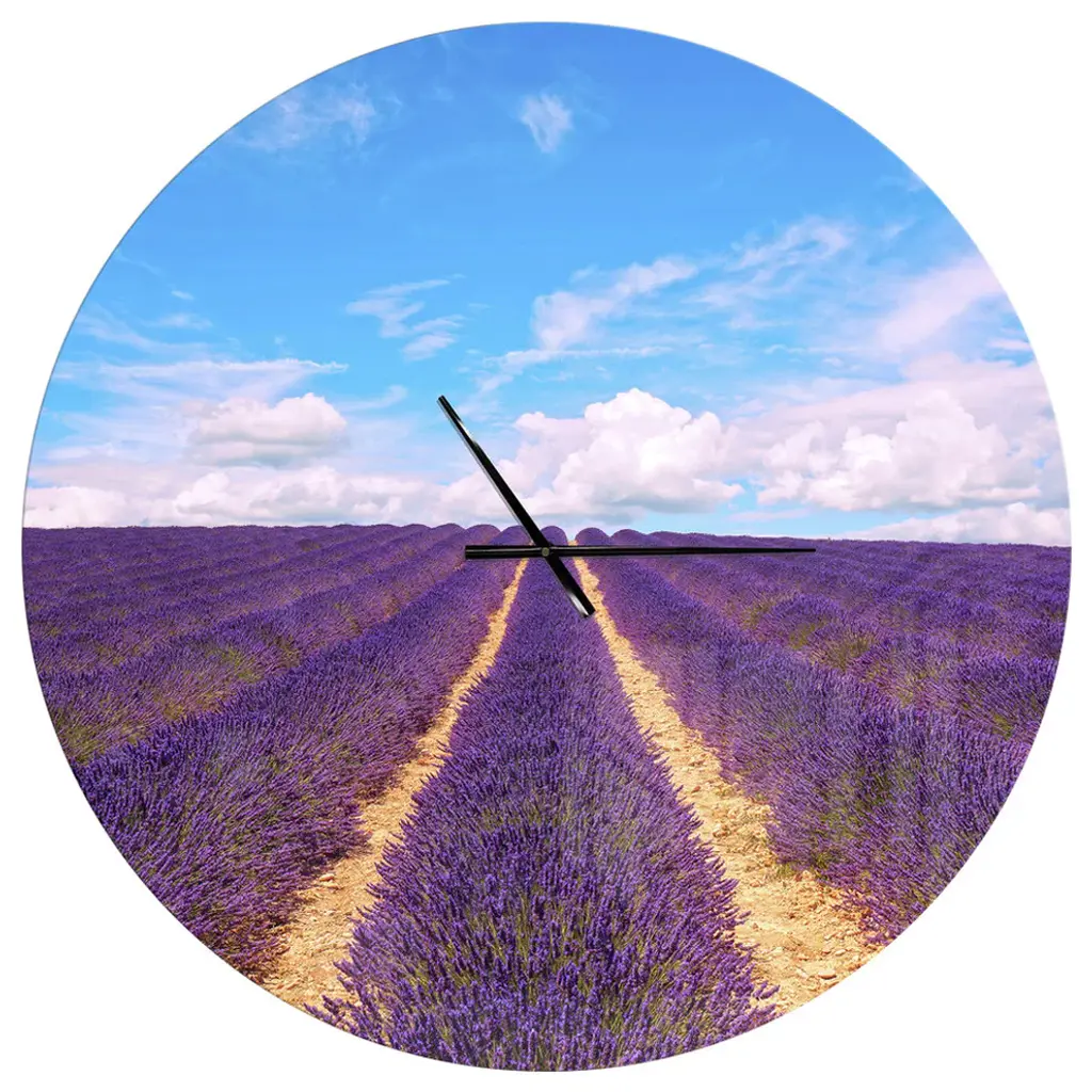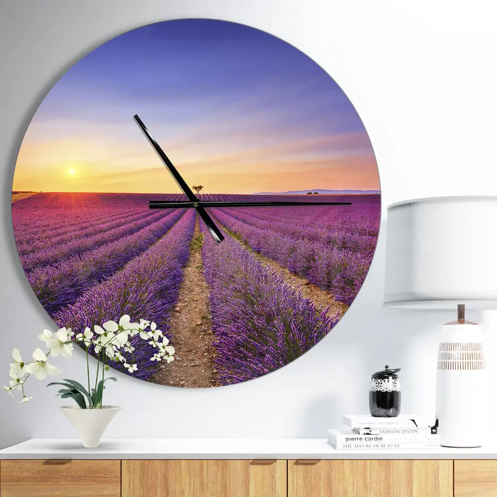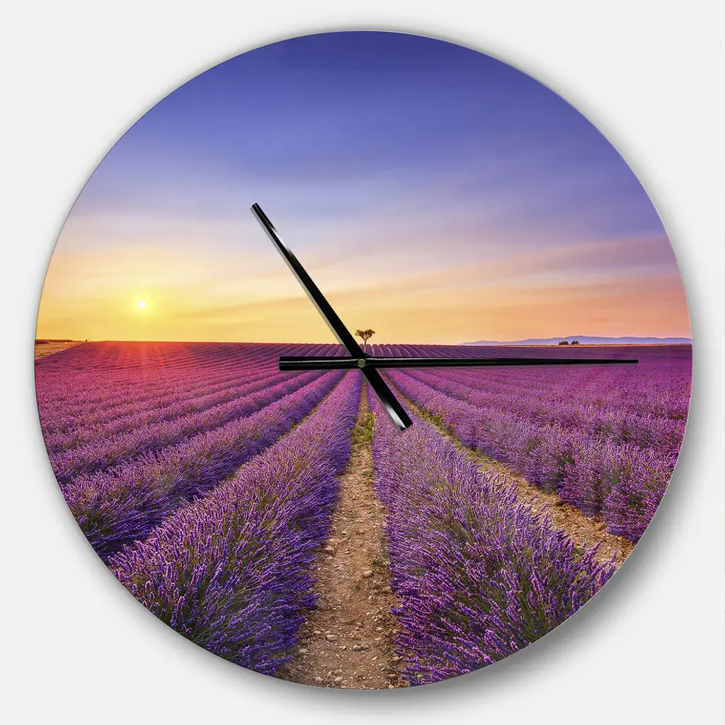 A beautiful addition to any home or office, this Farmhouse round wall clock is made on 100% solid aluminum. It has a highly reflective glossy finish creating a sleek modern look. This Lavender Field in Provence France wall clock arrives completely ready to hang on the wall. Simply insert the �AAA� battery included with your order.Available in several size, this Modern Oversized Clock makes it the focal point of any room.Features - Ultra Gloss Coating ensures colors are extra vibrant with light reflection. - 1mm Aluminum grade sheet metal. - 1-inch mounting frame gives the illusion of artwork floating on the wall. - Mounting brackets and instructions are included. - High quality digital images are created directly into a glossy aluminum panel, producing a stunning and captivating print in the glossy finish of the metal. - Looks better than any photo paper and guaranteed to last at least 20 years. - Easy to clean with a microfiber cloth. - "AAA" battery included with your order. - Easy to hang. - Style: Farmhouse - Material: Metal - Shape: RoundSee Options drop down for available sizes.