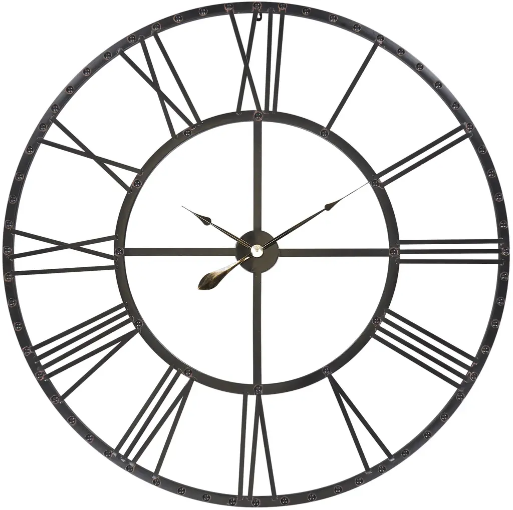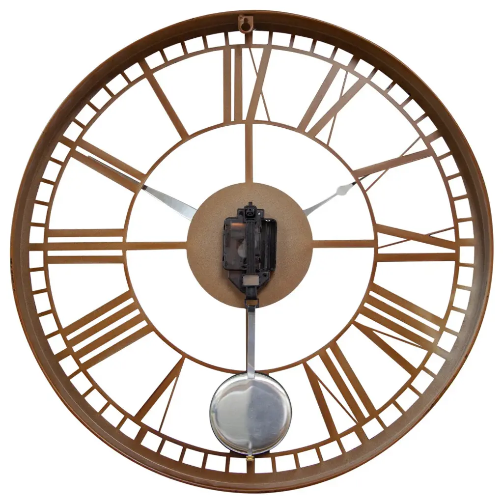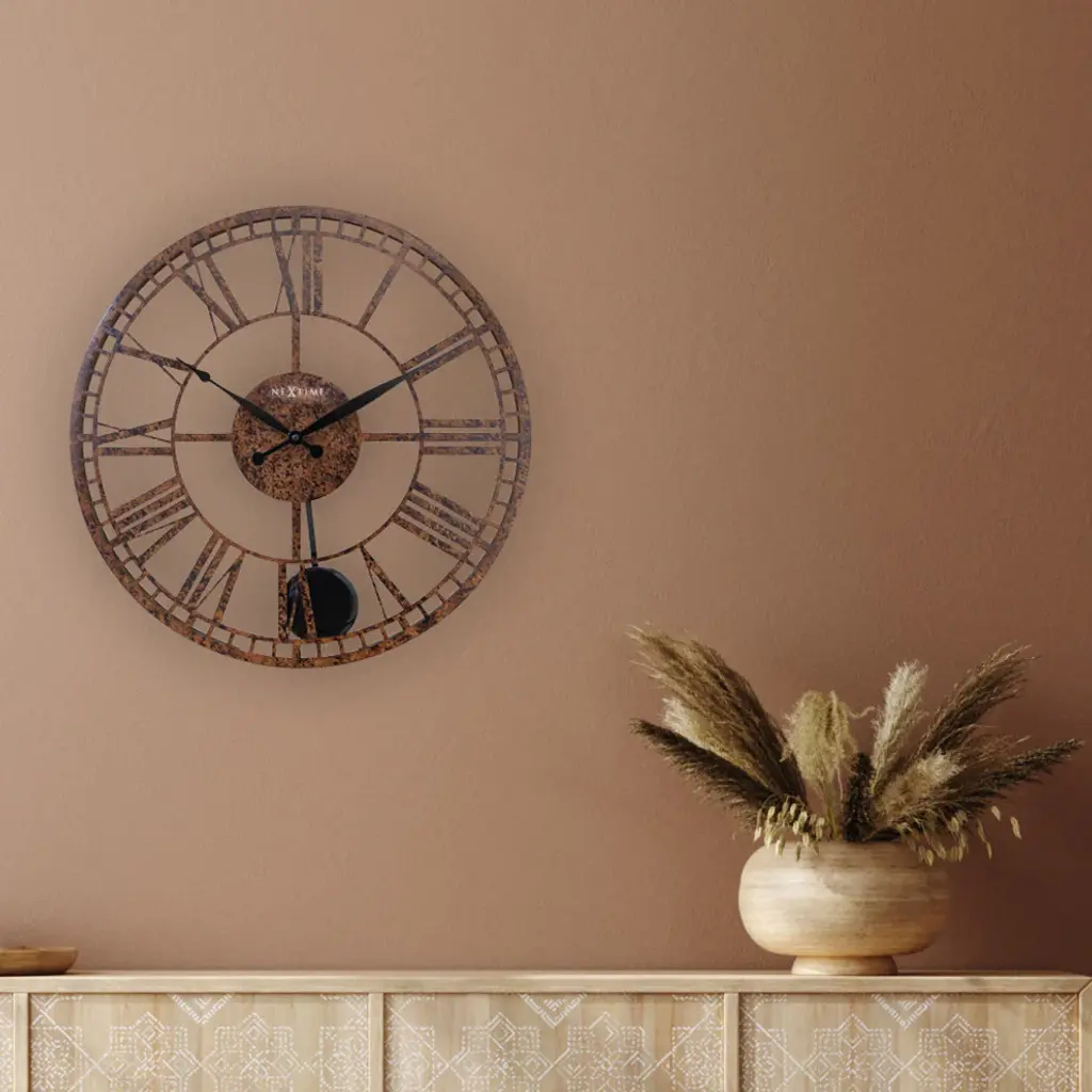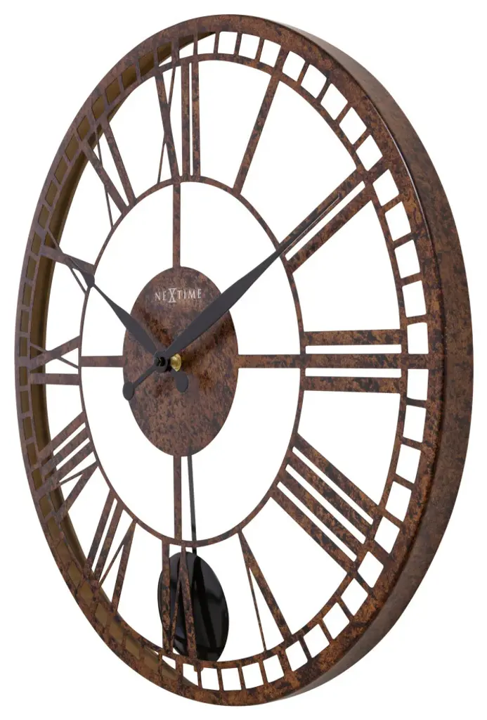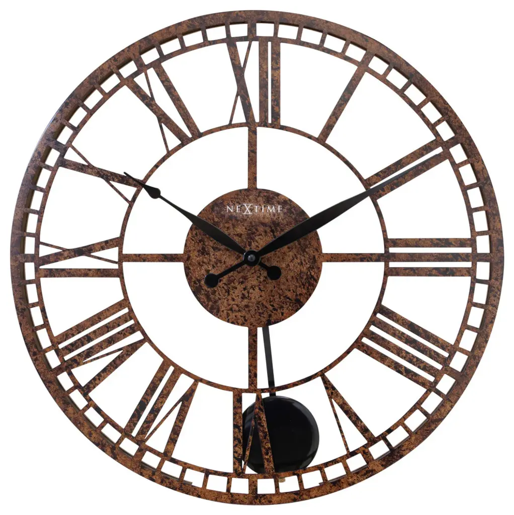 The NeXtime "London" 20 inch industrial wall clock is designed with a unique open face and a rustic brown punched-through metal dial. The clock has a roman index and lovely black hands. The black pendulum runs subtly behind the clock with which you see the time passing by. This clock runs on 1x AA battery (not included)