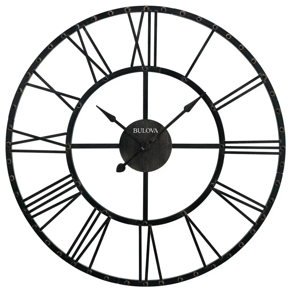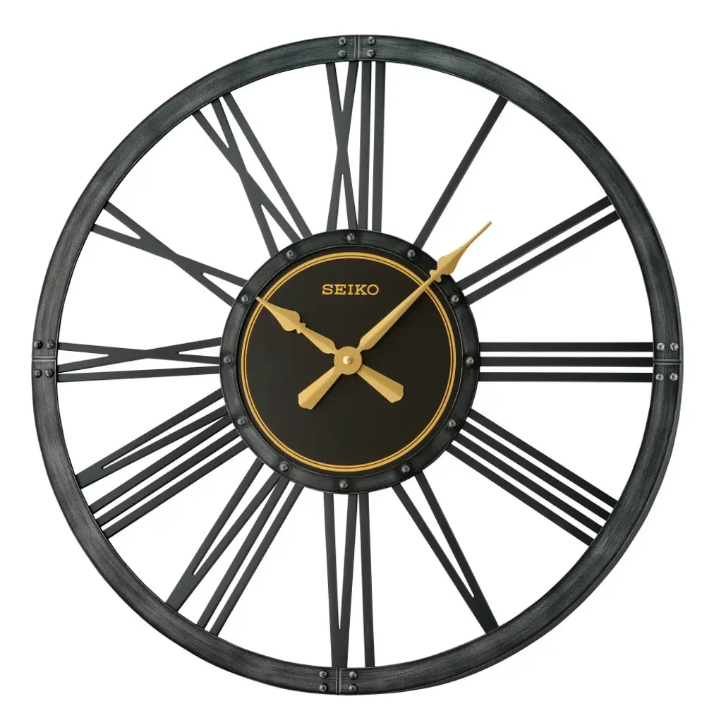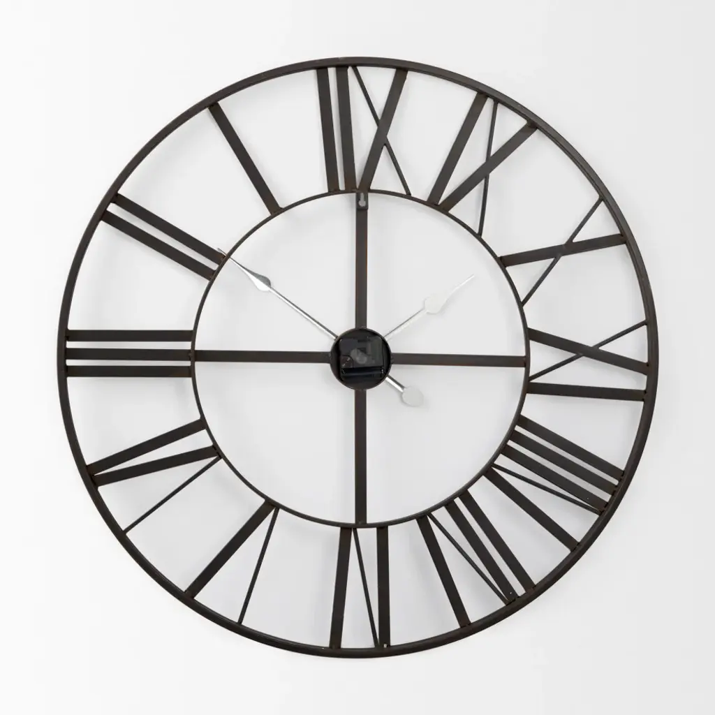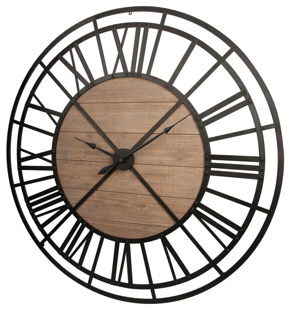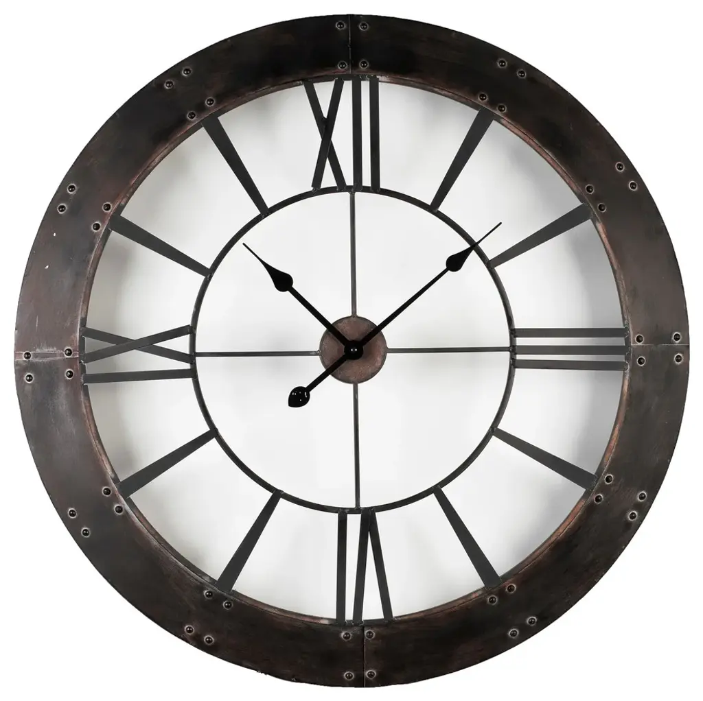 The NeXtime "London" 20 inch industrial wall clock is designed with a unique open face and a rustic brown punched-through metal dial. The clock has a roman index and lovely black hands. The black pendulum runs subtly behind the clock with which you see the time passing by. This clock runs on 1x AA battery (not included)