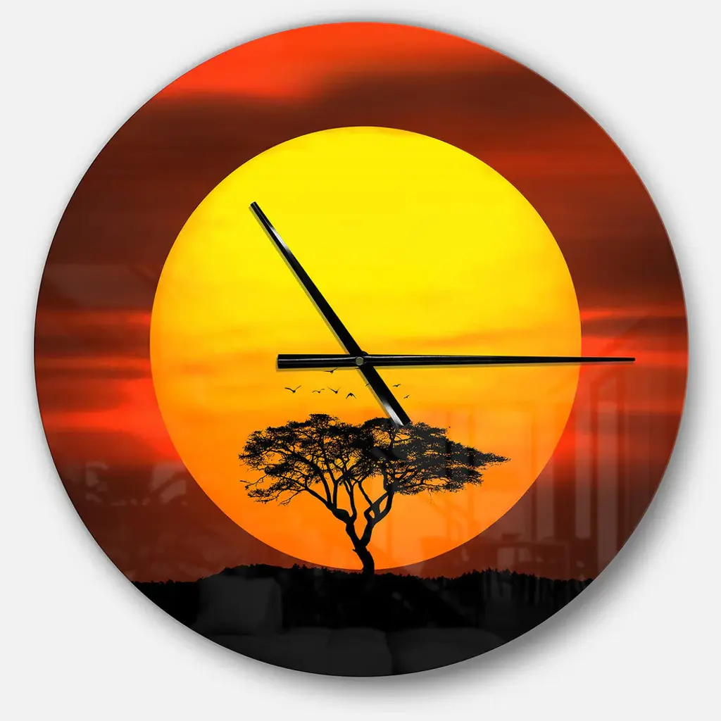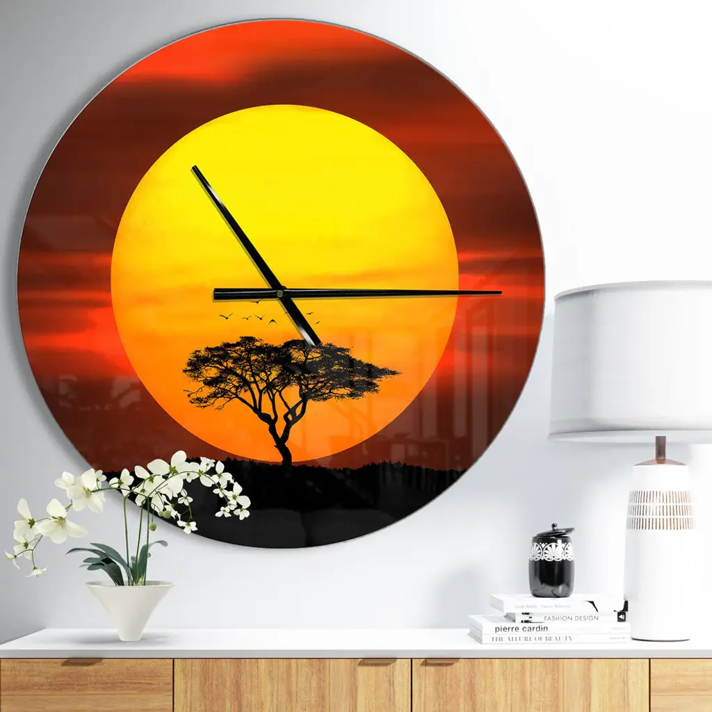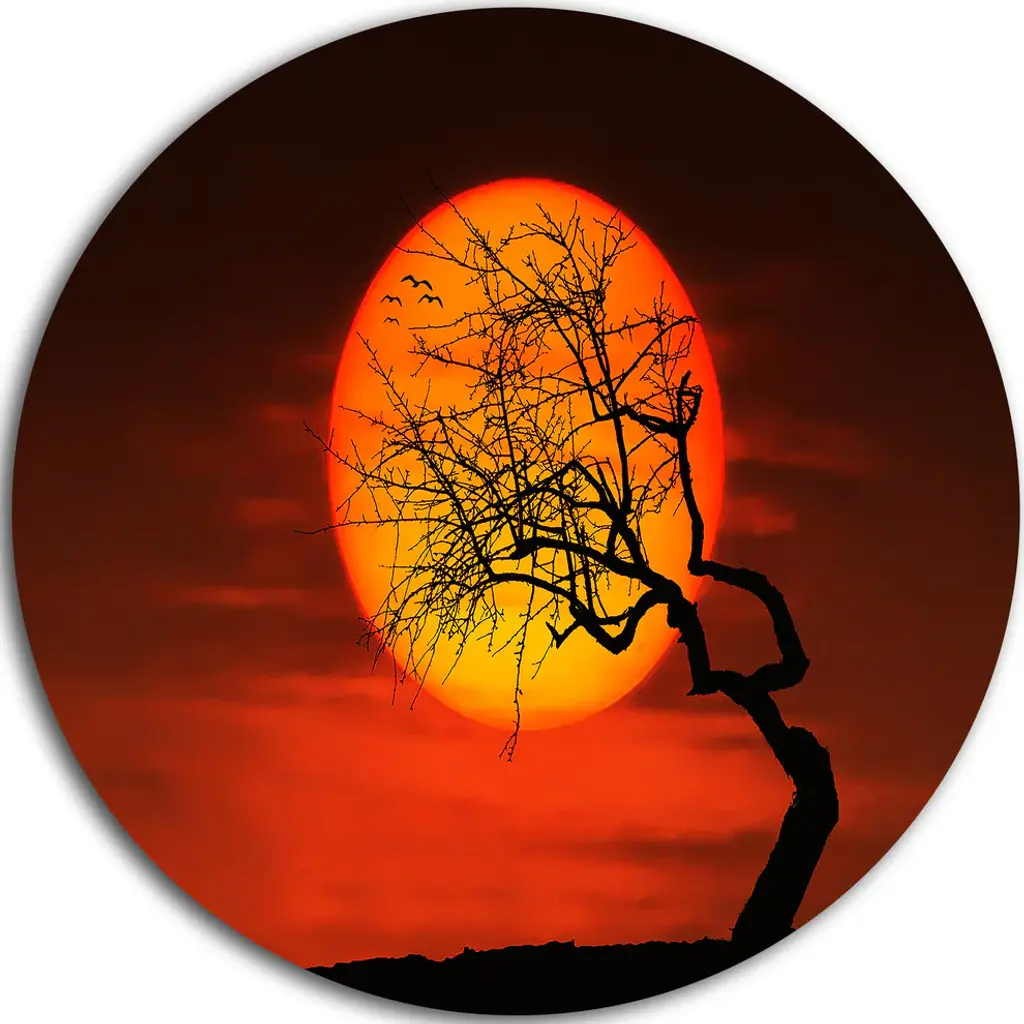 A beautiful addition to any home or office, this Modern & Contemporary round wall clock is made on 100% solid aluminum. It has a highly reflective glossy finish creating a sleek modern look. This Lonely Tree with Birds at Sunset wall clock arrives completely ready to hang on the wall. Simply insert the �AAA� battery included with your order.Available in several size, this Modern Oversized Clock makes it the focal point of any room.Features - Ultra Gloss Coating ensures colors are extra vibrant with light reflection. - 1mm Aluminum grade sheet metal. - 1-inch mounting frame gives the illusion of artwork floating on the wall. - Mounting brackets and instructions are included. - High quality digital images are created directly into a glossy aluminum panel, producing a stunning and captivating print in the glossy finish of the metal. - Looks better than any photo paper and guaranteed to last at least 20 years. - Easy to clean with a microfiber cloth. - "AAA" battery included with your order. - Easy to hang. - Style: Modern & Contemporary - Material: Metal - Shape: RoundSee Options drop down for available sizes.