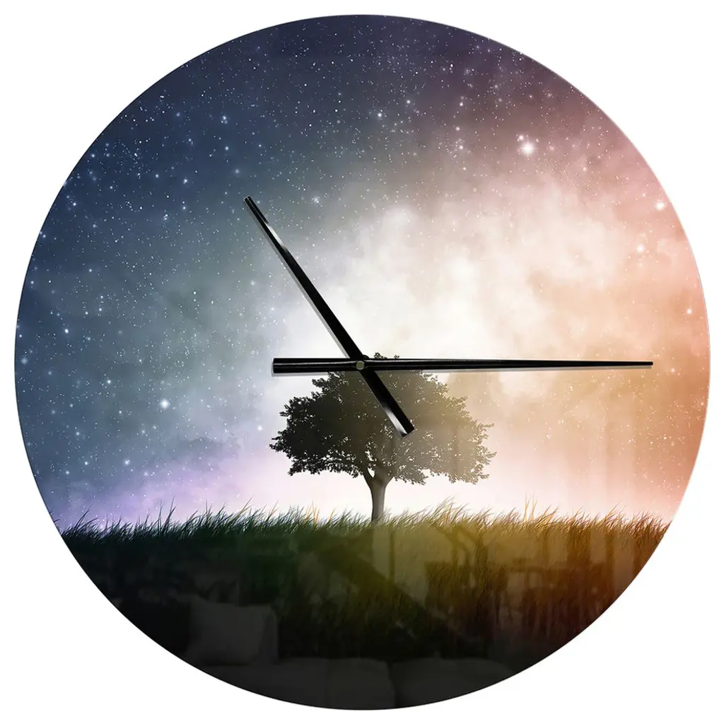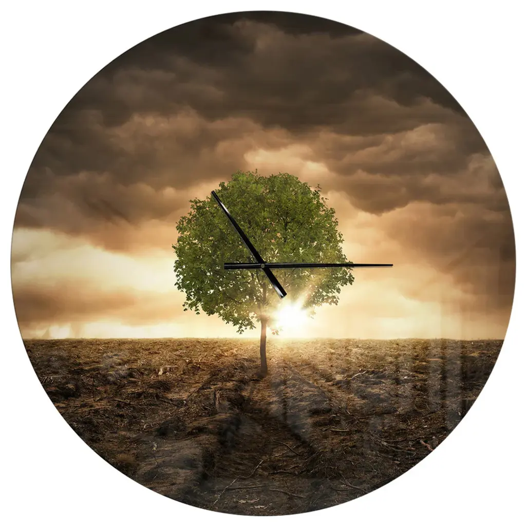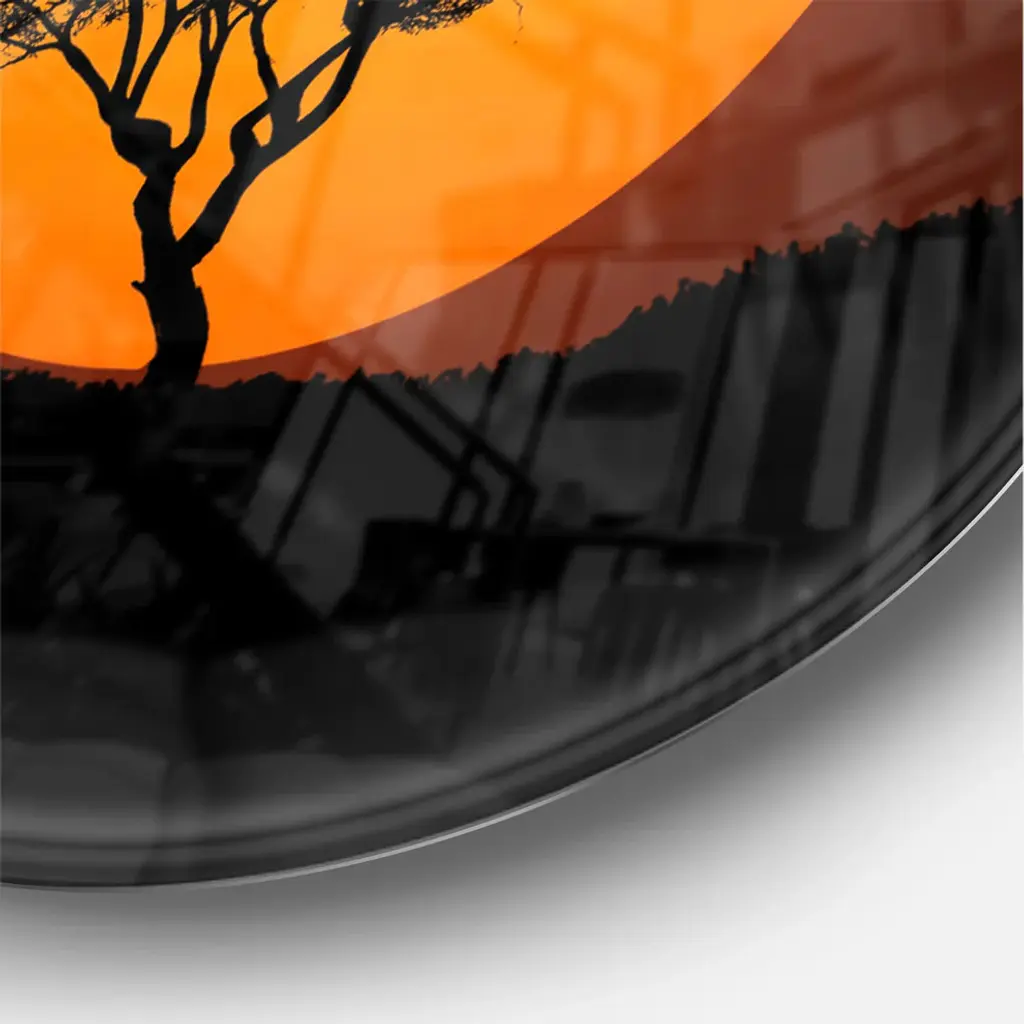 A beautiful addition to any home or office, this Modern & Contemporary round wall clock is made on 100% solid aluminum. It has a highly reflective glossy finish creating a sleek modern look. This Lonely Tree with Birds at Sunset wall clock arrives completely ready to hang on the wall. Simply insert the �AAA� battery included with your order.Available in several size, this Modern Oversized Clock makes it the focal point of any room.Features - Ultra Gloss Coating ensures colors are extra vibrant with light reflection. - 1mm Aluminum grade sheet metal. - 1-inch mounting frame gives the illusion of artwork floating on the wall. - Mounting brackets and instructions are included. - High quality digital images are created directly into a glossy aluminum panel, producing a stunning and captivating print in the glossy finish of the metal. - Looks better than any photo paper and guaranteed to last at least 20 years. - Easy to clean with a microfiber cloth. - "AAA" battery included with your order. - Easy to hang. - Style: Modern & Contemporary - Material: Metal - Shape: RoundSee Options drop down for available sizes.