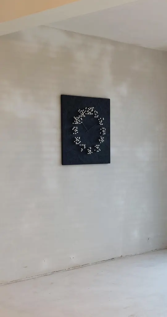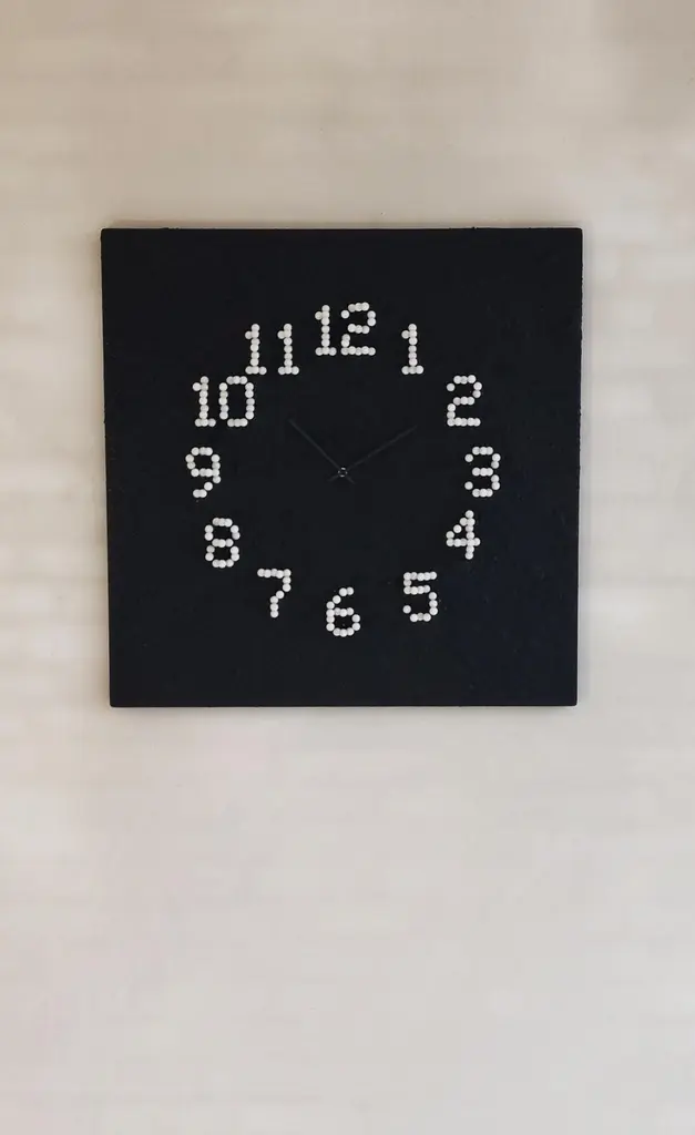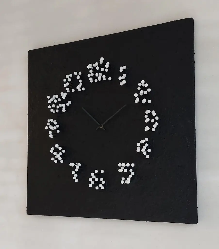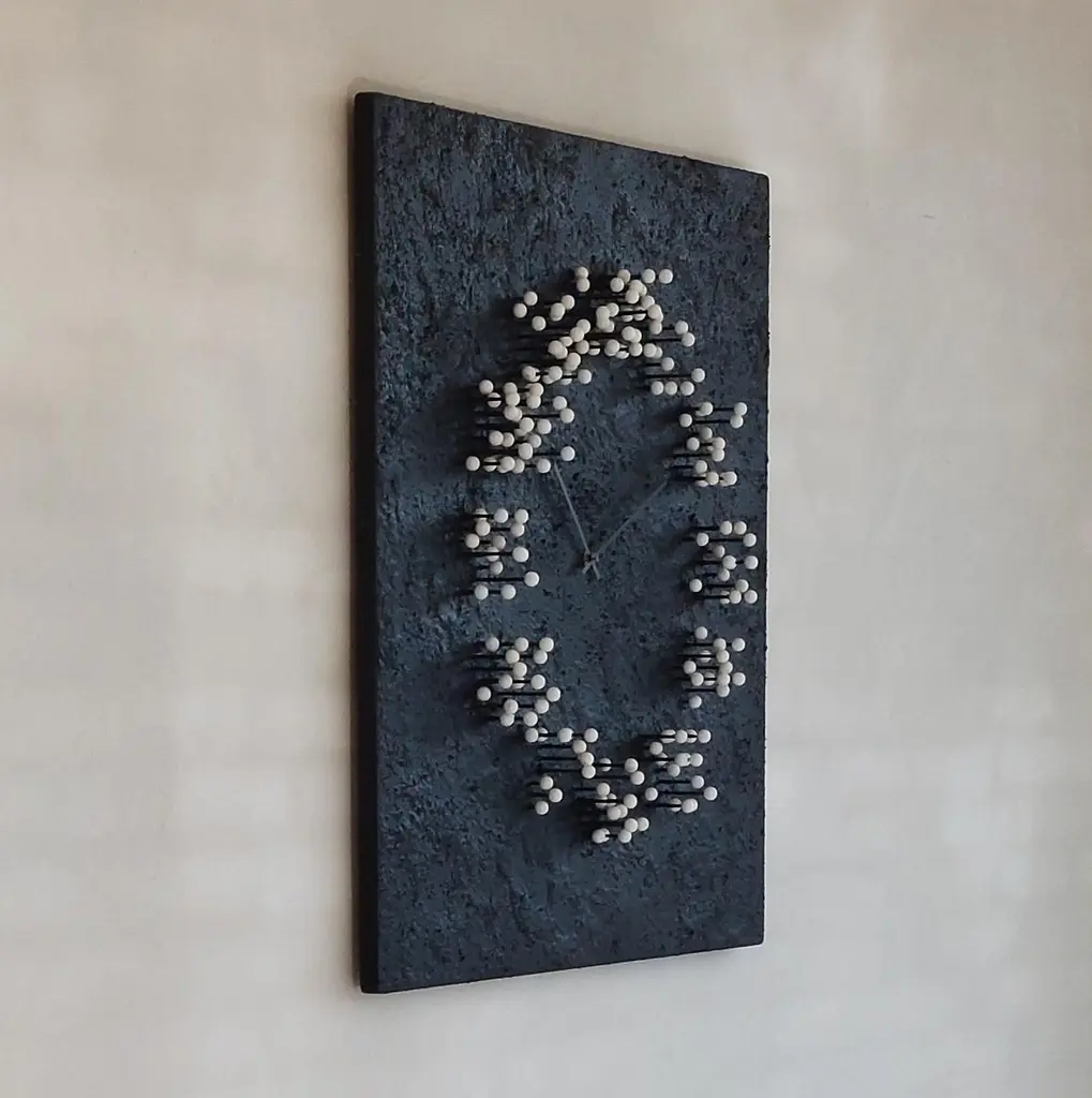 Mocap (moonwalk)Illusionistic wall clockDesign: JAN PAUL“Time is an illusion”Most wall-clocks have the same basic shape: round. Also the same looking time-indication by numbers or stripes.“MOCAP” steps away from the basic. It’s appearance leans more to a piece of conceptual art ,then to a basic time-telling clock. When you stand in front of the clock: the numbers are clear and visible. When you walk around it: numbers slowly seem to dissolve, and appear to fall apart in little floating white balls.This optical illusion results in a striking and intriguing piece. Inspired by “MOTION CAPTURE” technique used in the movie-industry.The Mocap “Moon” version is coated with a self developed structured black surface. This surface will absorb the light and make the white balls even more contrasting with the surface. Enhancing the visual effect. The texture also gives the design a “walking on the moon” atmosphere.Status: Unlimited edition , signed and numbered by maker. material: composite / wood / metaldimensions:Height: 75 cm. / 29,5 inch width: 75 cm./ 29,5 inch depth: 10 cm./ 4 inch color: Clock-face finished in matted black, causing the bright white balls to seemingly float in mid-air.-Clock-hands finished in anthracite so they are subtle visible. against the matted black background.Product weight: 7 kg. / 14,5 lb