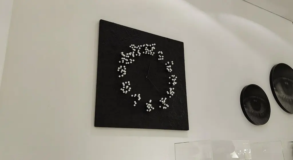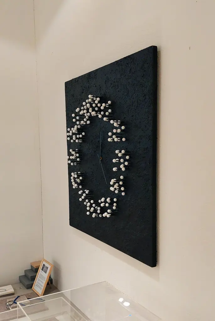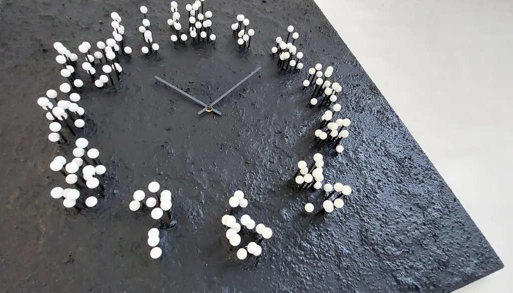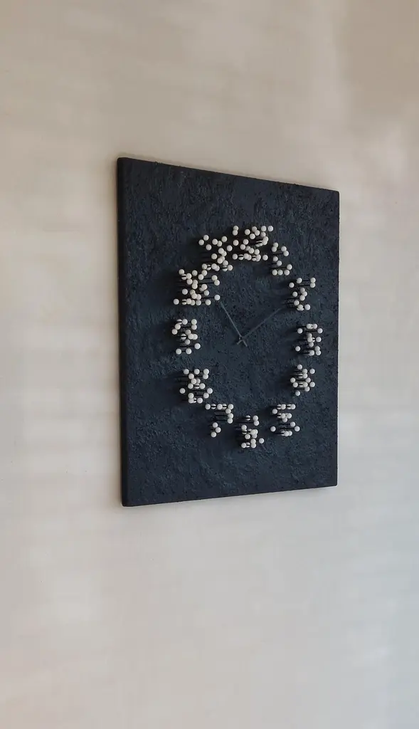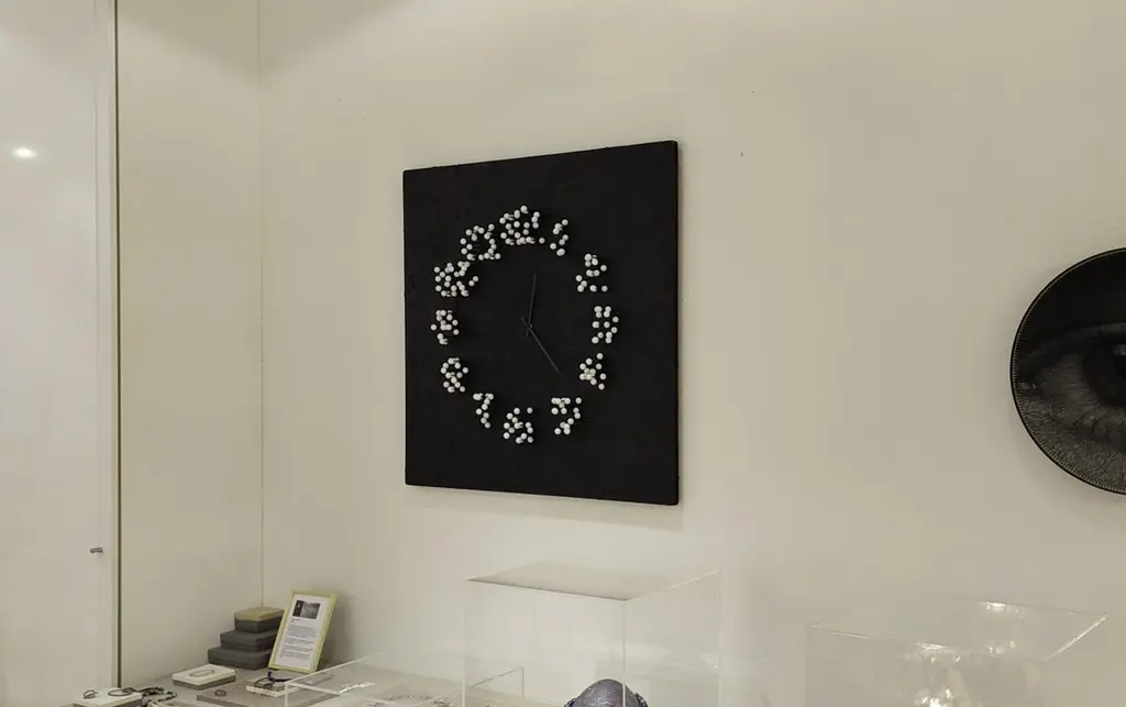 Mocap (moonwalk)Illusionistic wall clockDesign: JAN PAUL“Time is an illusion”Most wall-clocks have the same basic shape: round. Also the same looking time-indication by numbers or stripes.“MOCAP” steps away from the basic. It’s appearance leans more to a piece of conceptual art ,then to a basic time-telling clock. When you stand in front of the clock: the numbers are clear and visible. When you walk around it: numbers slowly seem to dissolve, and appear to fall apart in little floating white balls.This optical illusion results in a striking and intriguing piece. Inspired by “MOTION CAPTURE” technique used in the movie-industry.The Mocap “Moon” version is coated with a self developed structured black surface. This surface will absorb the light and make the white balls even more contrasting with the surface. Enhancing the visual effect. The texture also gives the design a “walking on the moon” atmosphere.Status: Unlimited edition , signed and numbered by maker. material: composite / wood / metaldimensions:Height: 75 cm. / 29,5 inch width: 75 cm./ 29,5 inch depth: 10 cm./ 4 inch color: Clock-face finished in matted black, causing the bright white balls to seemingly float in mid-air.-Clock-hands finished in anthracite so they are subtle visible. against the matted black background.Product weight: 7 kg. / 14,5 lb
