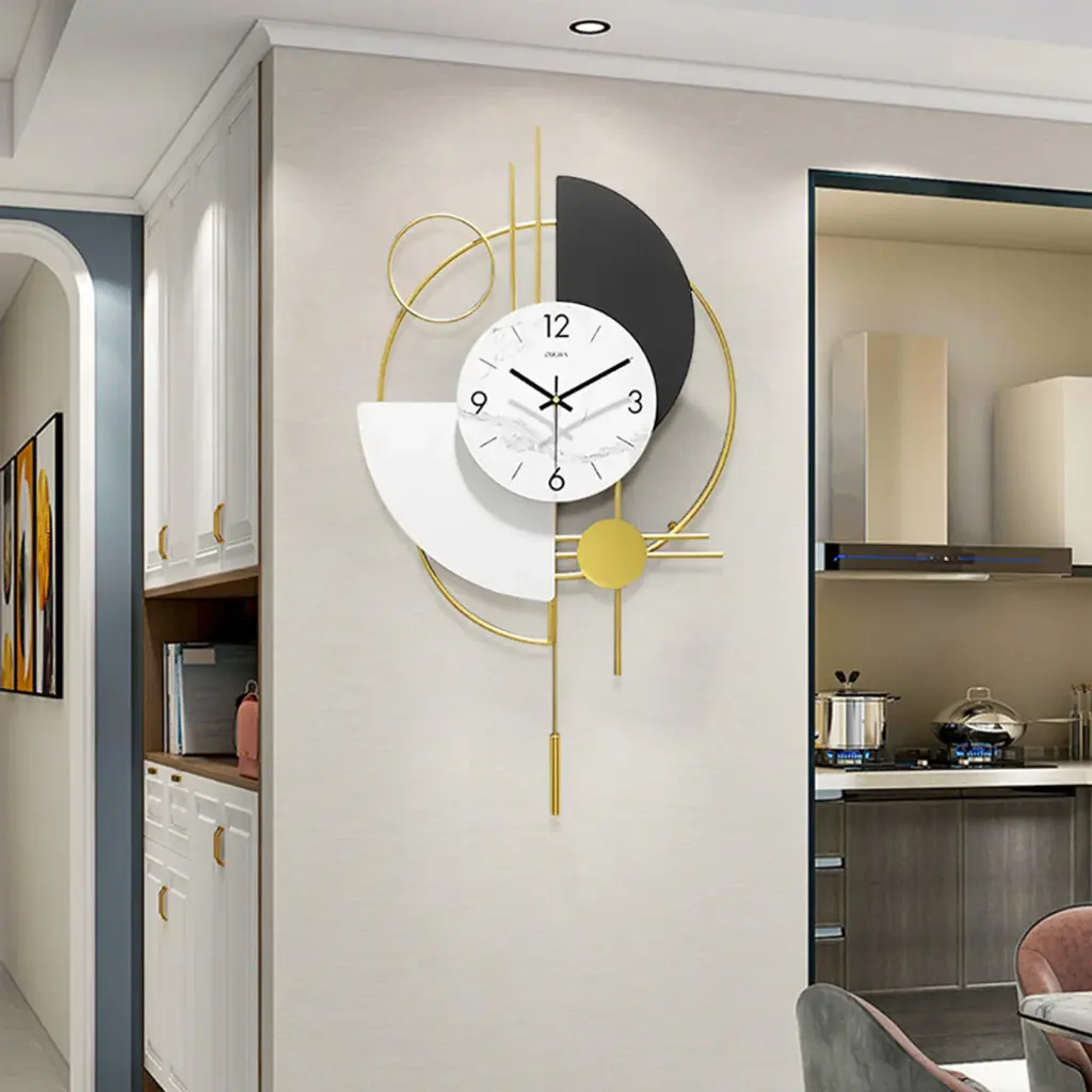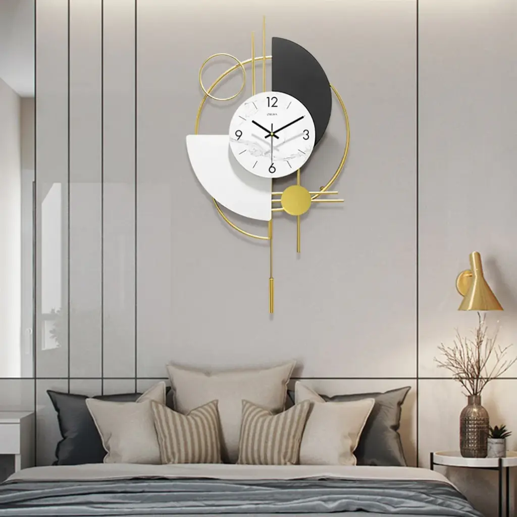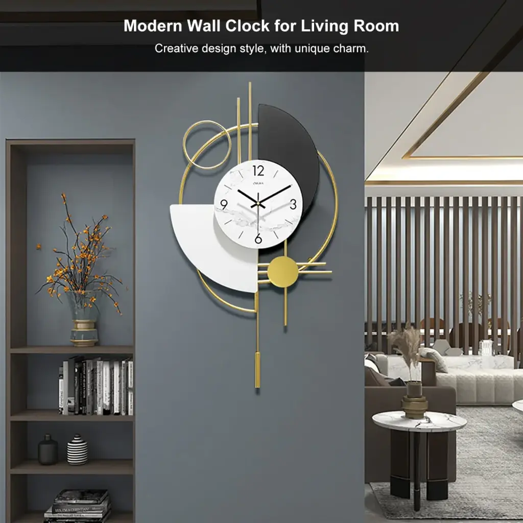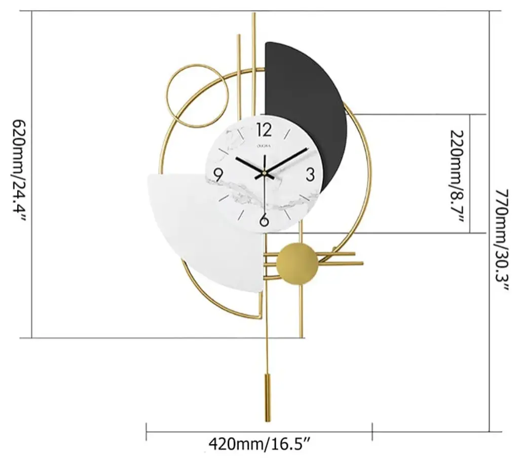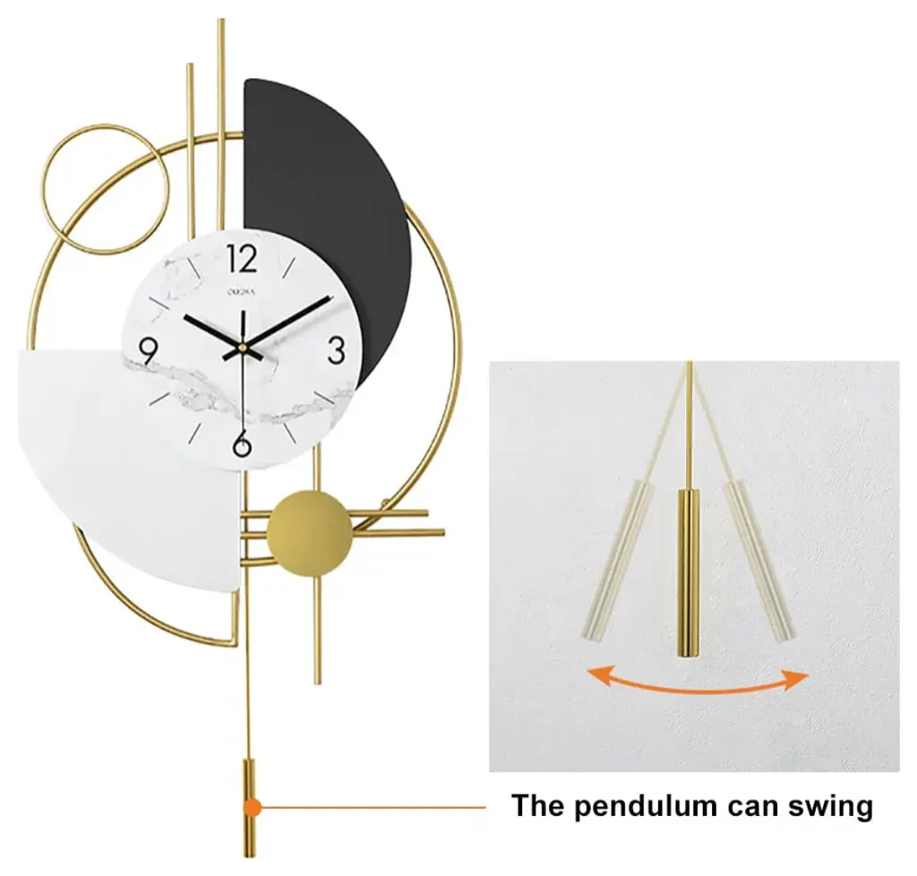 ã€?Exquisite Appearance】This wall clock has a modern and exquisite appearance design, which can match various interior decoration styles such as living room, bedroom, dining room, bathroom, study room or entrance. Not only is it a modern wall clock, it''s also the perfect addition to a blank wallã€?Premium Material】 This big wall clock is made of high-quality metal material, so it has high durability and long lifeã€?Quiet Operation】 This large digital wall clock uses high-quality movement to ensure no noise when running, enjoy a quiet environment while sleeping, studying, and workingã€?Accurate Time】 This unique wall clock usually uses a precise clock mechanism to tell the time accurately. You can depend on them to schedule events, meetings or other everyday tasks on timeã€?Easy Installation】 It is easy to install and can be easily hung on the wall or other suitable space.After installing the battery, pls manually give the pendulum a force to make it swing left and right, and then the pendulum will generate a magnetic pole so that it will continue to swing.ã€?Warm Reminder】Pls adjust the vertical direction of the hook to avoid friction between the pendulum and other parts of the clock shelf, otherwise it will waste electricity and reduce the swing time.• In a word, this metal silent wall clock is not only a high-quality and practical wall clock, but also a beautiful and exquisite decoration, I believe it will give you a perfect use experience.• After installing the battery, pls manually give the pendulum a force to make it swing left and right, and then the pendulum will generate a magnetic pole so that it will continue to swing. Warmly remind that, pls adjust the vertical direction of the hook to avoid friction between the pendulum and other parts of the clock shelf, otherwise it will waste electricity and reduce the swing time.Specification- Size: 16.5"W x 30.3"H- Style: Modern- Shape: Round- Material: Metal- Product Type: Wall Clock- Operating Mechanism: Quartz Movement / Crystal- Silent/Non-Ticking: Yes- Batteries Required: Yes- Battery Type: AA- Number Of Batteries Needed: 1- Batteries Included: No- Assembly Required: No- Warranty: 1 Year Limited