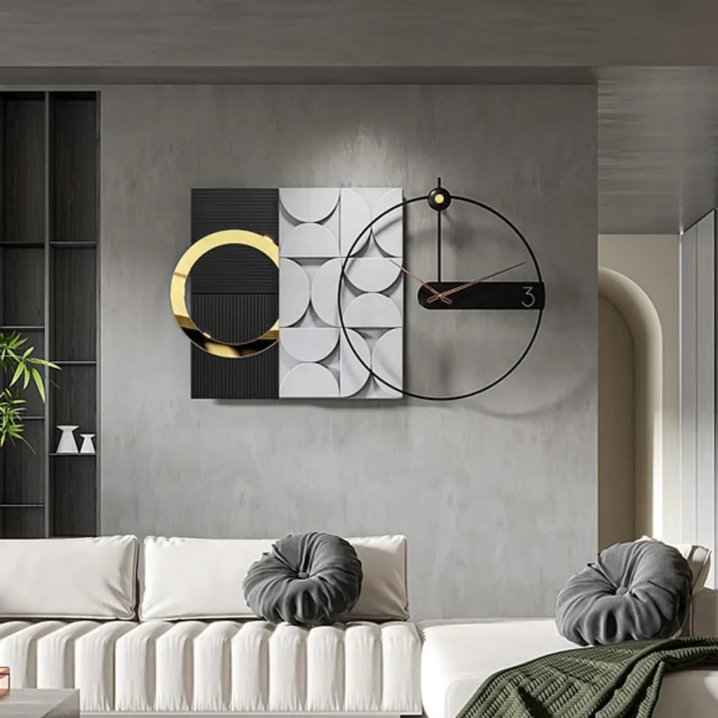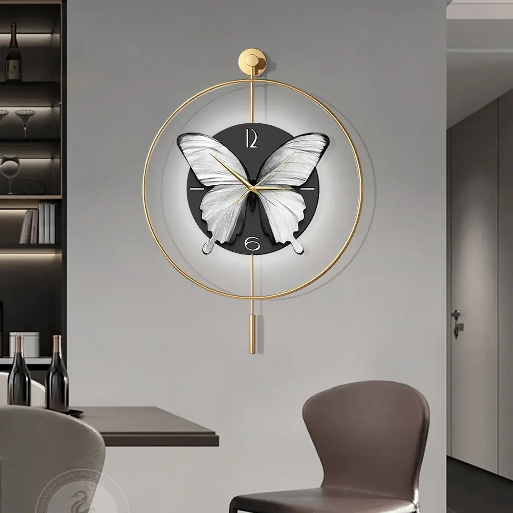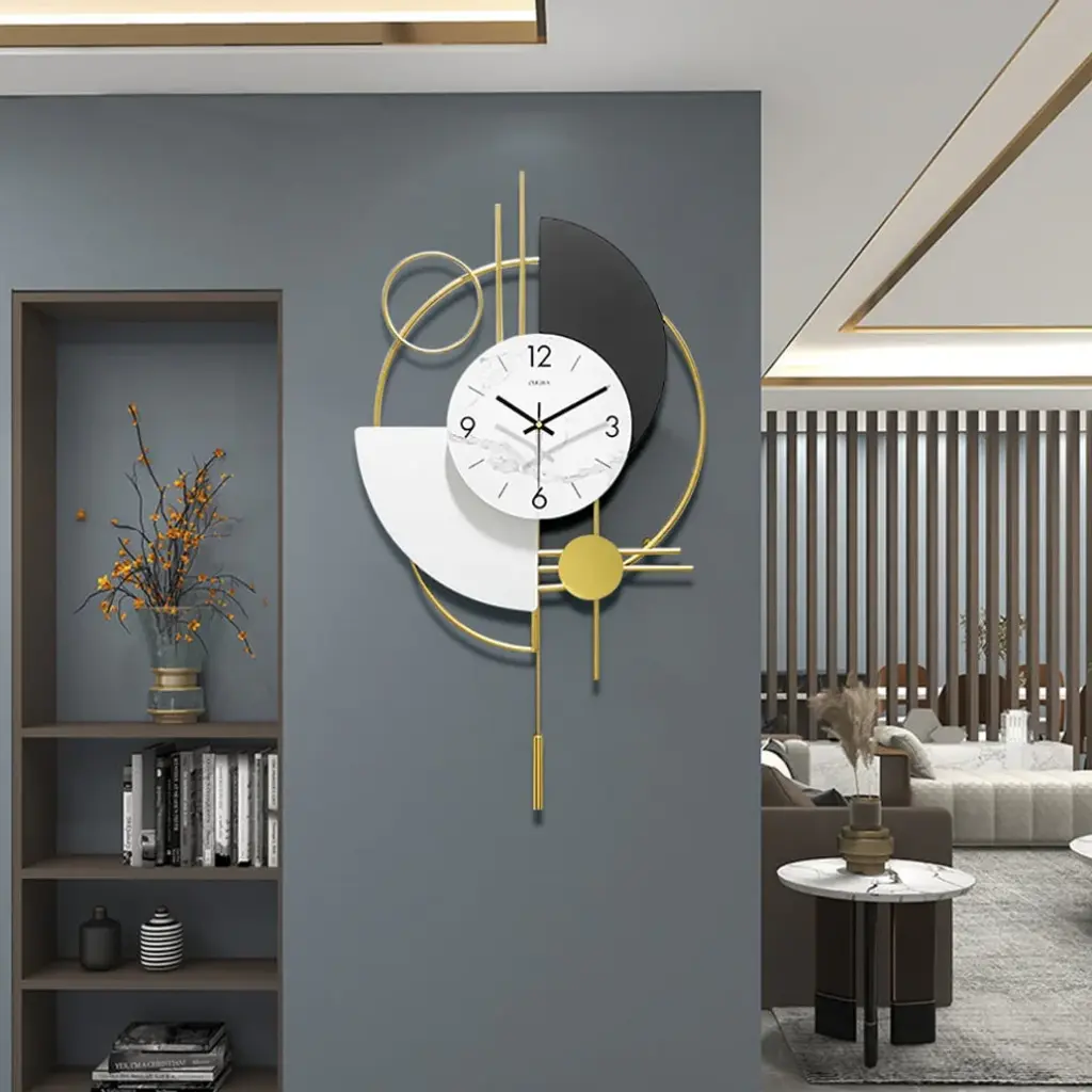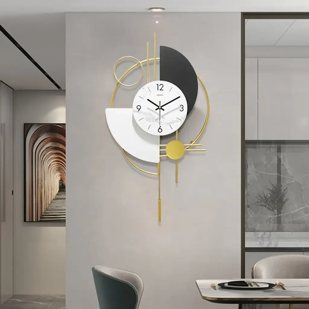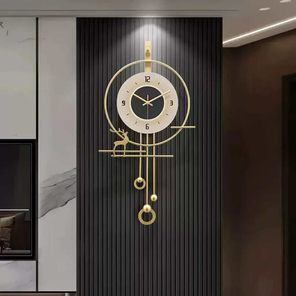 ã€?Exquisite Appearance】This wall clock has a modern and exquisite appearance design, which can match various interior decoration styles such as living room, bedroom, dining room, bathroom, study room or entrance. Not only is it a modern wall clock, it''s also the perfect addition to a blank wallã€?Premium Material】 This big wall clock is made of high-quality metal material, so it has high durability and long lifeã€?Quiet Operation】 This large digital wall clock uses high-quality movement to ensure no noise when running, enjoy a quiet environment while sleeping, studying, and workingã€?Accurate Time】 This unique wall clock usually uses a precise clock mechanism to tell the time accurately. You can depend on them to schedule events, meetings or other everyday tasks on timeã€?Easy Installation】 It is easy to install and can be easily hung on the wall or other suitable space.After installing the battery, pls manually give the pendulum a force to make it swing left and right, and then the pendulum will generate a magnetic pole so that it will continue to swing.ã€?Warm Reminder】Pls adjust the vertical direction of the hook to avoid friction between the pendulum and other parts of the clock shelf, otherwise it will waste electricity and reduce the swing time.• In a word, this metal silent wall clock is not only a high-quality and practical wall clock, but also a beautiful and exquisite decoration, I believe it will give you a perfect use experience.• After installing the battery, pls manually give the pendulum a force to make it swing left and right, and then the pendulum will generate a magnetic pole so that it will continue to swing. Warmly remind that, pls adjust the vertical direction of the hook to avoid friction between the pendulum and other parts of the clock shelf, otherwise it will waste electricity and reduce the swing time.Specification- Size: 16.5"W x 30.3"H- Style: Modern- Shape: Round- Material: Metal- Product Type: Wall Clock- Operating Mechanism: Quartz Movement / Crystal- Silent/Non-Ticking: Yes- Batteries Required: Yes- Battery Type: AA- Number Of Batteries Needed: 1- Batteries Included: No- Assembly Required: No- Warranty: 1 Year Limited