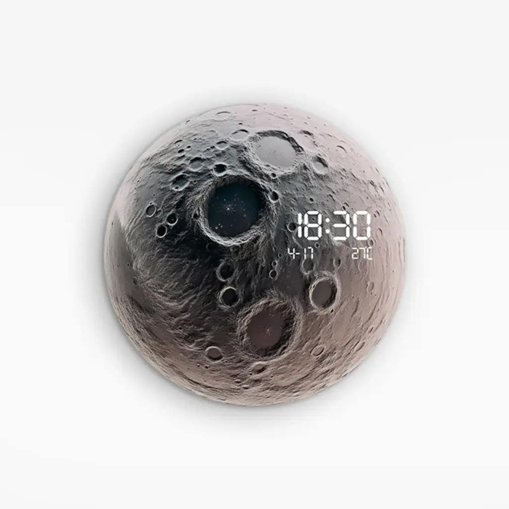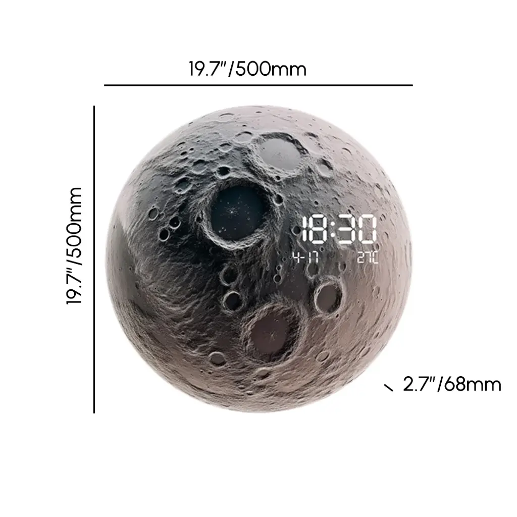 Inspired by the beauty of the moon, this unique wall clock combines artistic design with modern functionality. The moon-shaped clock features a realistic meteorite surface texture, adding a touch of outer space to your home decor. Integrated LED lighting creates a soft glow around the clock, making it a stunning piece day or night.