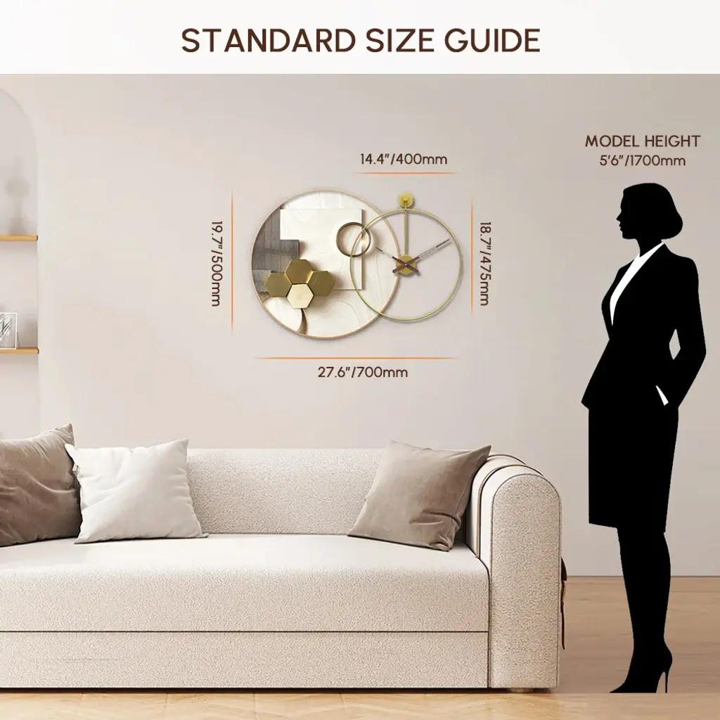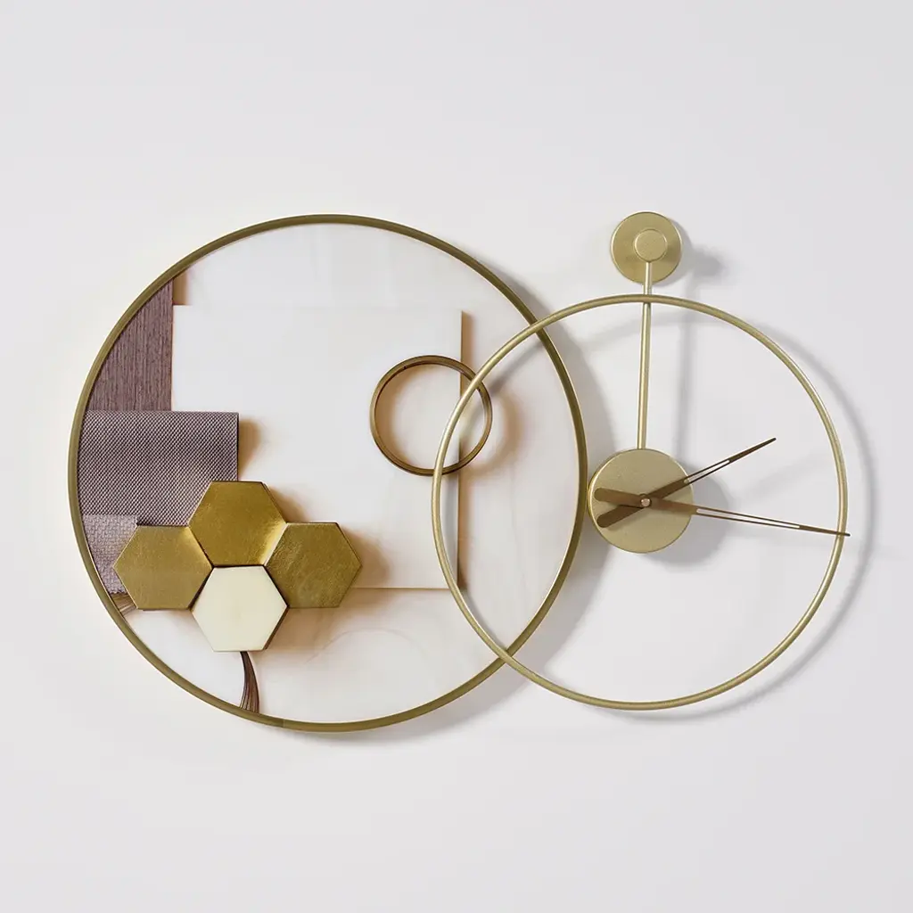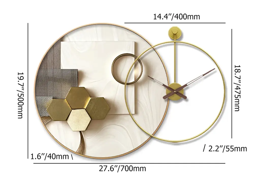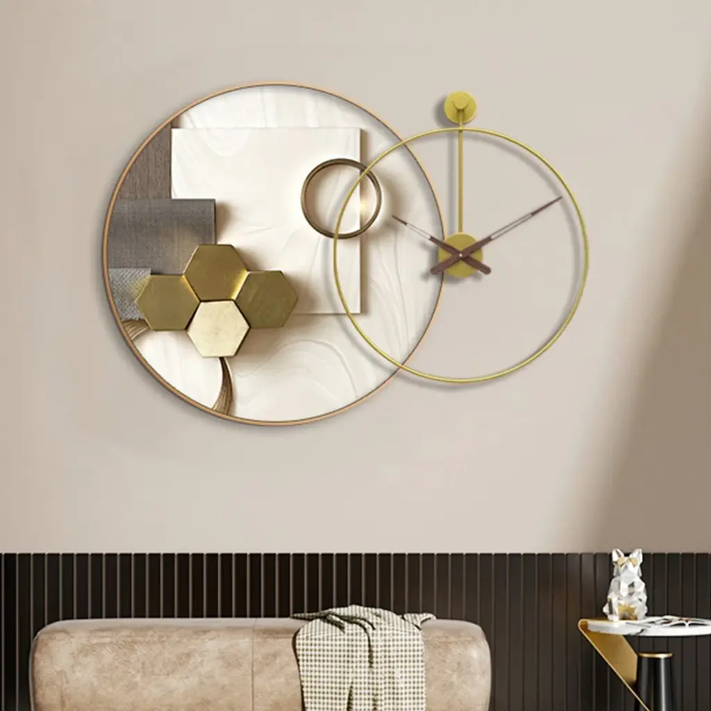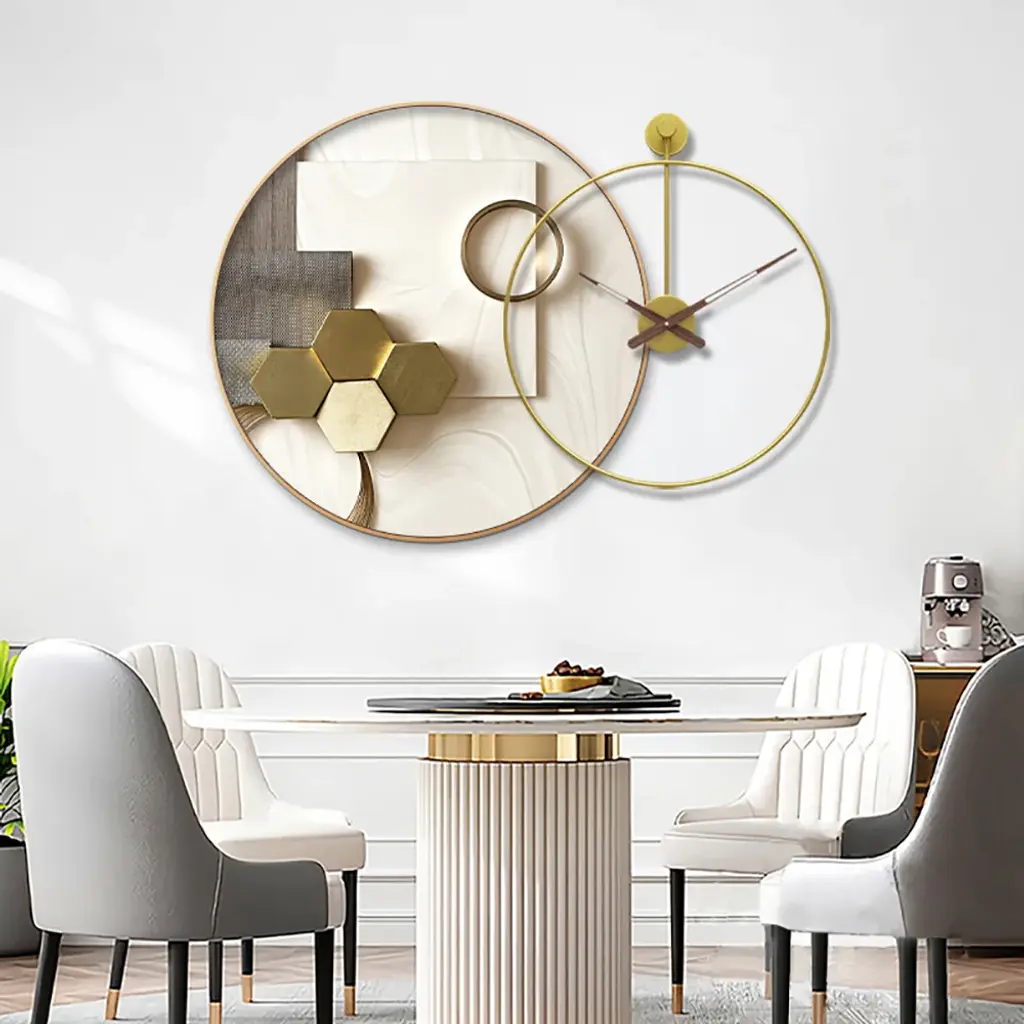 This modern and stylish wall clock is composed of two circles, the big circle is a canvas art painting, and the small circle is a wall clock, with a golden aluminum alloy frame, the combination is very elegant, artistic, beautiful and practical. It is suitable for decorating any room in your home.