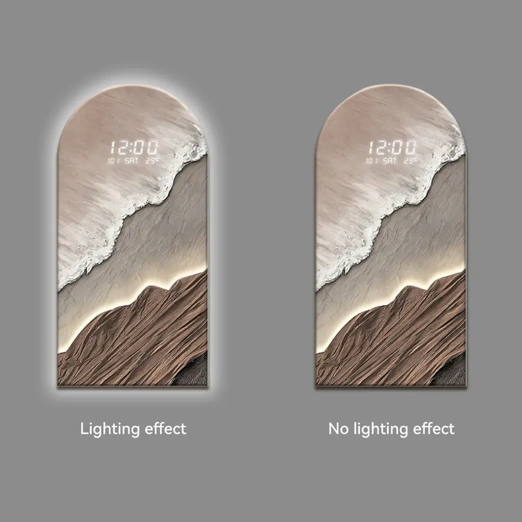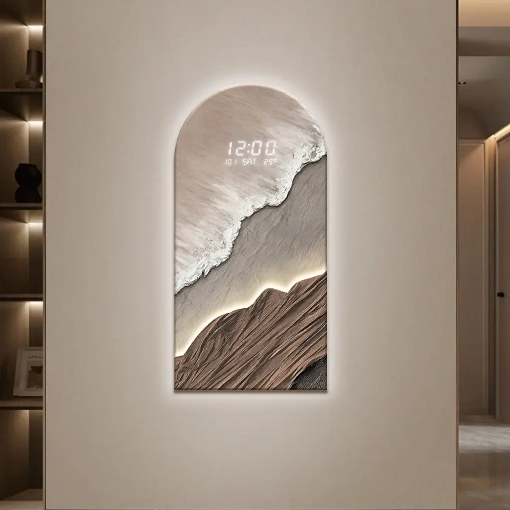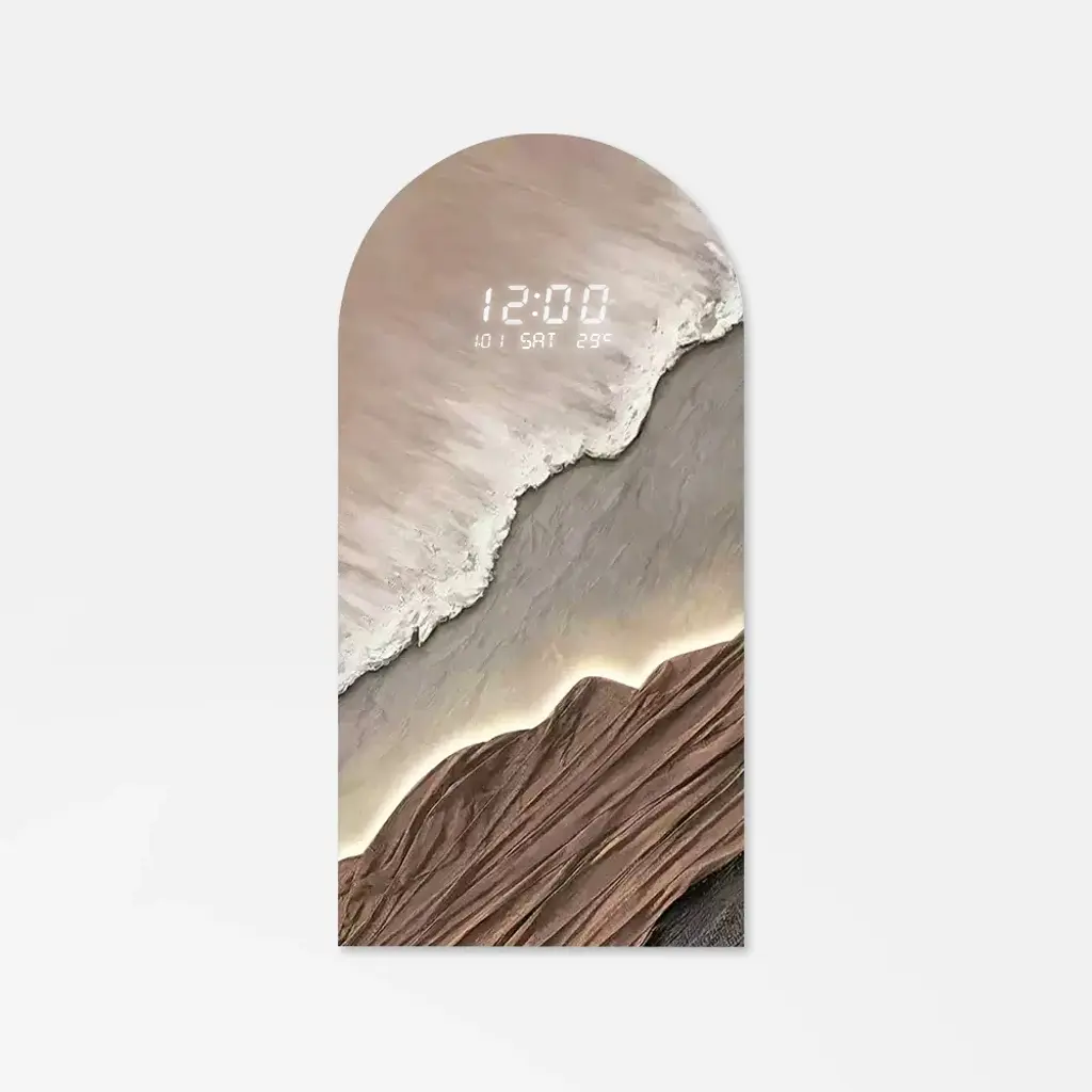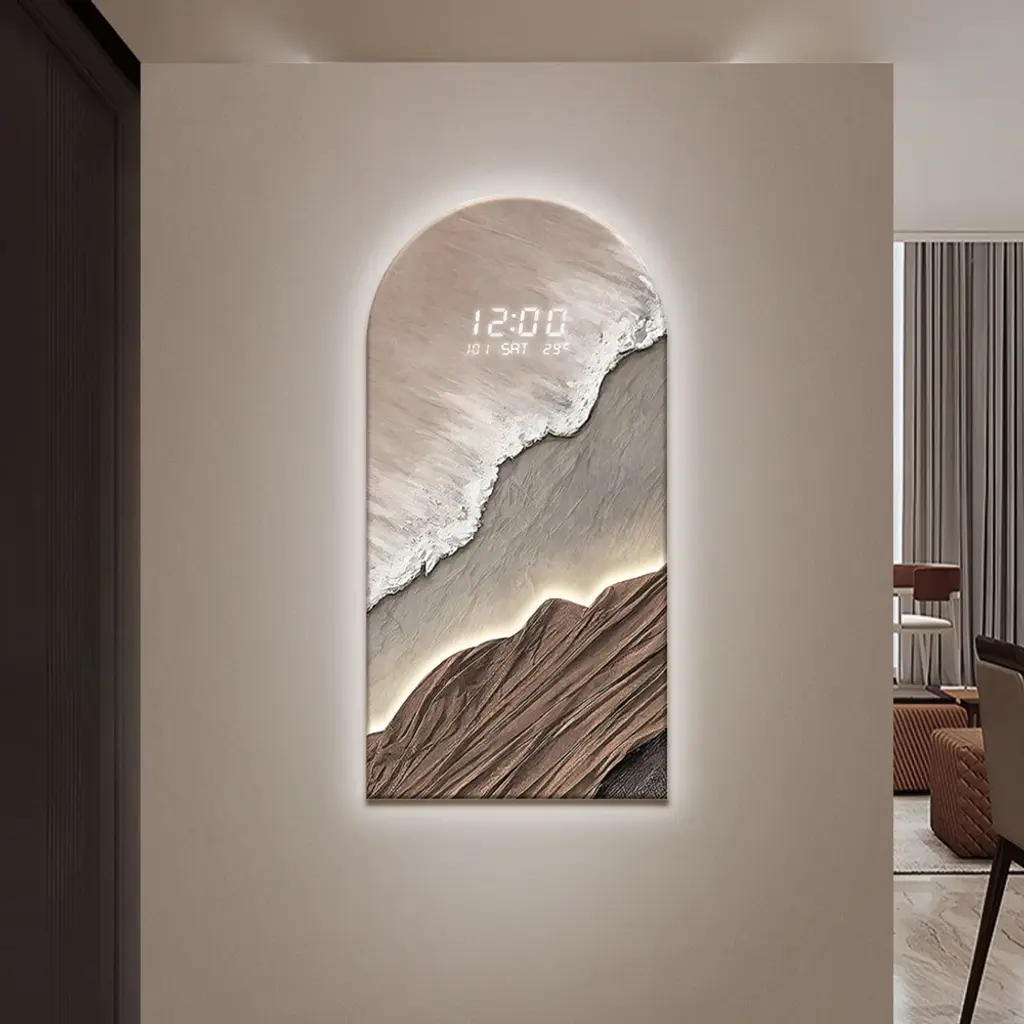 This elegant wall clock merges functionality with art, featuring a digital clock display set against a textured, nature-inspired backdrop. Its minimalist design with LED backlighting adds a soft, ambient glow, perfect for enhancing any modern interior. This piece combines time-telling practicality with an artistic touch, making it a stunning addition to any space.