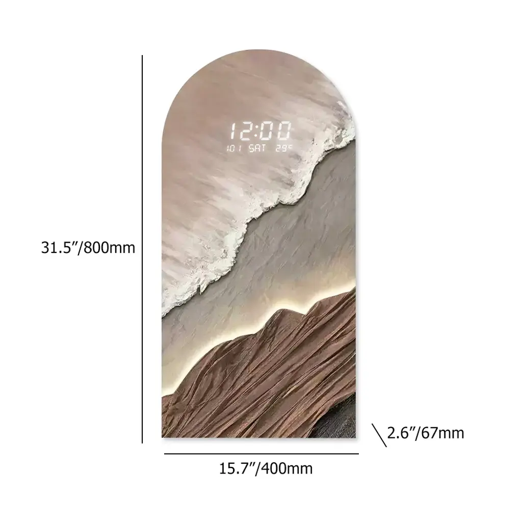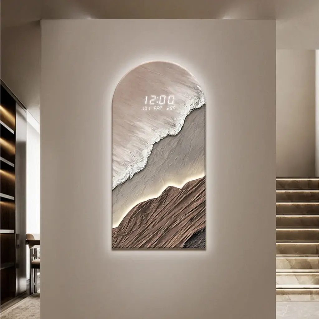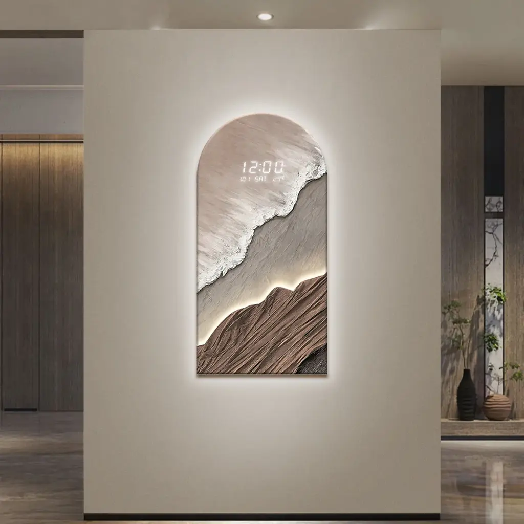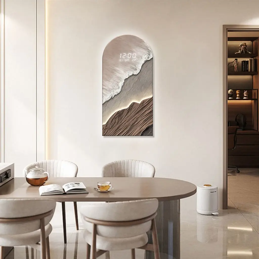 This elegant wall clock merges functionality with art, featuring a digital clock display set against a textured, nature-inspired backdrop. Its minimalist design with LED backlighting adds a soft, ambient glow, perfect for enhancing any modern interior. This piece combines time-telling practicality with an artistic touch, making it a stunning addition to any space.