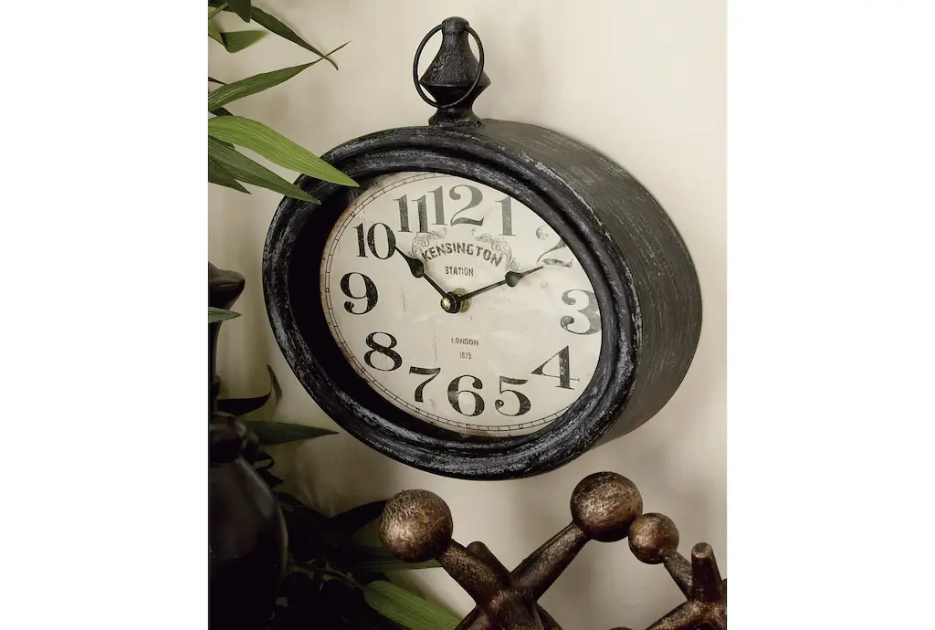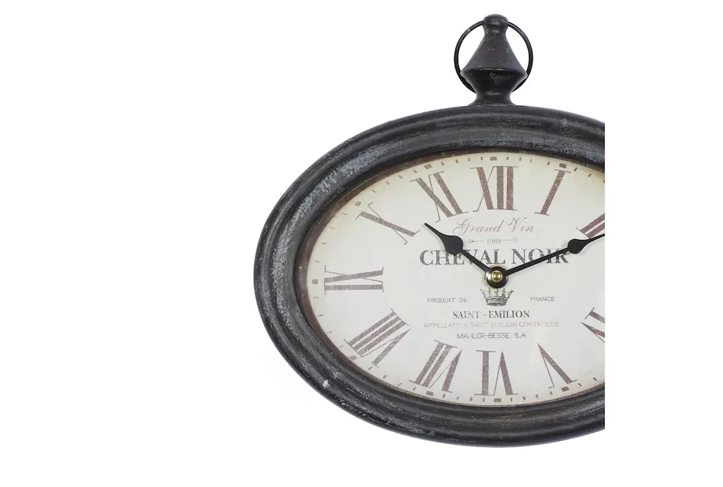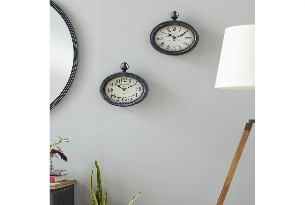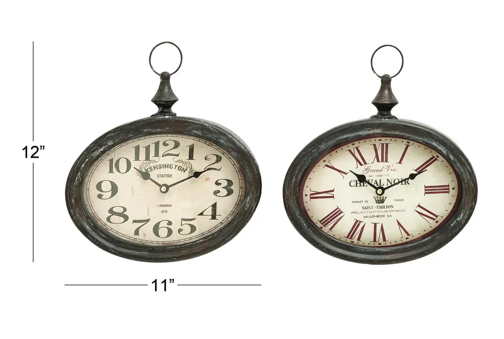 The vintage design of this home decor brings a sense of the past to your home.. Requires 1 AA battery each. Batteries not included. This item ships in 1 carton. Features Arabic numerals and Roman numerals for the hour markers. The clock mechanism runs silent. Iron wall clock makes a great gift for any occasion. Can be hung vertically using the keyholes on the back; nails and screws not included. Suitable for indoor use only. This item ships fully assembled in one piece. This cream colored kitchen clock comes as a set of 2. Vintage style. Clock face with text "Kensington" and "Cheval Noir".