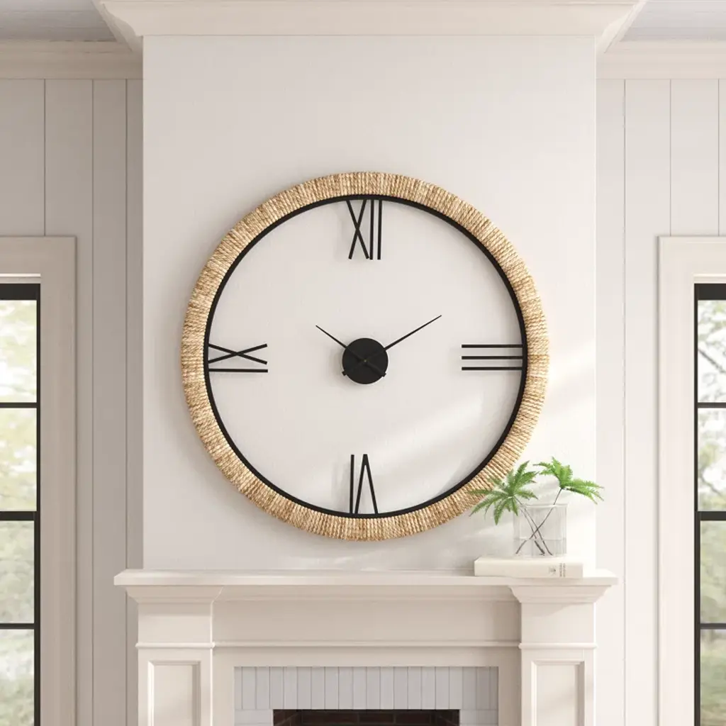 Contemporary with a touch of coastal style, this oversized wall clock features a braided banana leaf frame accented by an iron inner lip and a floating center dial. Quartz movement ensures accurate timekeeping. Requires one "AA" battery.