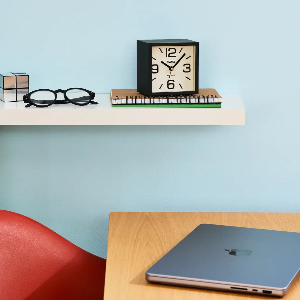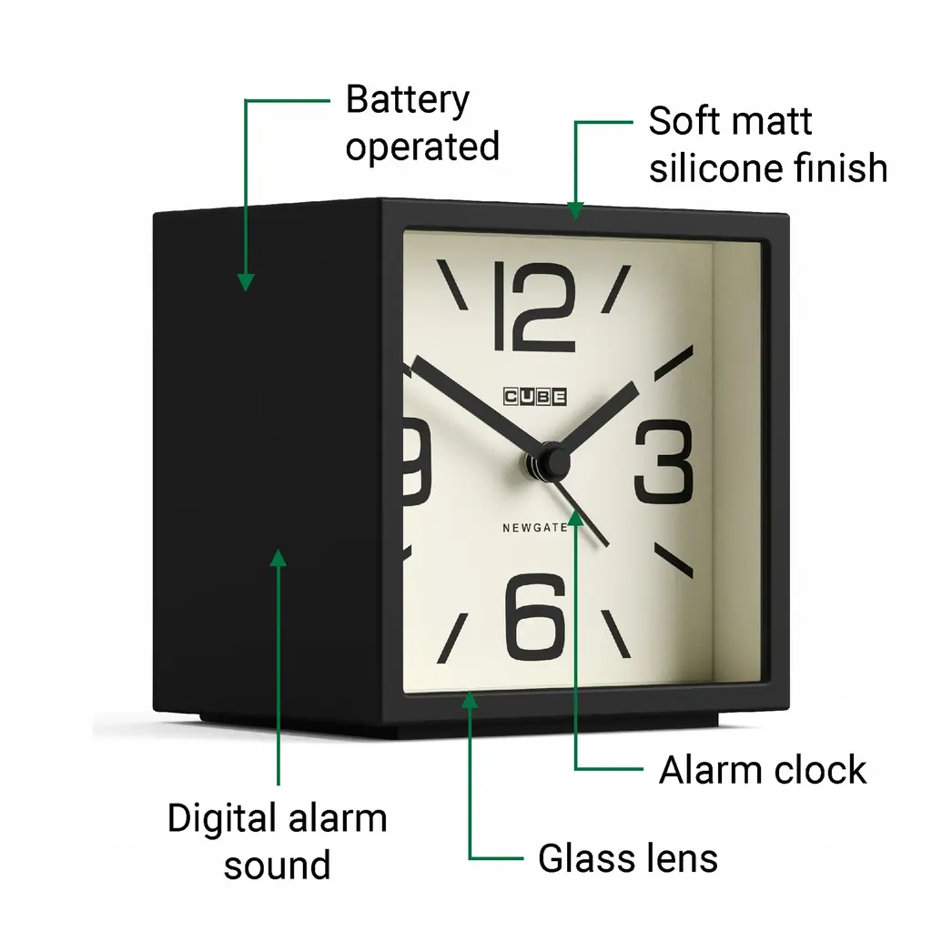 Clean, bold numbers meet an architectural form in this ‘90s icon. Keep a perfect cube of time by your bedside with this mini version of the iconic Cube wall clock last produced in the 1990s and designed by Newgate founder Jim Read. Its architectural form and classic dial put a bold new face on the basic alarm clock, creating the perfect marriage of form and function. Features of the Newgate Cube Alarm Clock include: Accurate and reliable quartz silent sweep movement. Clean bold numbers. Architectural form. Clean only with a soft dry cloth. Powered by one AA battery (not included). Made from acrylic, glass & metal. Measures 4h x 4w x 3”d.