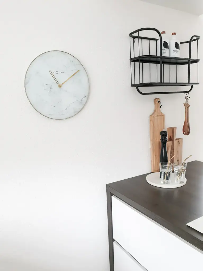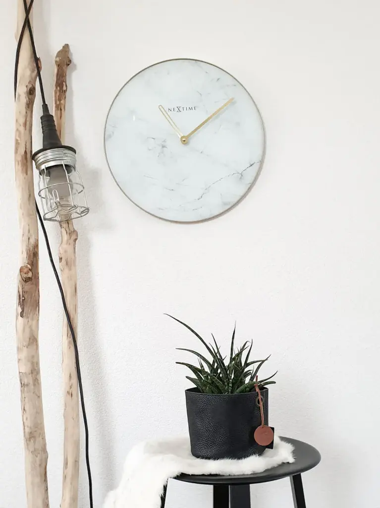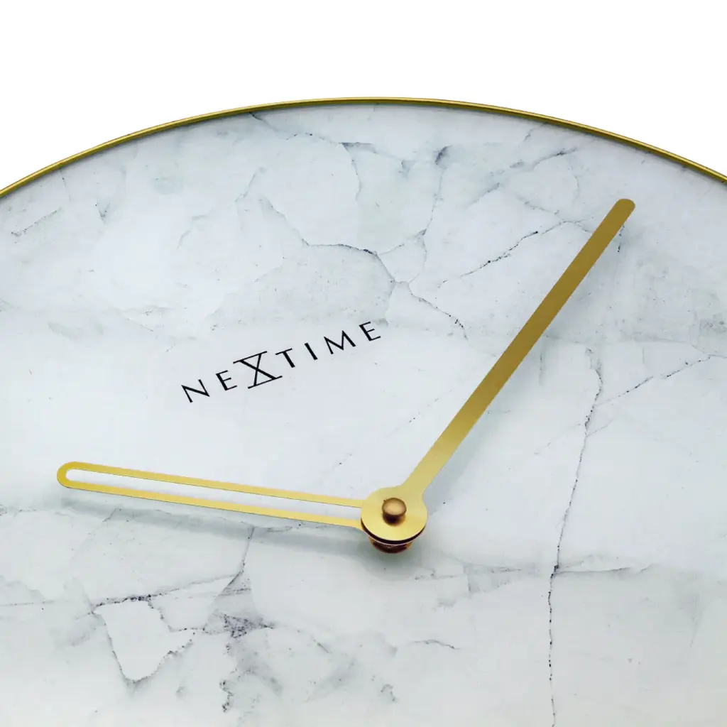 The NeXtime "Marble" is a round wall clock (15.75 inches/ 40 cm) made of glass and metal. The glass with a white marble print , the gold hands and slim metal edge give an elegant and rich look & feel to every living room! This clock is silent and runs on 1x AA battery (not included).