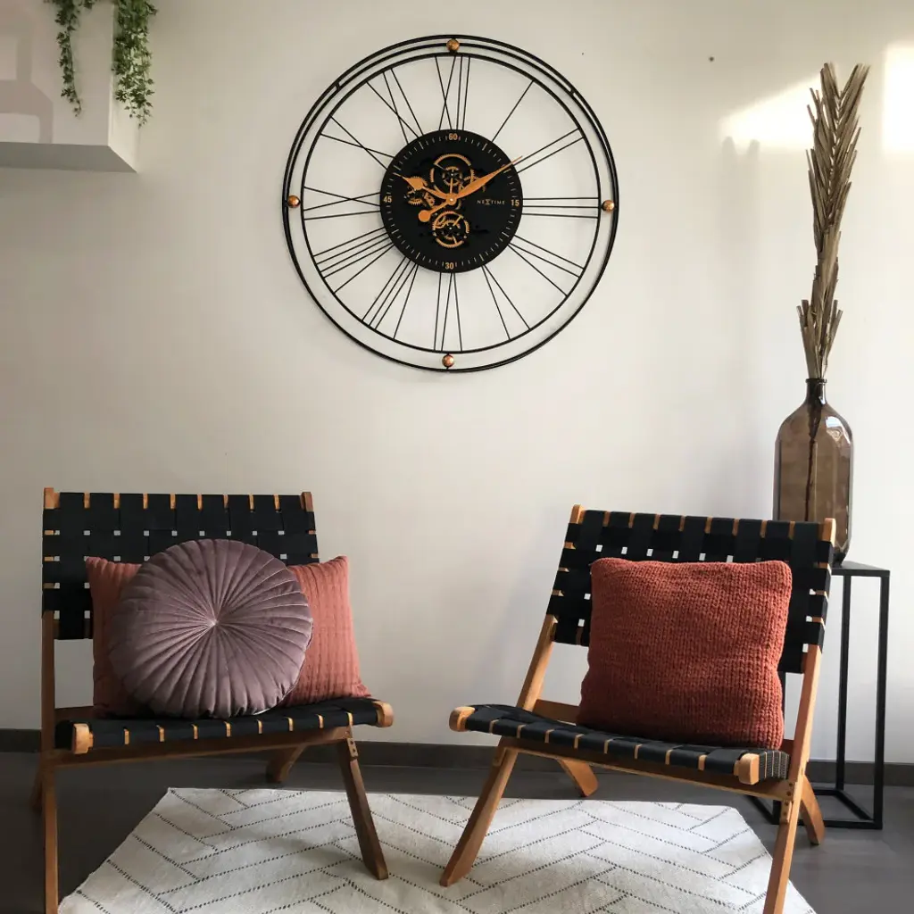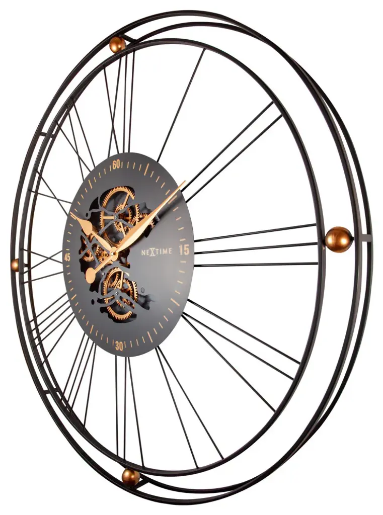 The NeXtime "Roman Gear Clock XXL" oversized 35.7" (90.5cm) black metal gear clock with classic roman numbers brings an industrial style into your home.The moving gears match perfectly with the coloured romantic style hands.This open-faced design is an perfect additon to your room without being overwhelming. This large clock runs on 3x AA battery (not included).