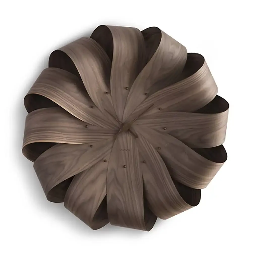 The modern Ciclo wall clock is composed of curved walnut or natural oak leaves that emulate an open flower in all its splendor. For the first time Nomon works with subtly folded natural wood leaves. The silhouette connects us with nature emulating an open flower in all its splendor. Hands in walnut ash oak finish or polished brass.Specifications:Composed of curved walnut or natural oak leavesBody: oak walnut or mixed wood.Hands: Walnut wood or polished brass.Mechanism: German UTSDimensions: ø52cm or ø75cm.