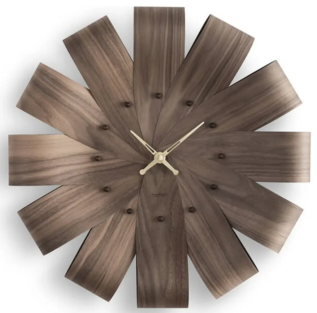 A charming addition to minimalist spaces in need of more natural notes the Ciclo Wall Clock by Nomon stands out. Straight wooden strips bent at their center points create a rounded face creating wedge-shaped gaps between each strip and adding a color contrast to the wooden face. This design choice stylishly highlights the hands and small rounded pips that stand out slightly from the smooth ribbon face to mark the hour creating something truly unforgettable.Specifications:Design/Year: Andres Martinez/2020Using traditional processes this item is handmade with sustainable sourced forested woodItem: W 21.7 in H 21.7 in D 3.15 inUses machinery from GermanyWood and BrassCompliant with RoHS standardsManufactured In: SpainWeight: 1.1Lbs
