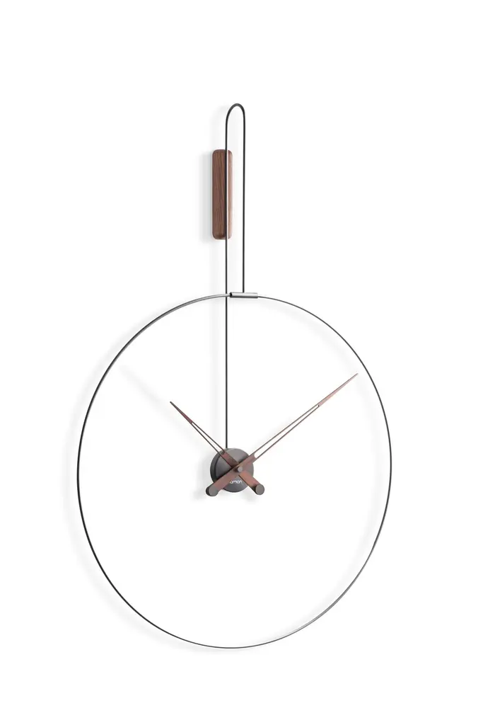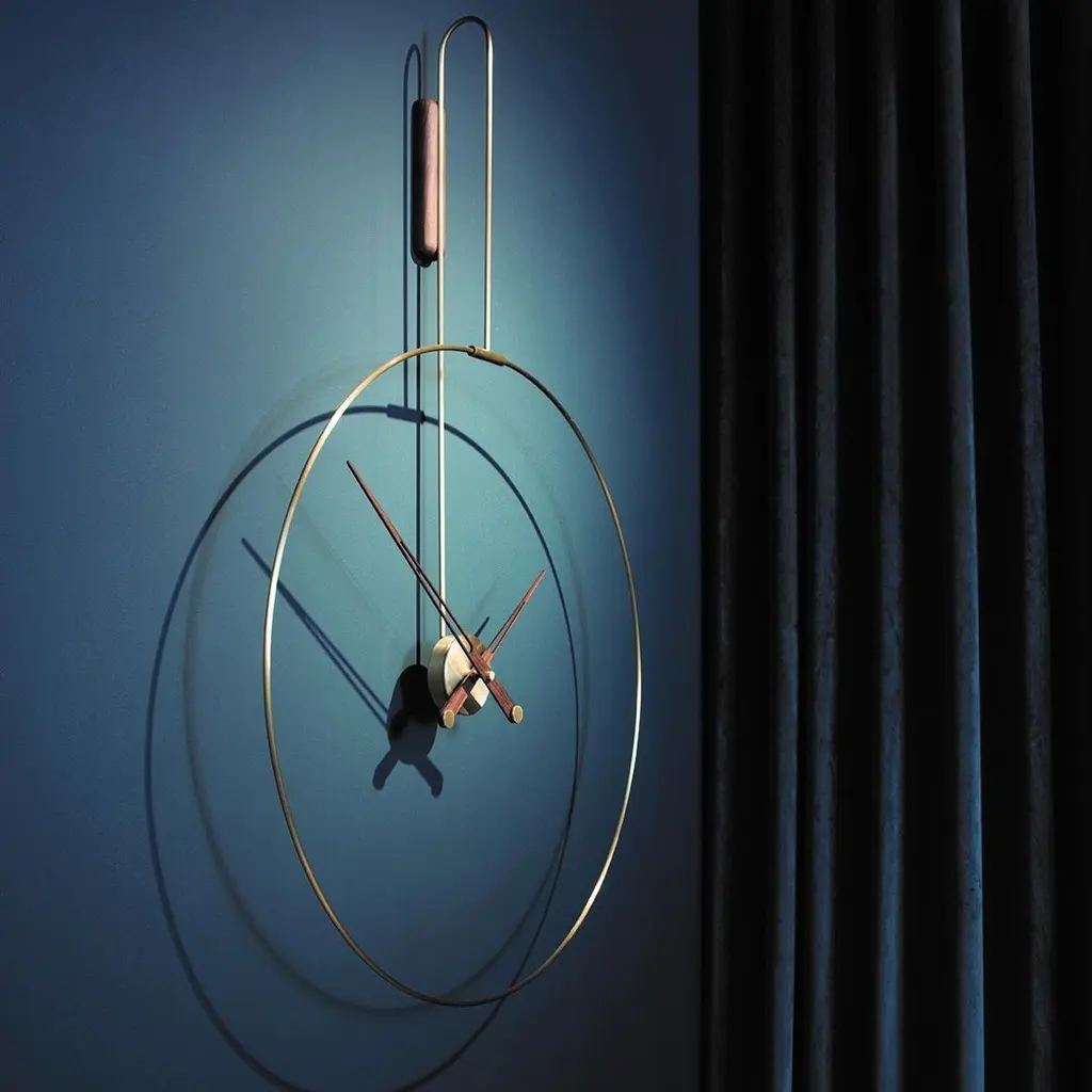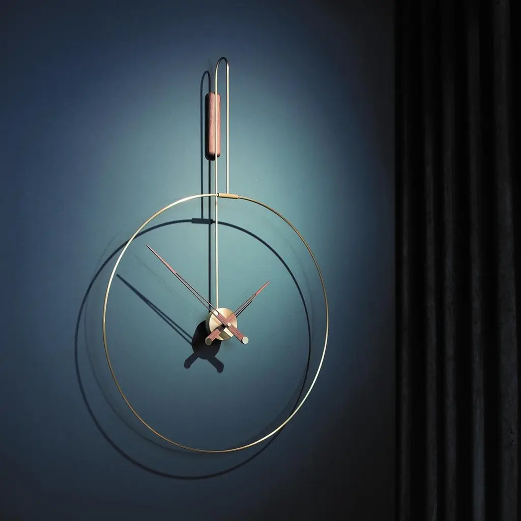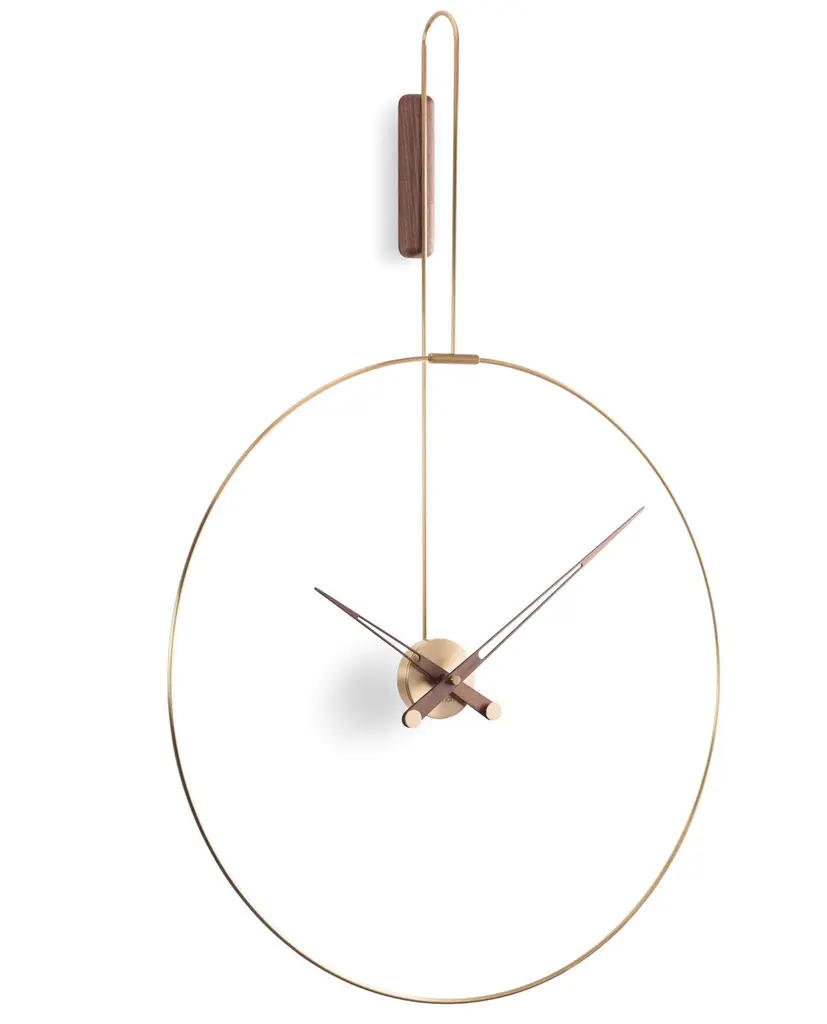 ø70cm clock with a length of 108 cm, characterized by its curved, polished brass elements. Hands in natural walnut wood.Available in Walnut, Brass