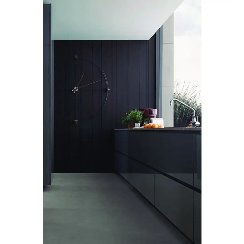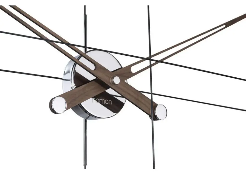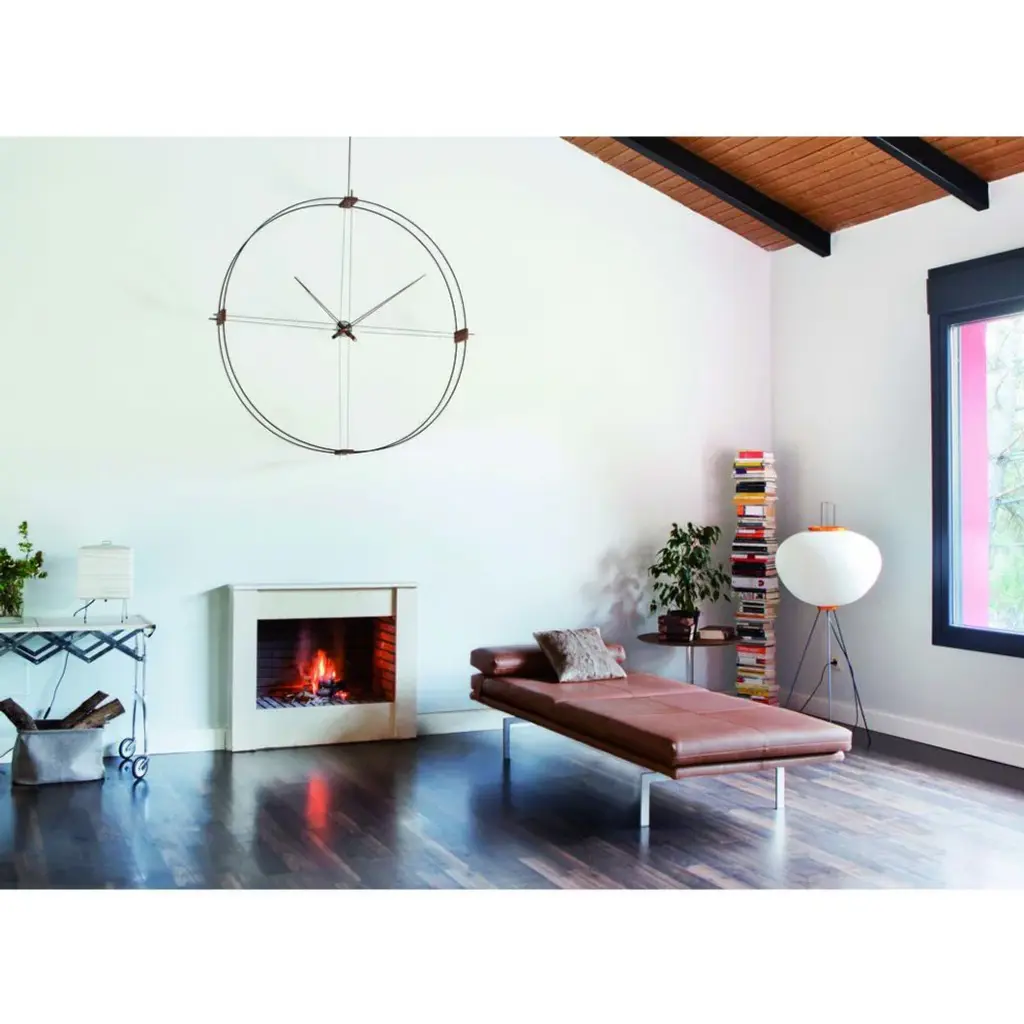 It is one of the most requested designs on the market because it is a wall clock that comes with a double circle support made of white or black fiber. It includes needles made of walnut wood or weng and they are chromed. They can also be hung on the ceiling. It is adjusted by a cross-shaped base that indicates 4 time points. Delmori N by Nomon is a circular design clock with a diameter of 130 and a height of 140 centimeters.Specifications:Dimensions: 130cmSemi-oval clock with double fiber ringsteel mechanism and wooden hands With wall or ceiling supportInstallation: WallRing and needles: White fiberglass Walnut handsMade In Spain
