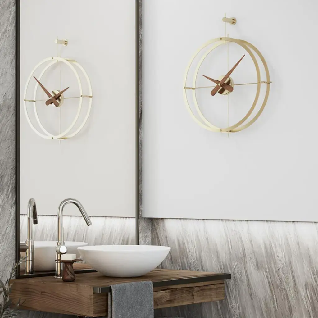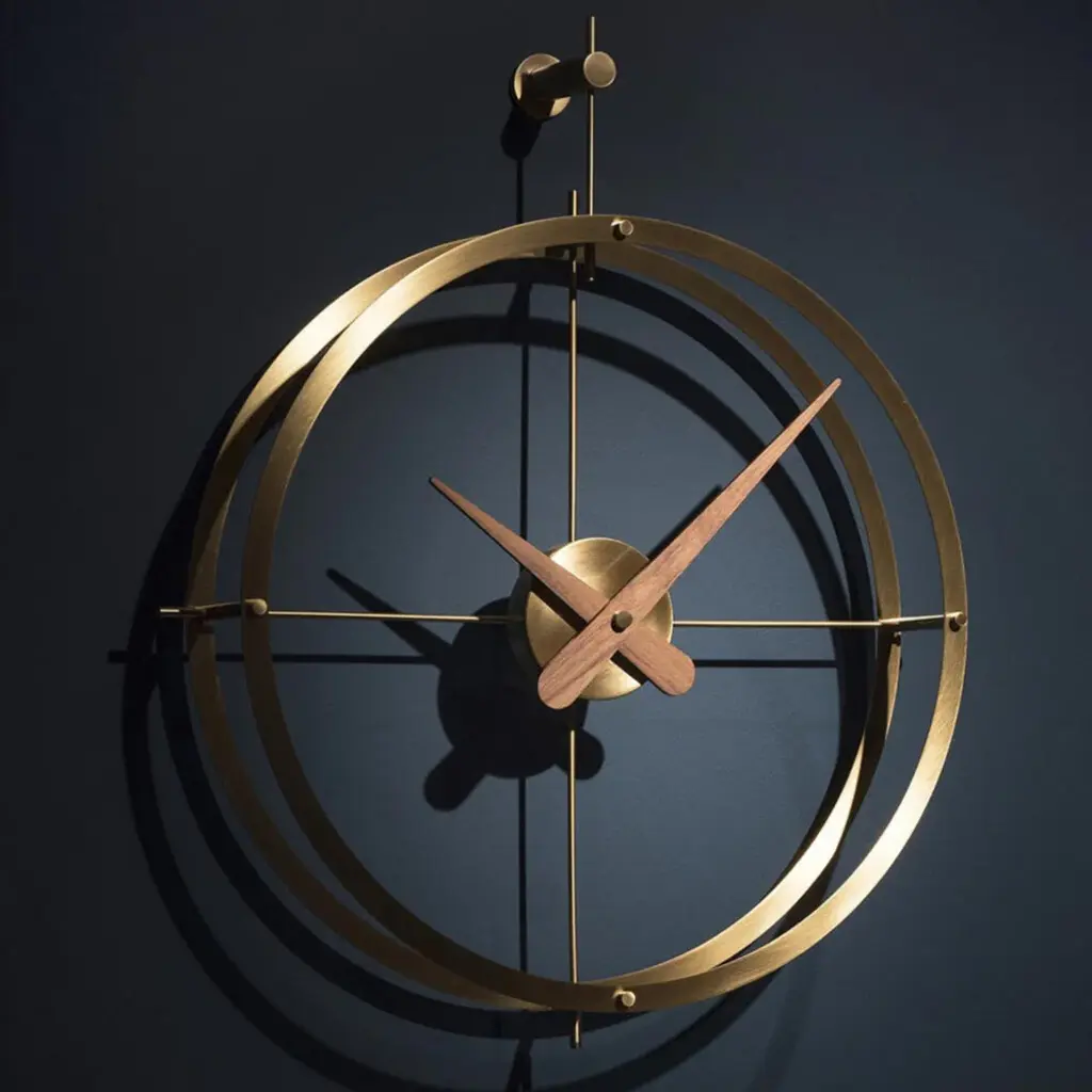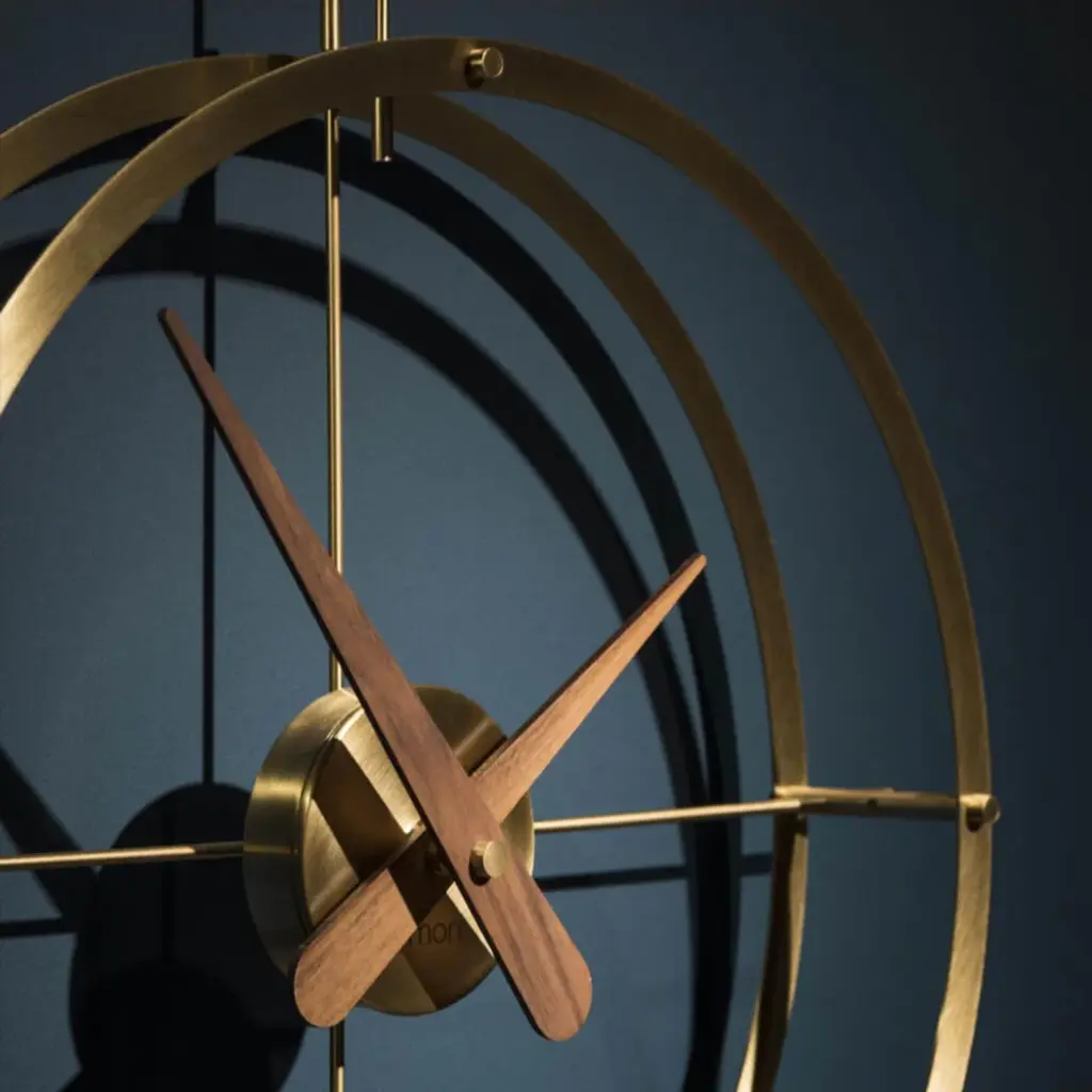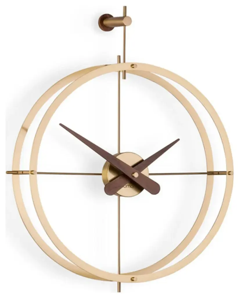 The modern 2 point wall clock is part of one of Nomon''s most iconic collections of clocks. Its design is minimalist and they bring a distinguished character to the room. They are pieces of great visual impact personality and identity.That touch of luxury is only possible when the caress of a hand is involved in the manufacturing process. The clock 2 points NG It is the classic industrial style wall clock made taking care of the smallest detail. It has the machinery case and rods made of polished brass and the hands and rings in walnut finished wood.Specifications:Case: Polished brassShafts: Polished brassNeedles: Wenge finished woodRings: Wenge finished woodMechanism: German UTSDimensions: Ø43x56h cmBox: Walnut woodClock Hands: Black lacquered walnut wood.Ring: Black fiberglass.Collection: Lacquered wood