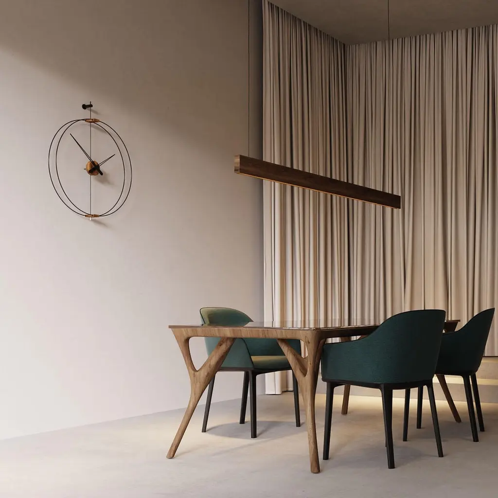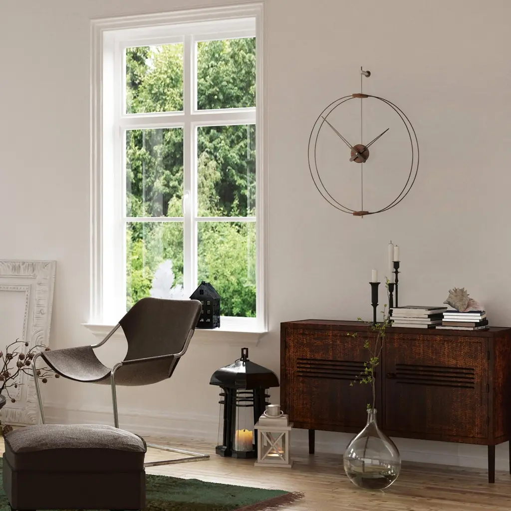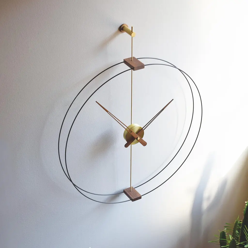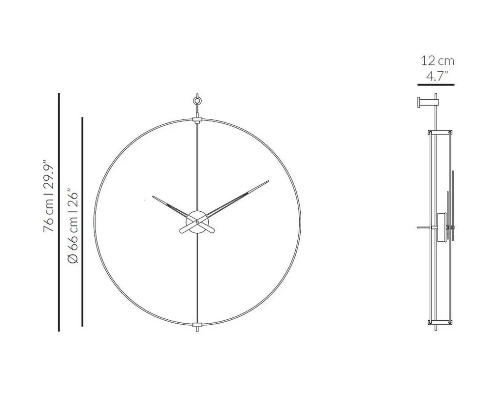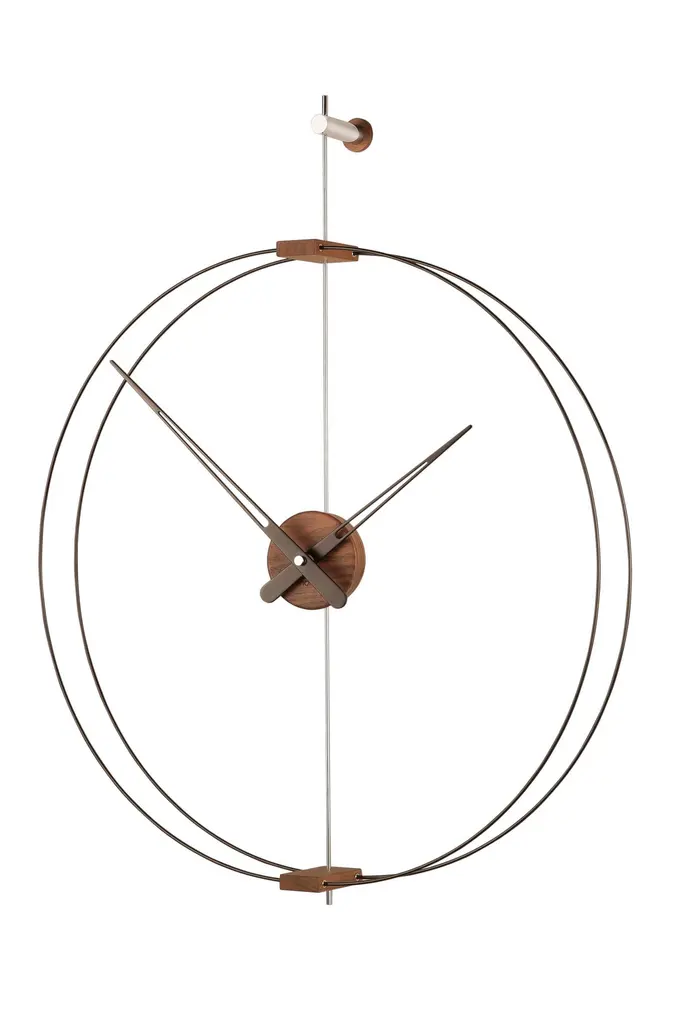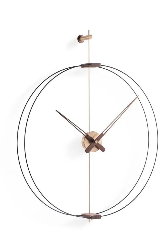 Black glass fiber double-ring wall clock that contains the walnut case and clock hands in the center.The whole set is grouped and fastened by a support with two rods and support to the wall that serve to indicate two time points.¯66 cm. mini version of the famous Barcelona clock.This wall clock that Nomon offers us is a very original accessory that is ideal for design houses since it has a style that makes it a unique piece by perfectly combining with the various types of modern decoration that exist today.It is the mini version of the classic Barcelona clock by Nomon so it has a circumference measuring 66 centimeters standing out among the modern wall clocks that can be installed in medium or small rooms where it usually stands out for the elegant and sophisticated design that characterizes it.The structure of this designer clock consists of a double ring made of black fiberglass, a circular case (made of natural walnut wood) with its respective hands made of black lacquered walnut wood .The support of this clock is Nomon's classic, which is why it is fixed to the surface with a double-sided adhesive tape. In other words, its installation is quite simple and doesn't require the hiring of an expert to do it. It also prevents perforation of the wall. All the elements of the mini Barcelona adhesive clock are held by a support that has two rods (which fixedly point to two time points: 12 and 6) and are located at the top of the clock.This set of support and clock structure measures a total of 76 centimeters high.The combination of its colors and materials make it a very versatile accessory. Consequently it is ideal for modern floors with bohemian industrial minimalist classic Nordic design styles among others. You can place it in living rooms in your office or wherever you prefer it looks great on any surface coated in light and cold tones