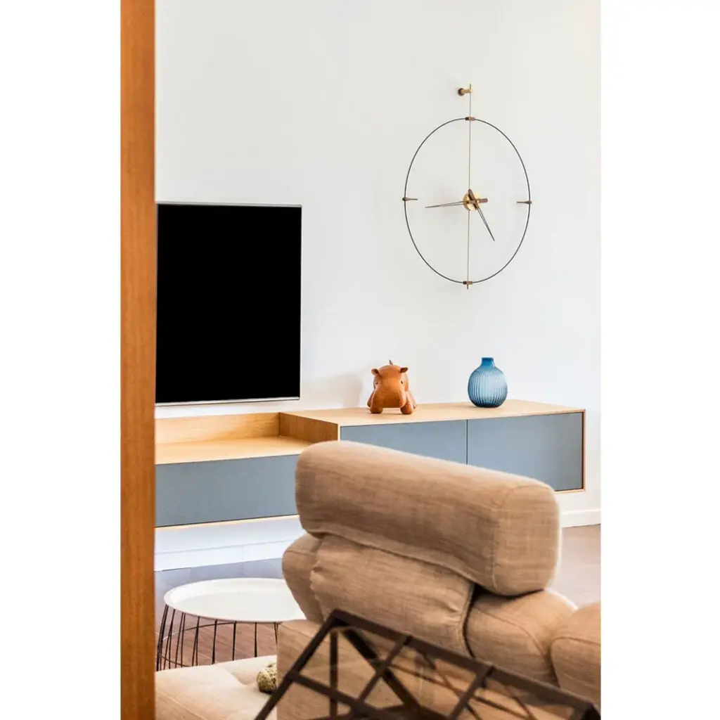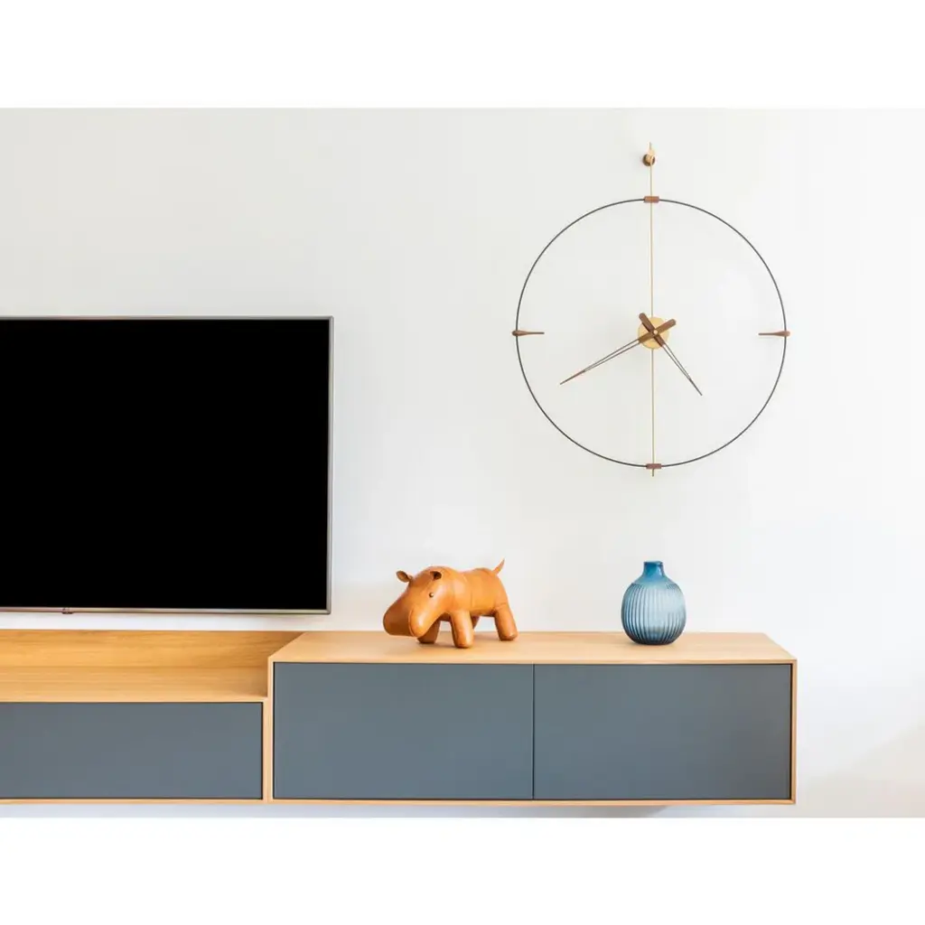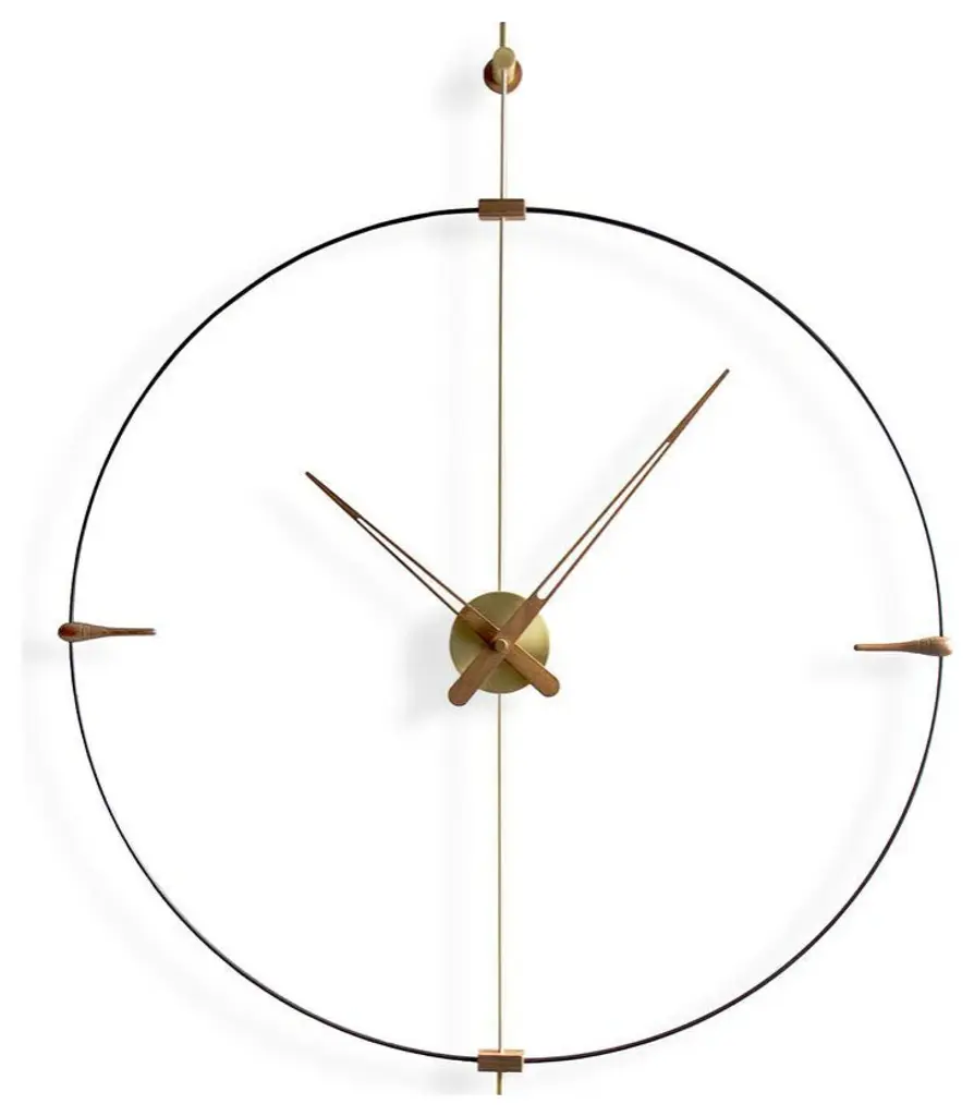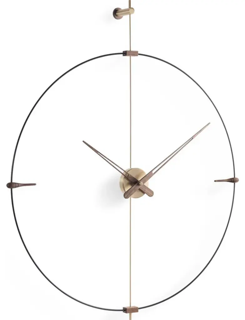A timeless wall decor piece the Mini Bilbao Wall Clock from Nomon brings simplicity and elegance into a living space. Can be used in a dining room setting or just about any room of the house due to its minimal style. Nomon clocks are hand-made using high-quality materials.Specifications:Style: Design ModernPremises: Office Kitchen Living Room BedroomBox: Polished brassAgujas: Natural walnut woodCircle: Black fiberglassDimensions: 77 cm H: 92 cmMechanism: UTS GERMANModel: MBIG