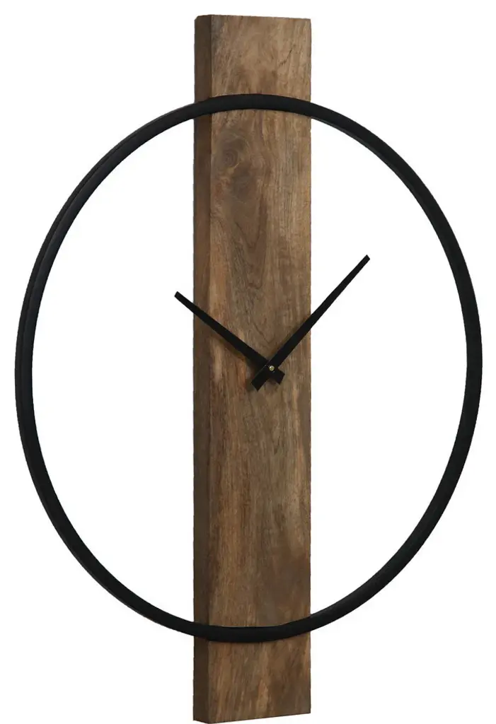 Count the hours with the countryside style of this traditional wall clock. Mounted to a mango wood plank, the round clock face is a hollow iron hoop that uses the wall behind to mark the minutes. Sophisticated in its simplicity, the decorative timepiece is a signature accent for rooms with an appreciation for rustic decor.