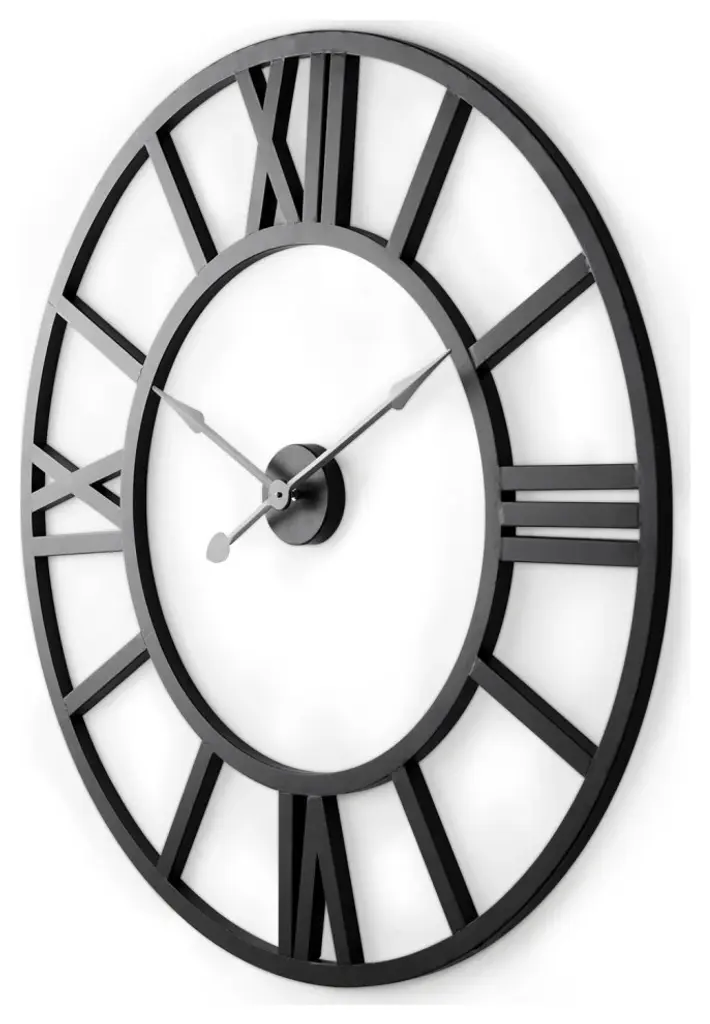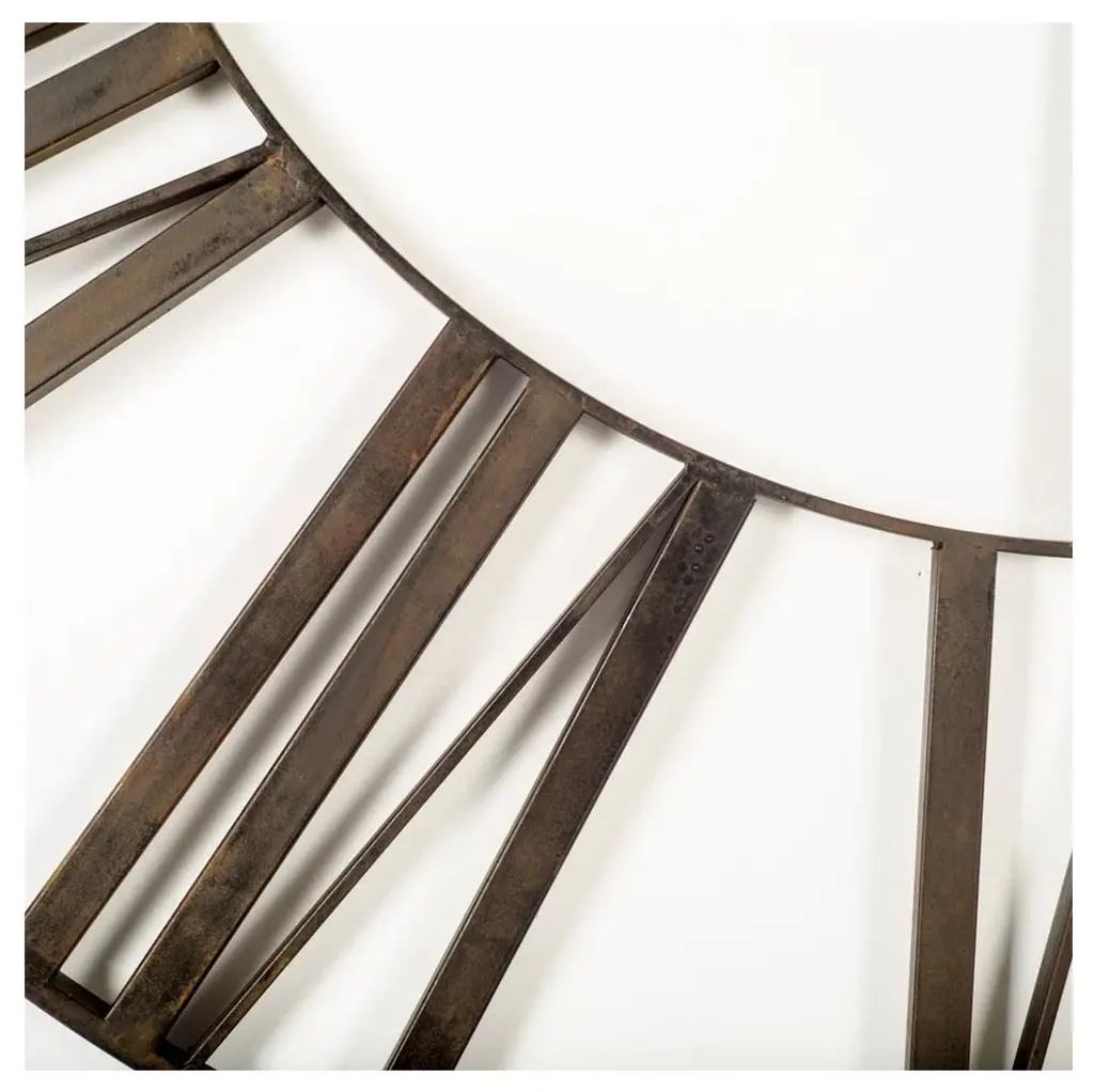 The Pender is a massive oversized iron wall clock that features welded iron Roman numerals and large traditional black hands. It has no back so it will allow your wall color to make it your own. Uses 1 AA battery (not included)