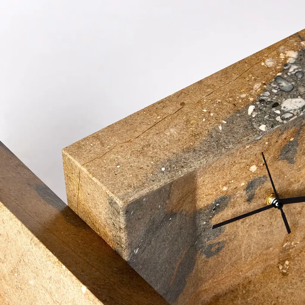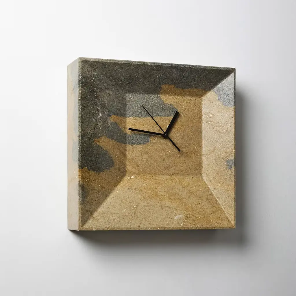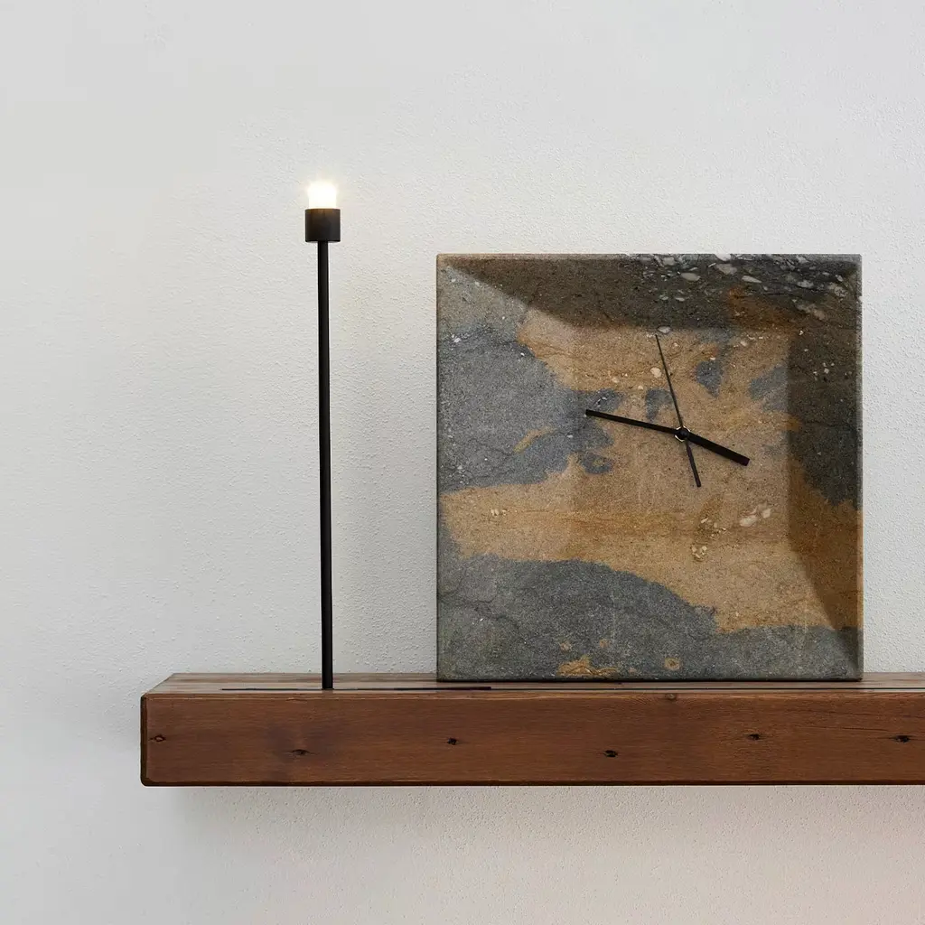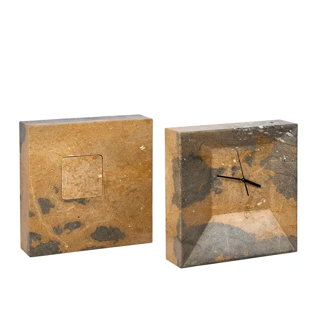 Equally superb sitting on a shelf, desk, or anchored to a wall, this clock obtained from a single block of fine, polychrome marble owes its name and tridimensional shape to Piero della Francesca, an Italian Reinassance painter strongly committed to perspective. The rigor of its volume is counterbalanced by the unpredictable nature of the marble traceries. Batteries are included.