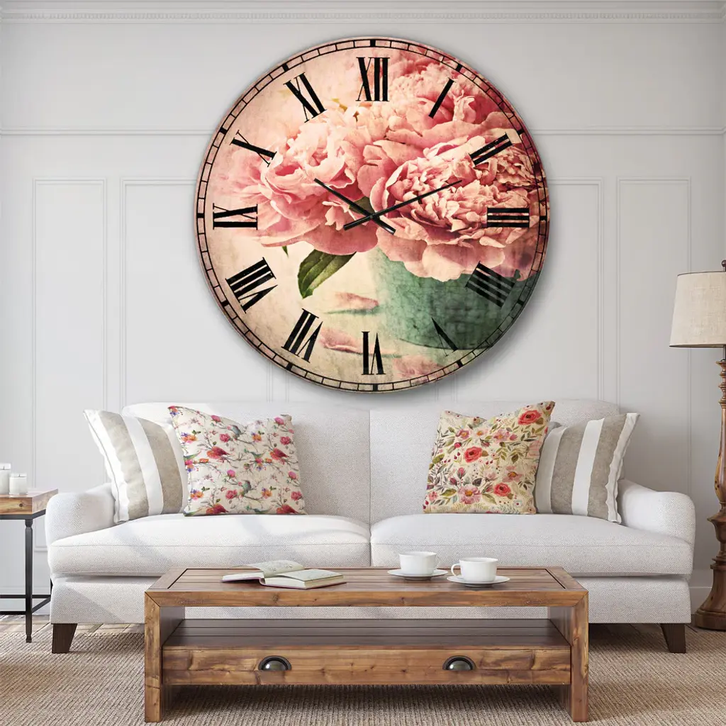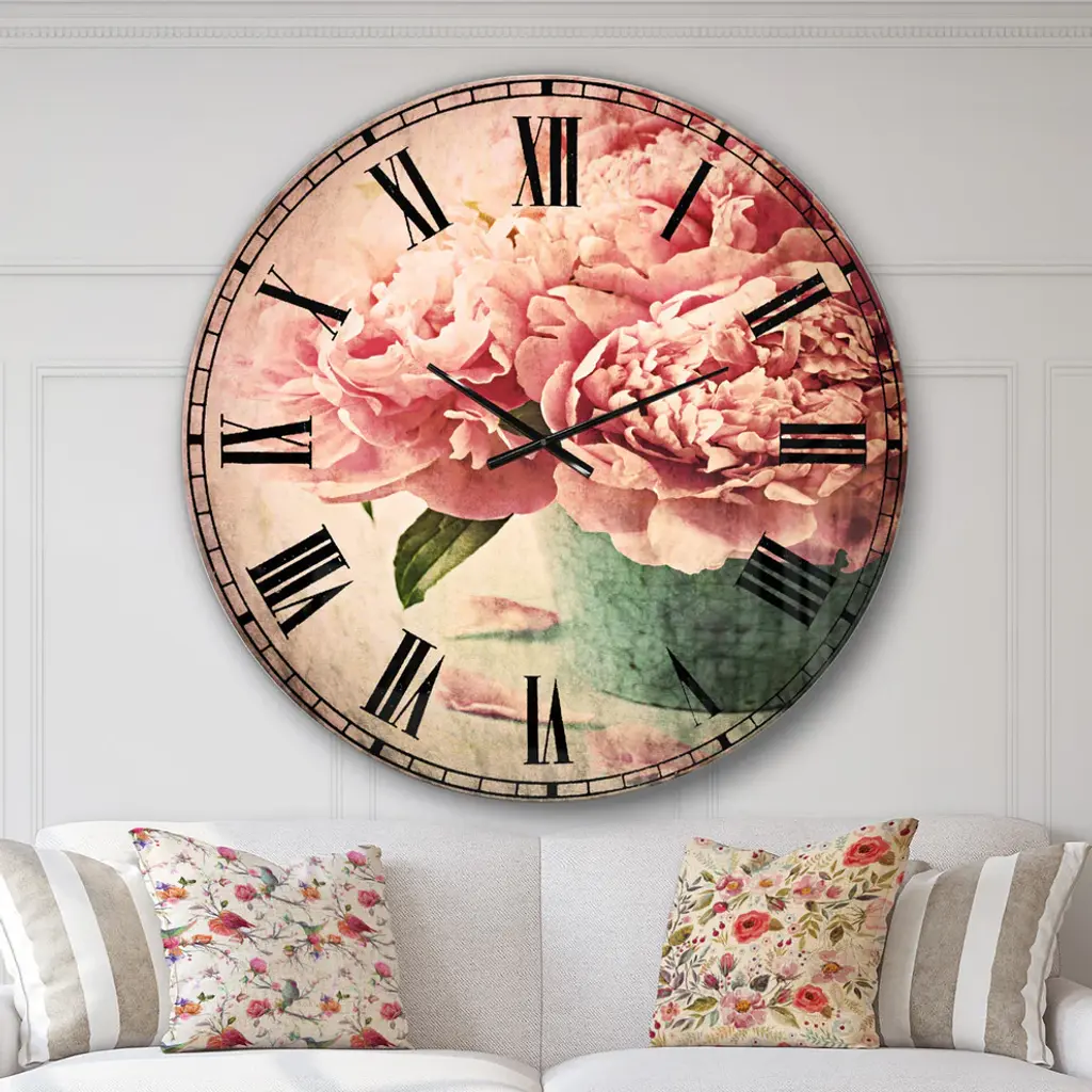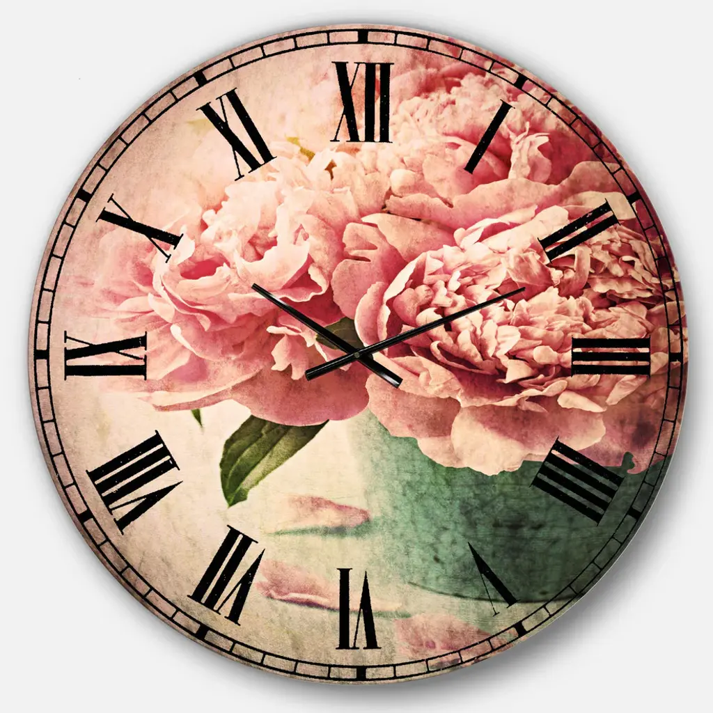 Pink Peony Flowers In Vase Floral Large Metal Wall Clock, 36x36
