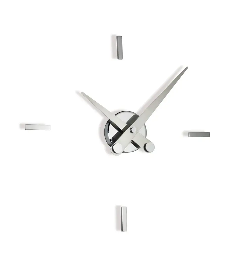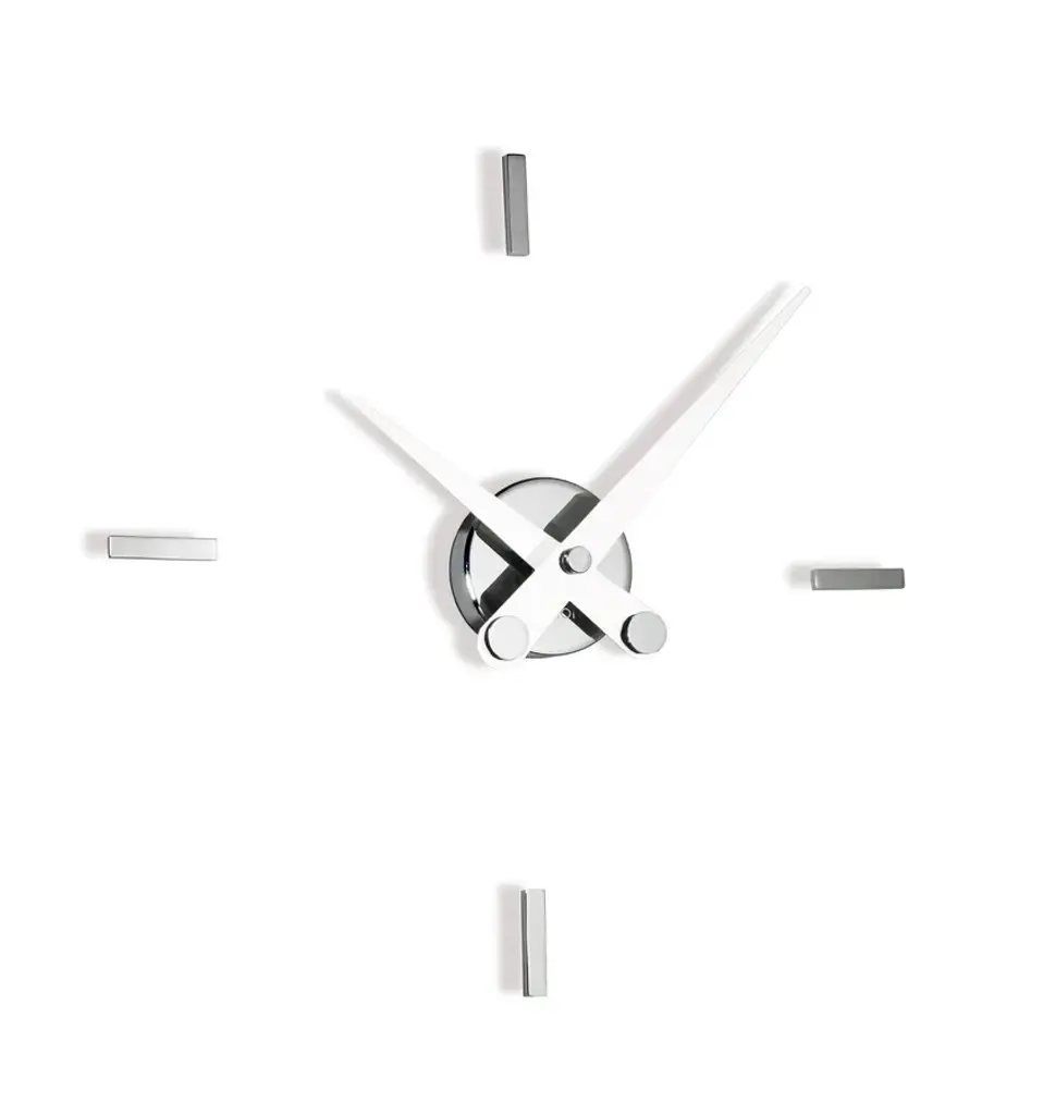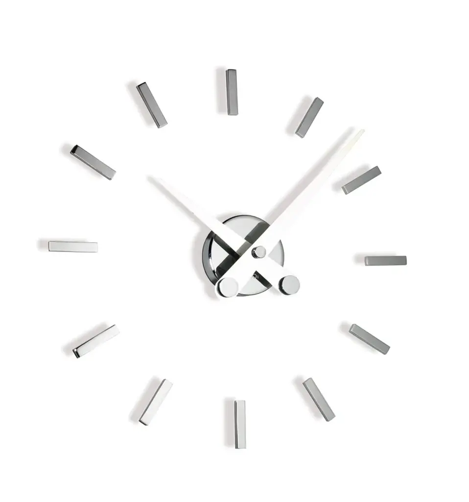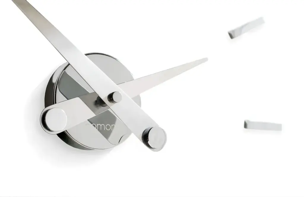 PUNTOS SUSPENSIVOS is a wall-mounted brass and steel clock. Clock with an industrial and avant-garde style thanks to the monochrome polished steel of all its parts. The hands are also available in black, white or red. With a 50cm dial, it is an option easily adaptable to rooms such as kitchens or bathrooms. Materials: chromed brass box and polished or painted in black, white or red steel hands.