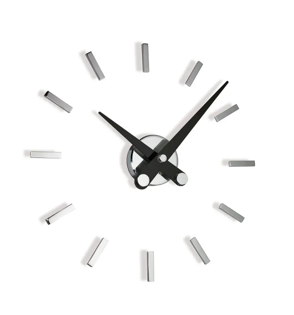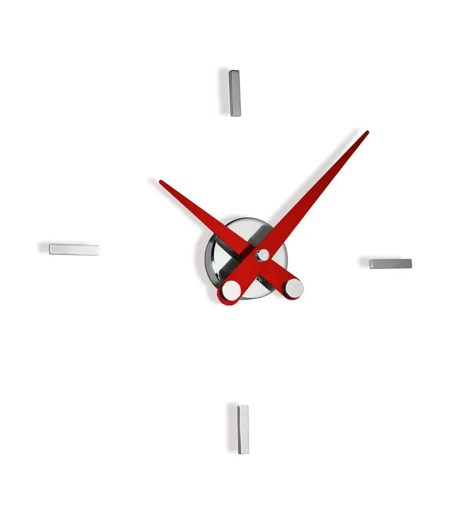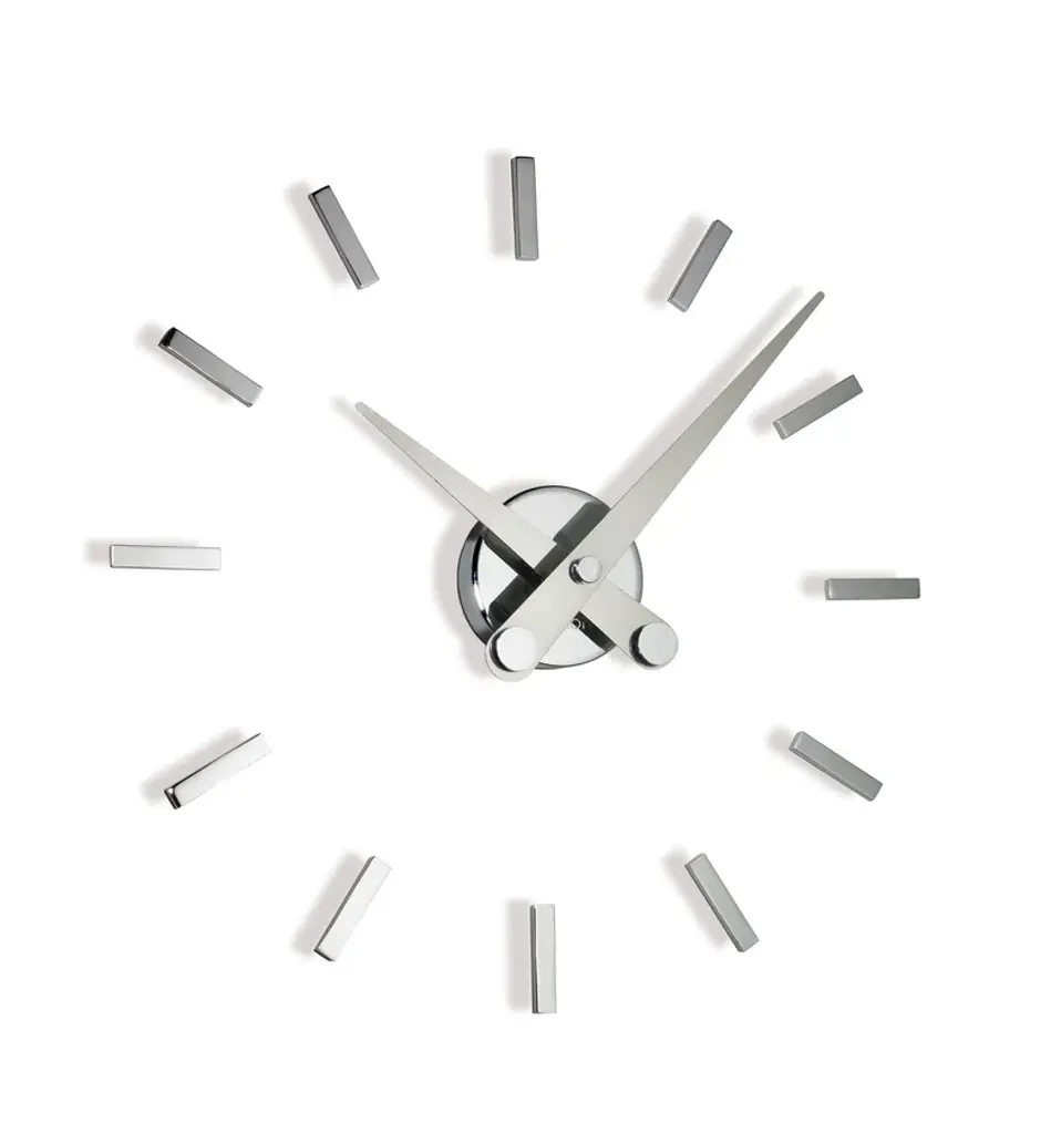 PUNTOS SUSPENSIVOS is a wall-mounted brass and steel clock. Clock with an industrial and avant-garde style thanks to the monochrome polished steel of all its parts. The hands are also available in black, white or red. With a 50cm dial, it is an option easily adaptable to rooms such as kitchens or bathrooms. Materials: chromed brass box and polished or painted in black, white or red steel hands.