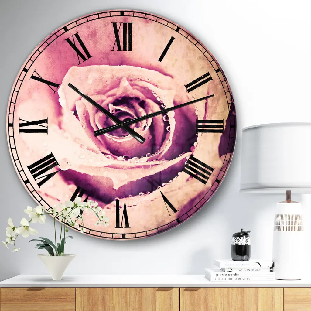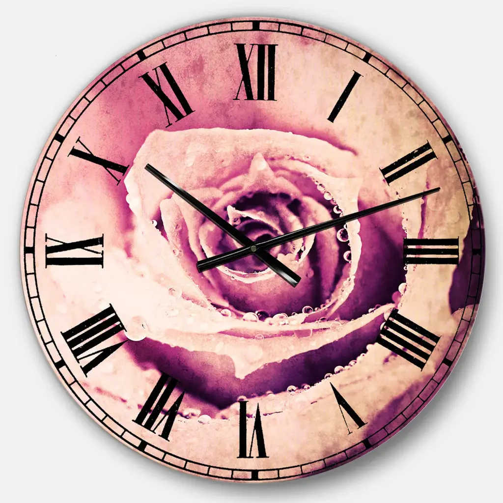 Purple Wet Rose Background Flowers Round Metal Wall Clock, 23x23