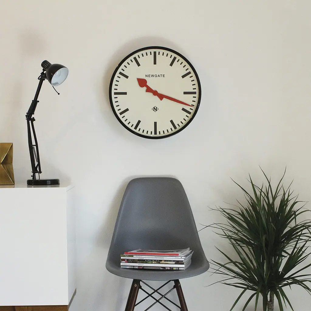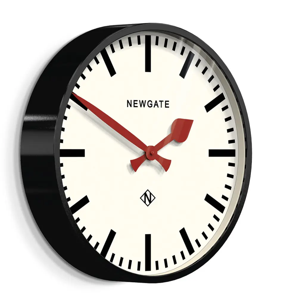 LARGE BLACK STATION WALL CLOCK A large railway station wall clock with a gloss black finish. A deep straight-cut metal case and a bold marker dial contrast with red metal hands to make the Putney one of Newgate's most iconic designs. Painted metal wall clock Gloss Black colourway Marker dial with metal baton and teardrop hands 17.7 x 17.7 x 3.5in ( )