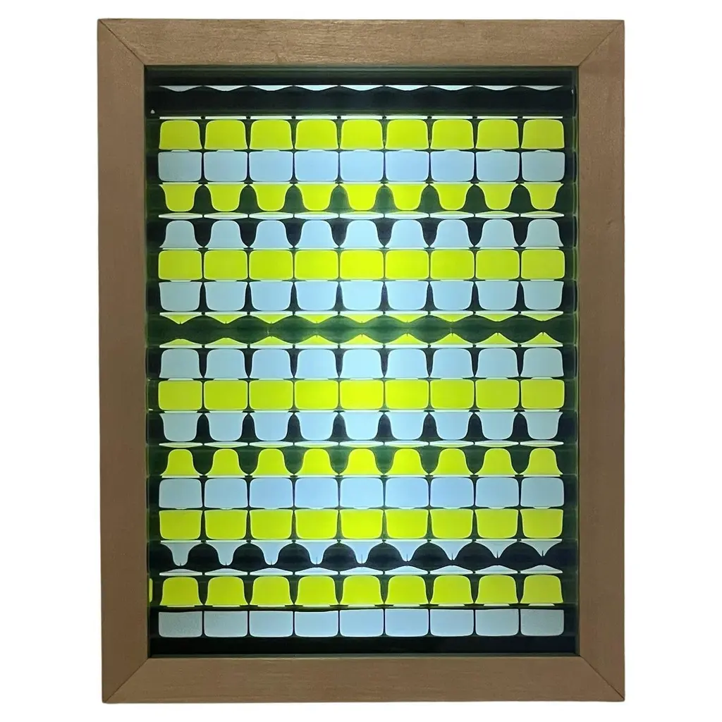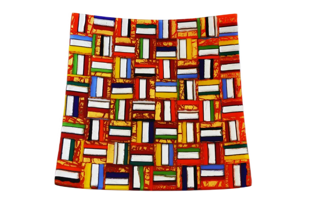 This is a medium-size handmade square wall clock. They are composed from small colorful glass rectangles fused with each other by tiny glass bridges. The actual glass shapes and colors may be slightly different.