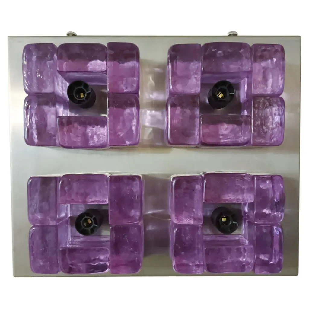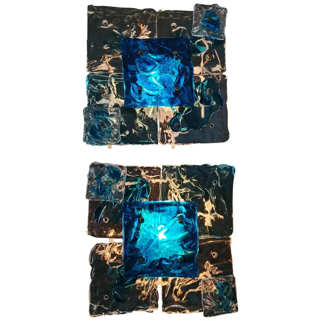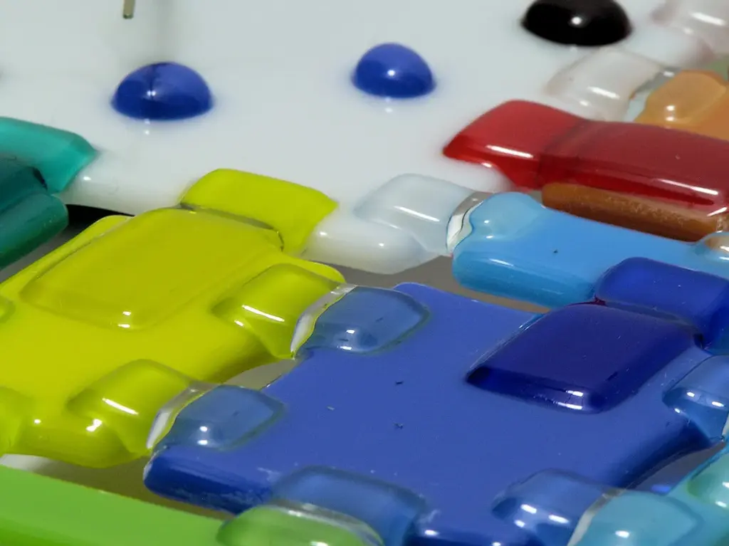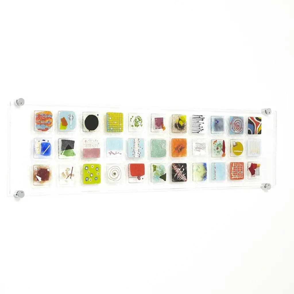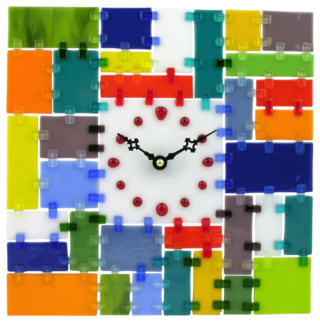 This is a medium-size handmade square wall clock. They are composed from small colorful glass rectangles fused with each other by tiny glass bridges. The actual glass shapes and colors may be slightly different.