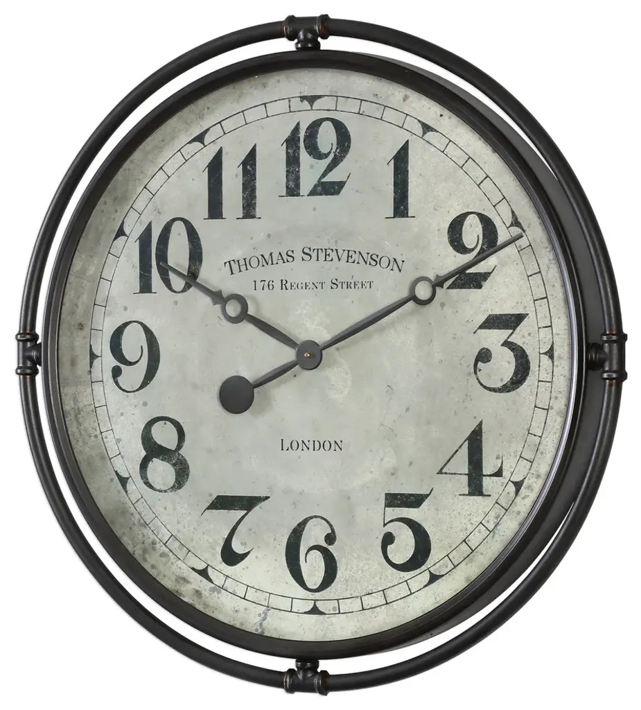 Smoke Gray Industrial Iron Frame With An Aged Ivory Clock Face Under Glass.- 29.5" dia x 2.5" deep. Weighs 12 lbs.- Hardwood Composite, Iron, and Glass- Quartz movement ensures accurate timekeeping. Requires one "AA" battery (not included). Properly weighted hanging hardware attached.- Heirloom Quality - Expertly hand crafted and hand finished. Due to the hand crafted nature of this piece, each piece may have subtle differences.