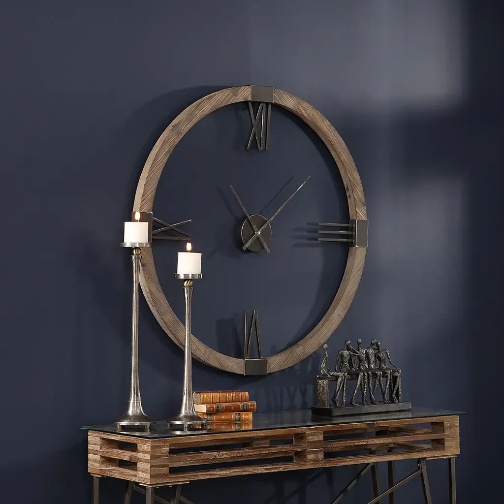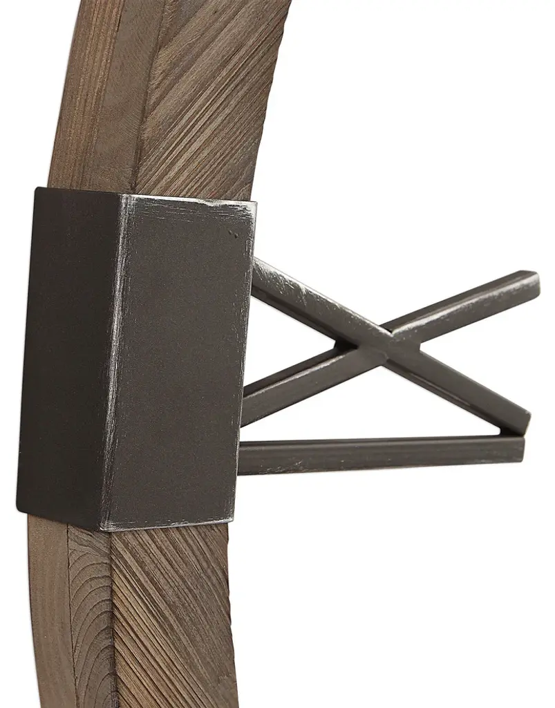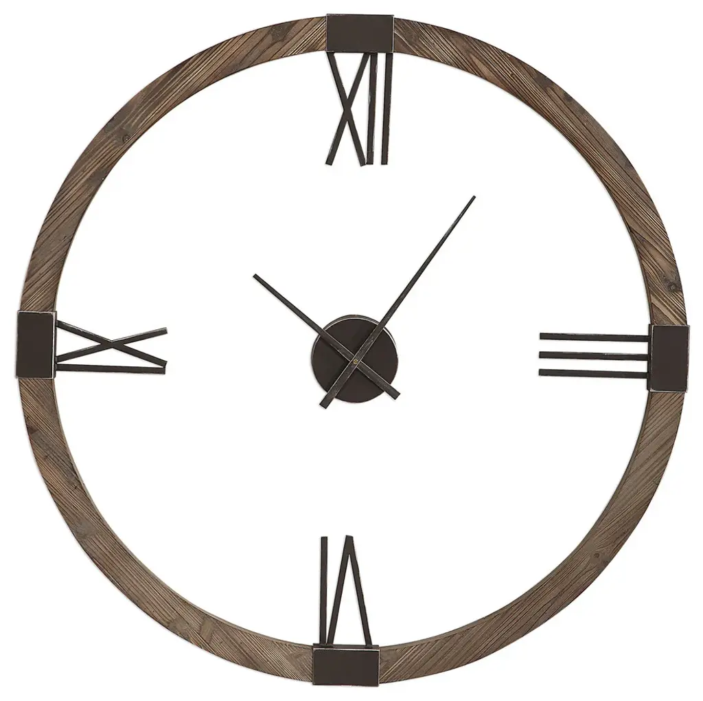 Natural Stained, Fir Wood Clock Frame With Hand Forged, Aged Iron Roman Numerals And Floating Center Dial. Quartz Movement Ensures Accurate Timekeeping. Requires One "AA" Battery.• 39.5" dia x 2" deep. Weighs 8 lbs.• Hand Finished Fir and iron• Properly weighted hanging hardware attached.• Heirloom Quality - Expertly hand crafted and hand finished. Due to the hand crafted nature of this piece, each piece may have subtle differences.