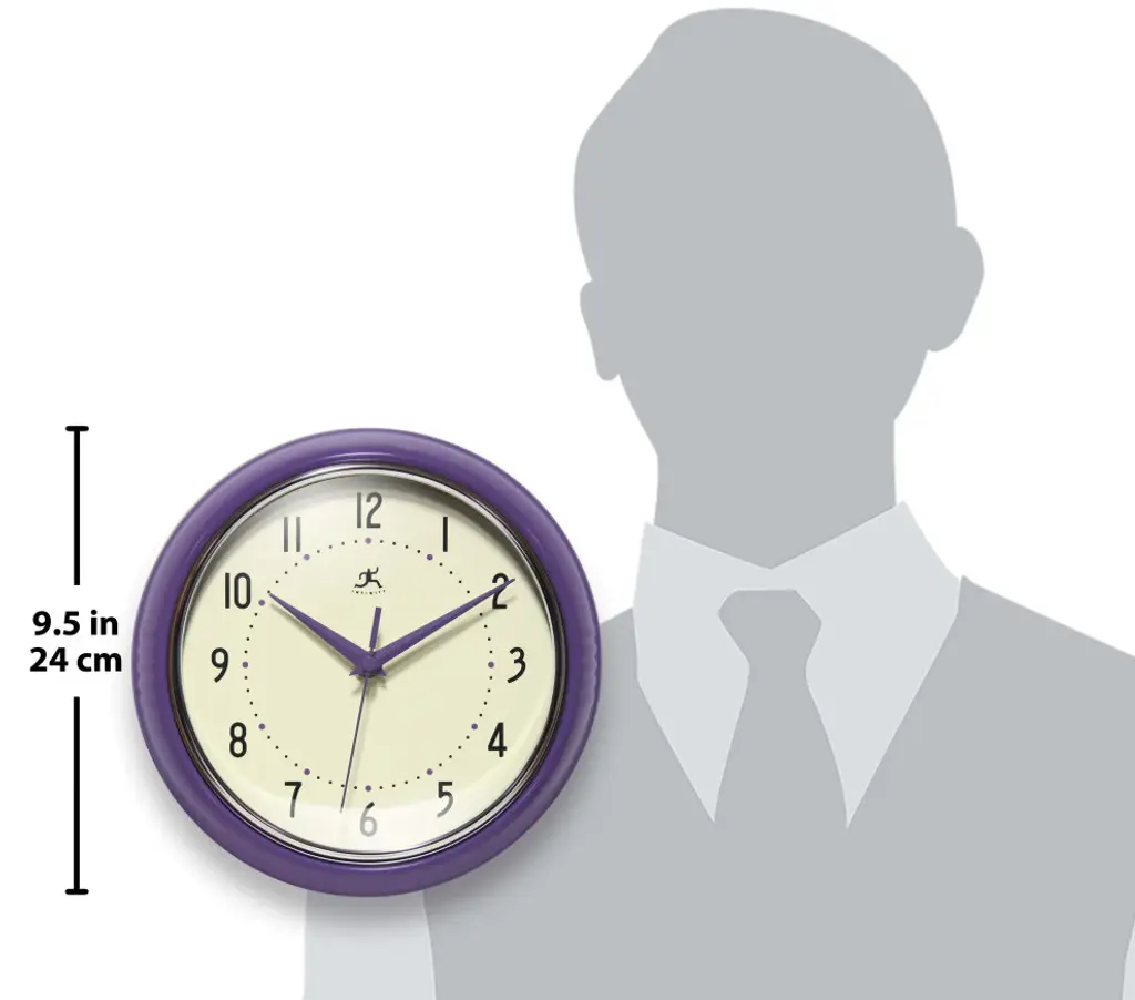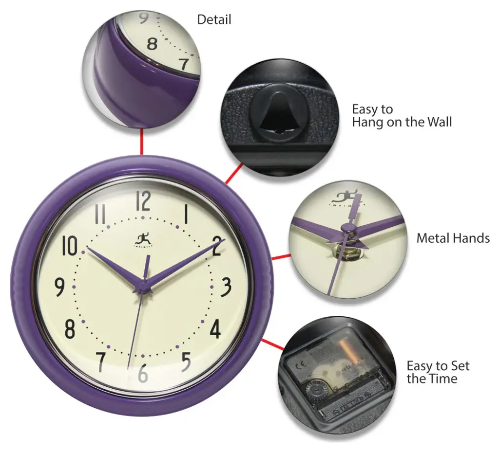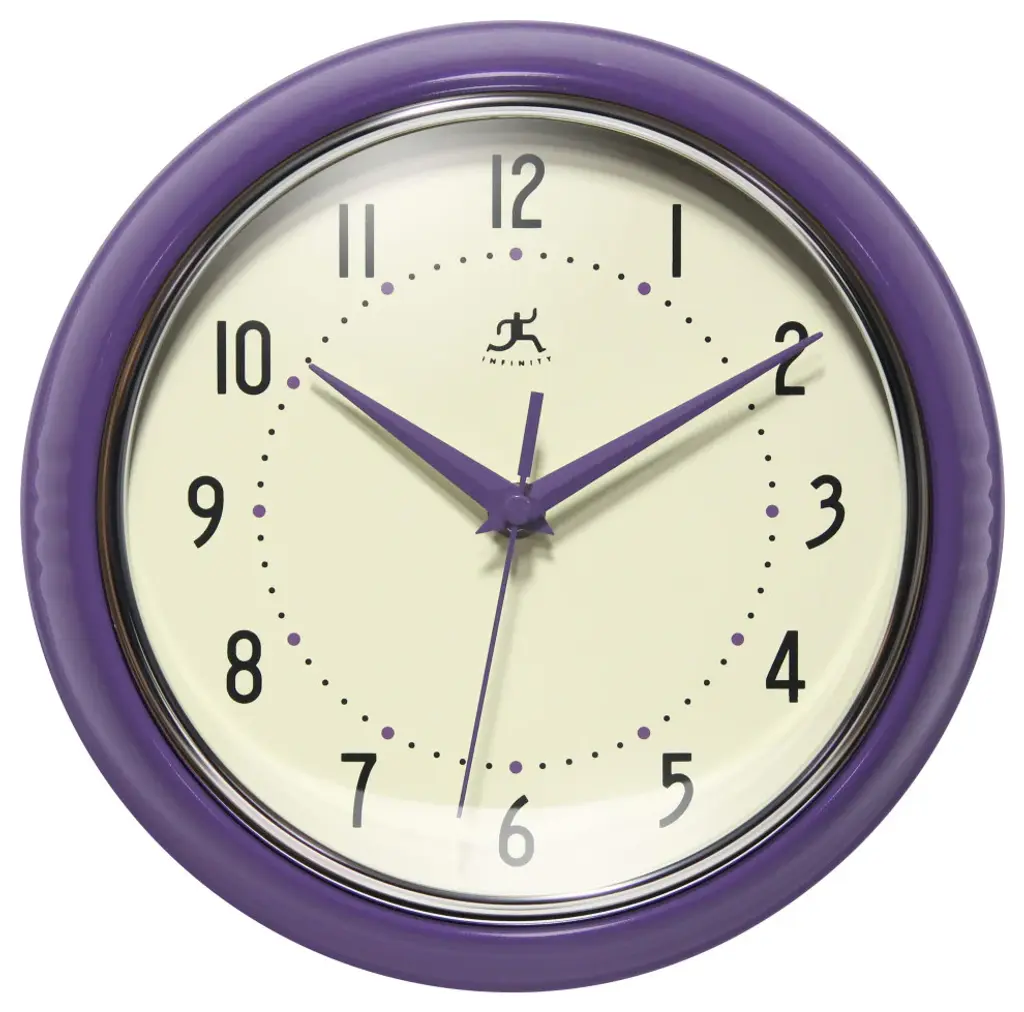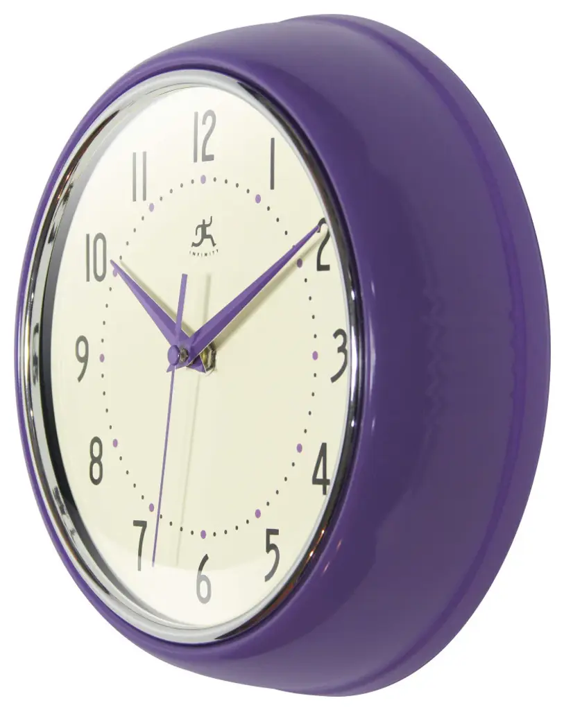 The Retro Round Purple Wall Clock''s stunning purple frame and unique retro design sets it apart from the rest. Infinity Instruments Retro Wall Clock collection has been a staple in the interior design/ wall decor accessories for well over a decade. It has proven the test of time with a clean retro look that fits most, if not all, home decor layouts. There have been many copy-cats but there is only one true Retro Aluminum Wall Clock.
