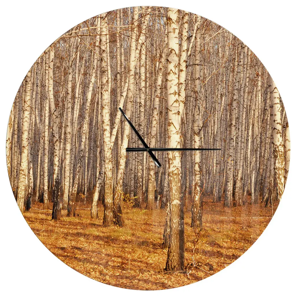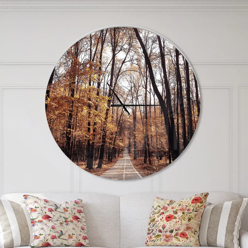 A beautiful addition to any home or office, this Modern & Contemporary round wall clock is made on 100% solid aluminum. It has a highly reflective glossy finish creating a sleek modern look. This Road in Autumn Golden Forest wall clock arrives completely ready to hang on the wall. Simply insert the �AAA� battery included with your order.Available in several size, this Modern Oversized Clock makes it the focal point of any room.Features - Ultra Gloss Coating ensures colors are extra vibrant with light reflection. - 1mm Aluminum grade sheet metal. - 1-inch mounting frame gives the illusion of artwork floating on the wall. - Mounting brackets and instructions are included. - High quality digital images are created directly into a glossy aluminum panel, producing a stunning and captivating print in the glossy finish of the metal. - Looks better than any photo paper and guaranteed to last at least 20 years. - Easy to clean with a microfiber cloth. - "AAA" battery included with your order. - Easy to hang. - Style: Modern & Contemporary - Material: Metal - Shape: RoundSee Options drop down for available sizes.