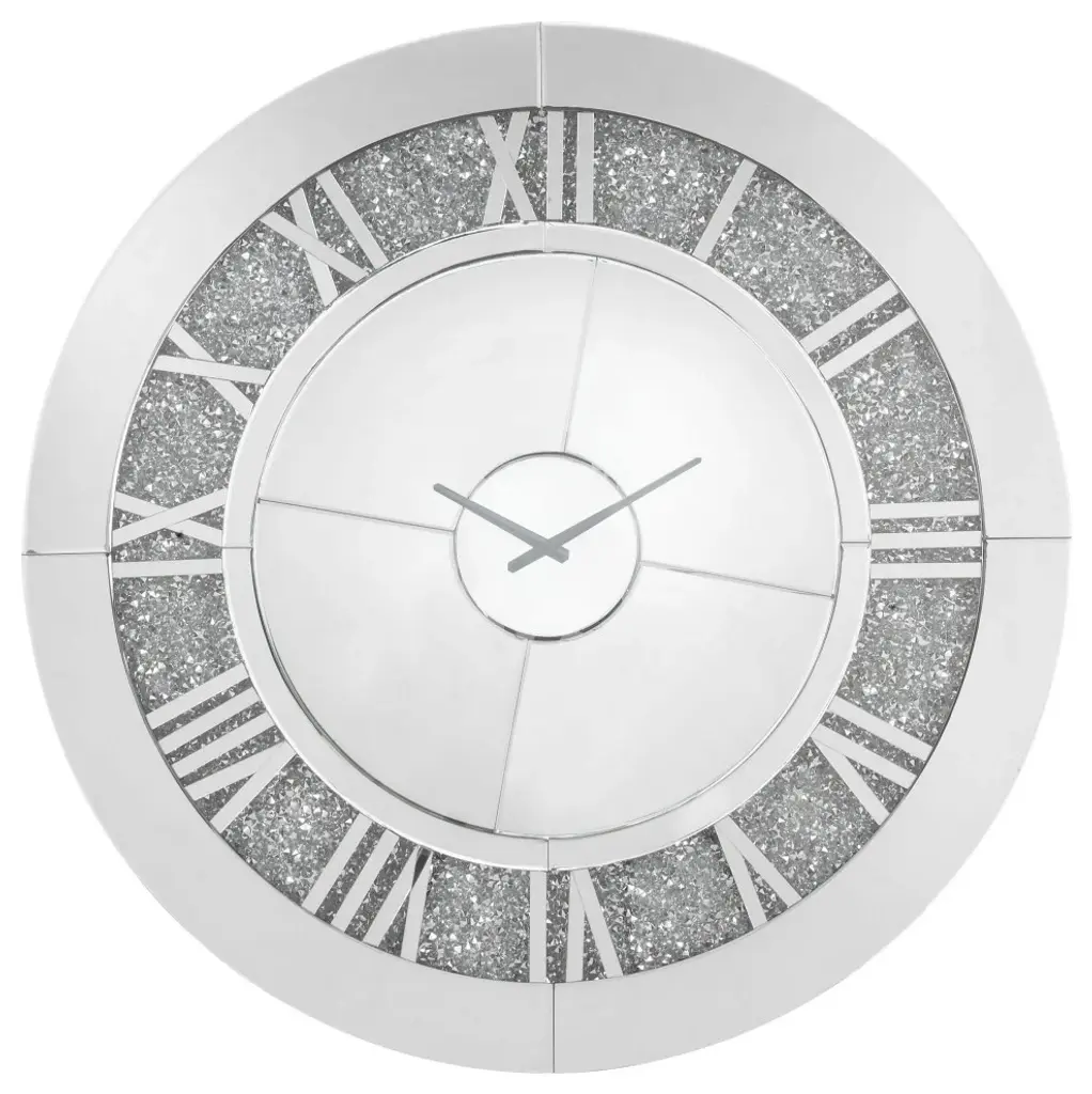 Romantic and luxurious, this round wall clock is a precious artisan piece sure to capture the eye. Its ring-like wooden frame boasts a texture of small pyramids minutely carved by hand that ensures the piece's uniqueness. Precious and colorful Bohemian crystal flowers decorate the wrought-iron frame enhanced by a nacre-effect layer of silver leaf. Batteries are included.