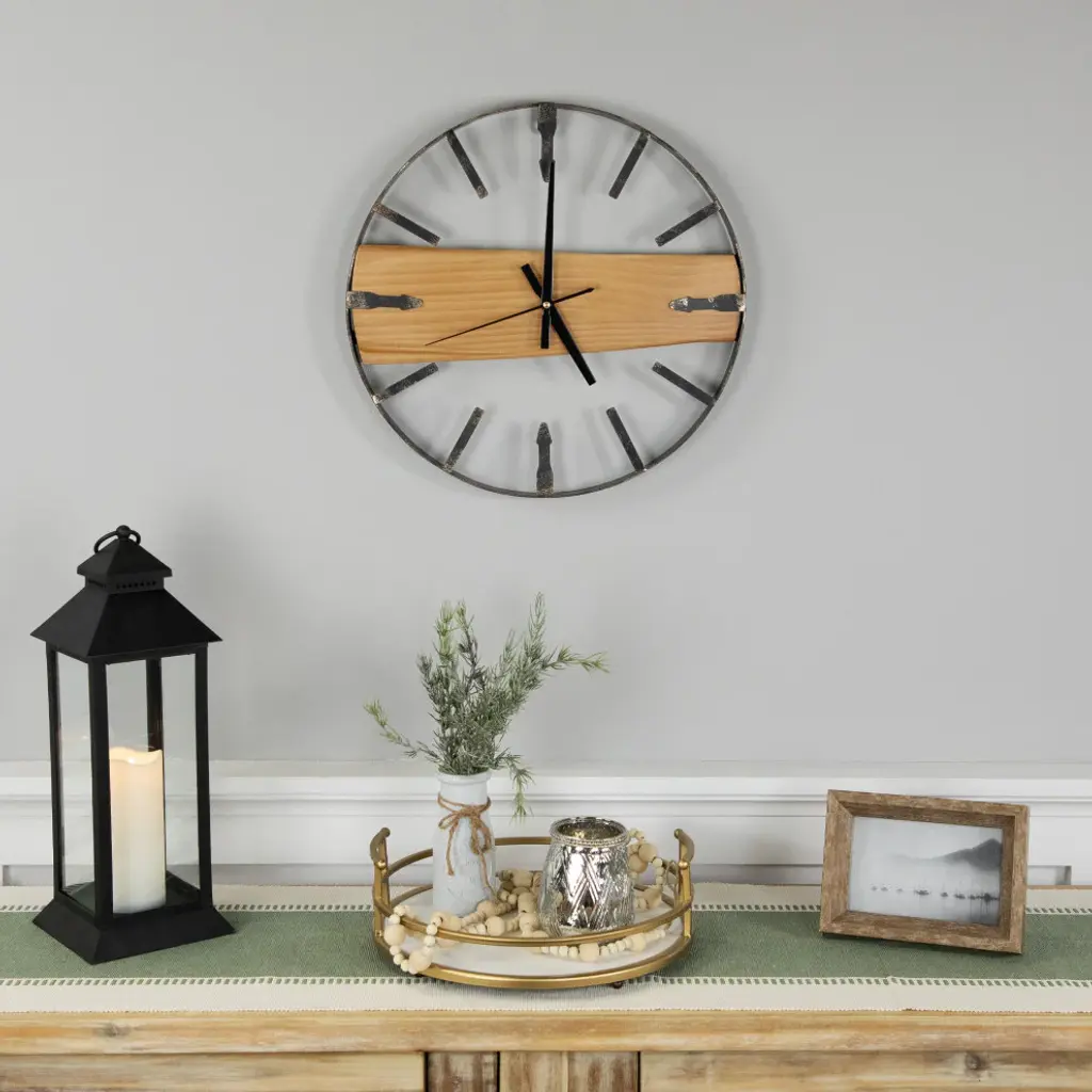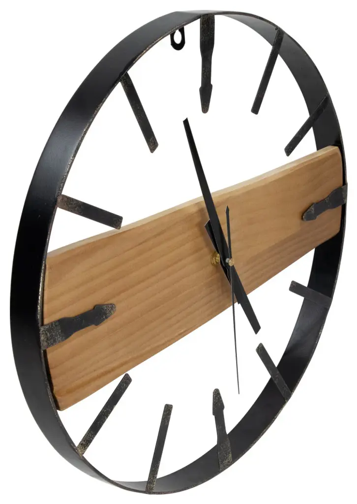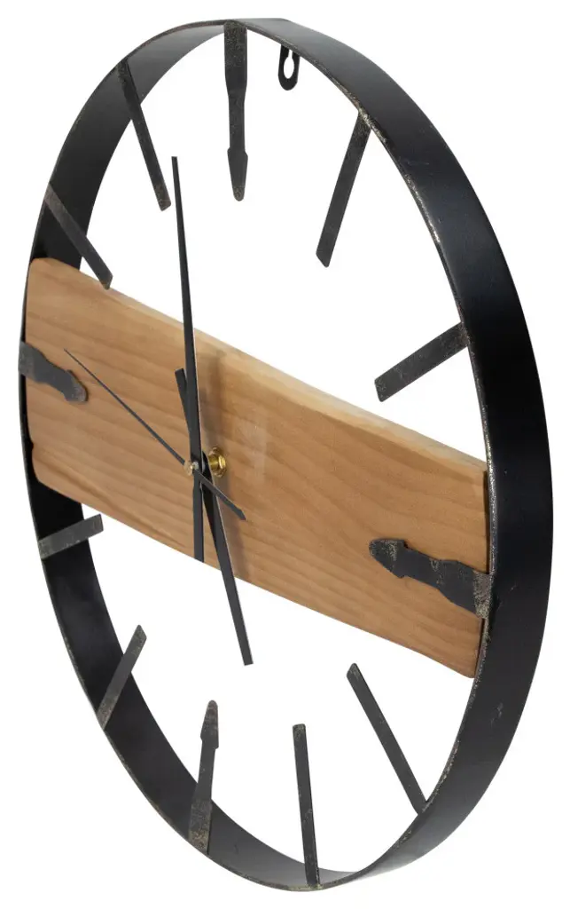 This unique timepiece redefines traditional clock aesthetics leaving out the digits for a minimalist appeal. The contrasting textures and sleek hands create a visual interplay that adds depth to your decor. With its bold character and unconventional style it becomes more than just a timekeeping device; it''s an artistic expression that speaks volumes about your modern sensibilities. No matter if it graces your living room hallway or kitchen it''s certain to perfectly complement any surrounding decor. Product Features: Hanging metal wall clock Black frame features a patina look Tabs represent the hours Hands secured on natural finished wood board Comes with a keyhole hanger for easy hanging Requires 1 "AA" battery; not included Recommended for indoor use only Dimensions: 15.5" diameter Material(s): wood/metal