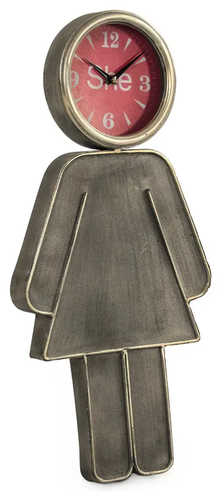 Add a comtemporary look to your home with this Metal Girl Wall Clock. The rustic clock is shaped as a girl logo with her head acting as the clock. The pink clock face has silver accents and black hands.