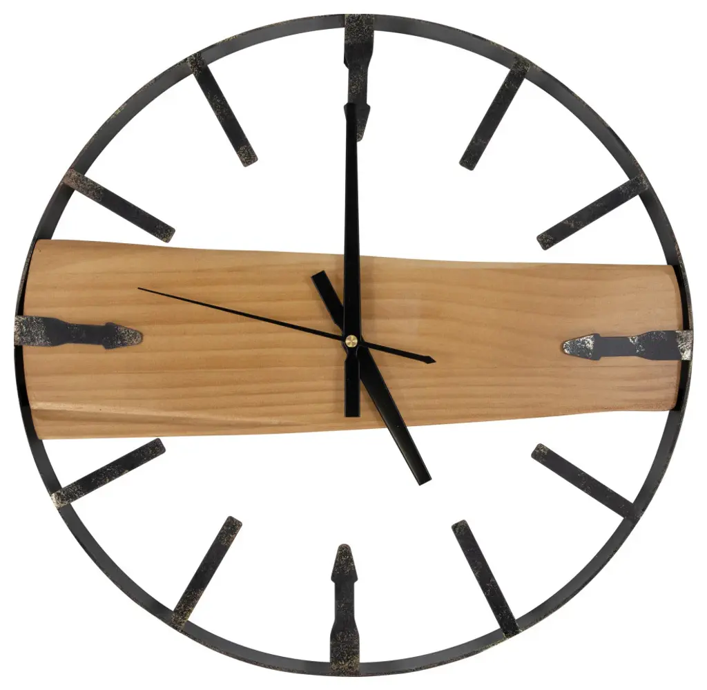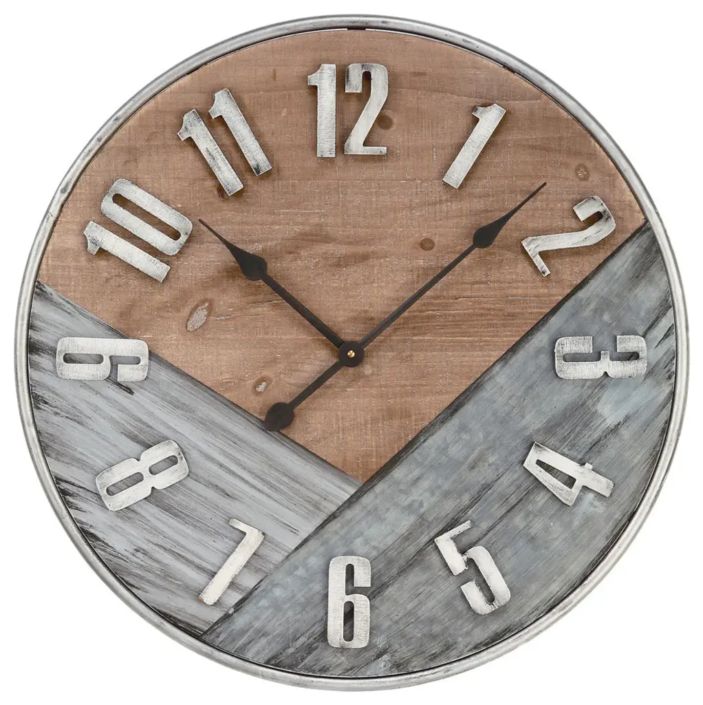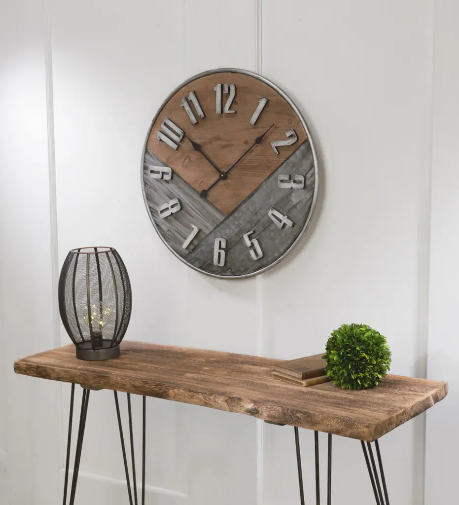 Vintage Rustic Wall Clock features distressed wood tones in brown and gray as well a galvanized metal panel creating a unique style and chic look.1 AA battery is required, but not included.23.75 in. W x 23.75 in H Rustic Wall ClockFeatures tones of brown and grey wood with a galvanized metal panel1 AA battery requiredBattery not included23.75 in. W x 1.4 in. d x 23.75 in. H
