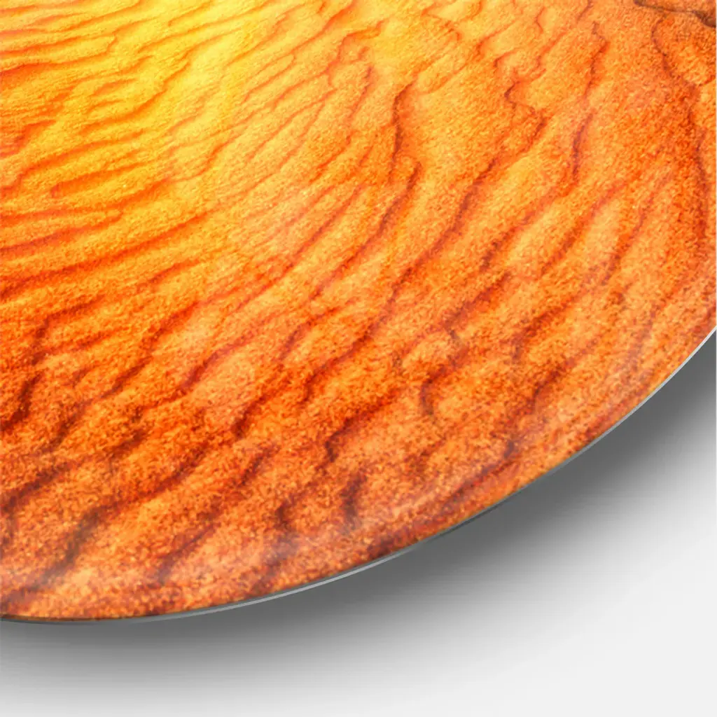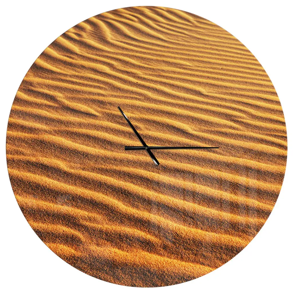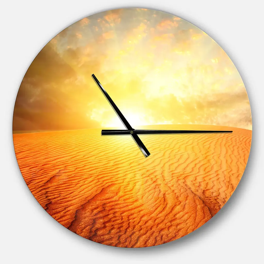 A beautiful addition to any home or office, this Modern & Contemporary round wall clock is made on 100% solid aluminum. It has a highly reflective glossy finish creating a sleek modern look. This Sand Landscape with Sun wall clock arrives completely ready to hang on the wall. Simply insert the �AAA� battery included with your order.Available in several size, this Modern Oversized Clock makes it the focal point of any room.Features - Ultra Gloss Coating ensures colors are extra vibrant with light reflection. - 1mm Aluminum grade sheet metal. - 1-inch mounting frame gives the illusion of artwork floating on the wall. - Mounting brackets and instructions are included. - High quality digital images are created directly into a glossy aluminum panel, producing a stunning and captivating print in the glossy finish of the metal. - Looks better than any photo paper and guaranteed to last at least 20 years. - Easy to clean with a microfiber cloth. - "AAA" battery included with your order. - Easy to hang. - Style: Modern & Contemporary - Material: Metal - Shape: RoundSee Options drop down for available sizes.