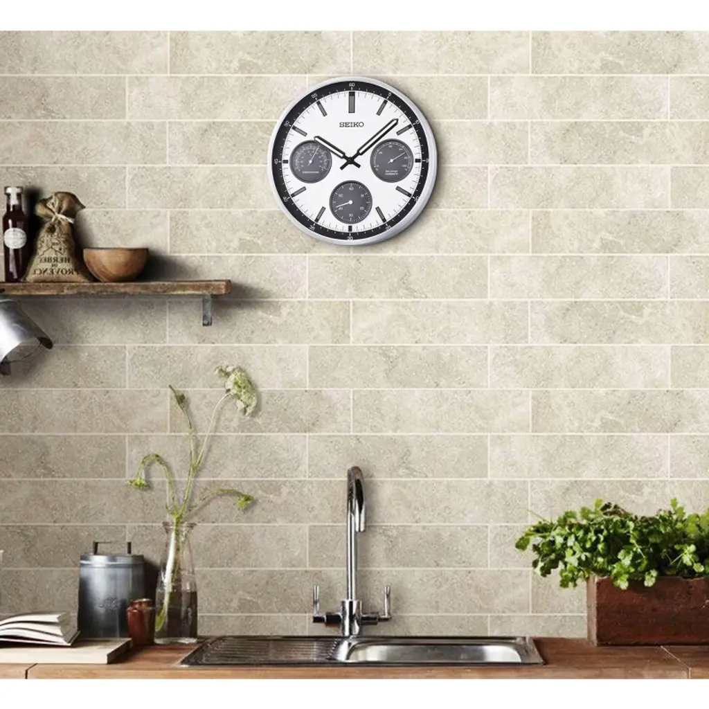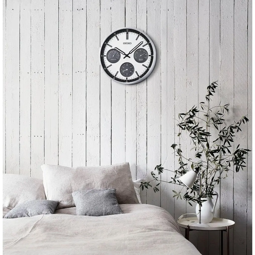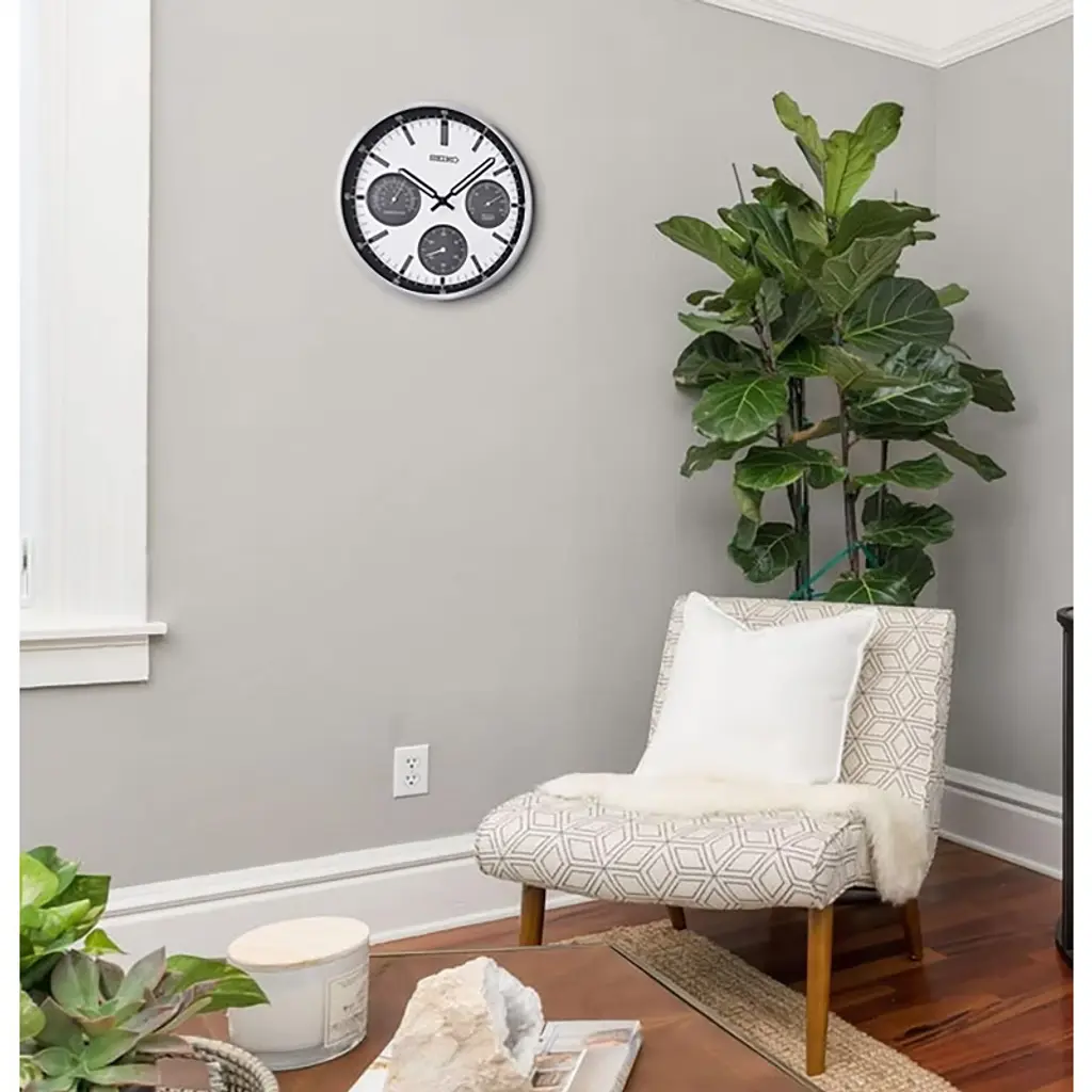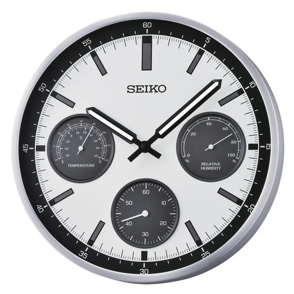 Elevate your space with the Heritage Design, Shelby Wall Clock from Seiko. This analog round wall clock features sporty colors of white, grey and black encompassed in a white aluminum case protected by a glass crystal face. The Lumibrite on the number indicators and hands allow you to tell the time, even in low light. This sporty clock features three precision-engineered inset dials that provide you with valuable information at a glance. A subtle yet captivating inset dial displays the seconds, reminding you that every moment counts. Stay informed about your environment with the temperature dial. Accurate and easy to read, it keep you up to date on the current conditions. Humidity levels can significantly impact your comfort and well-being. Our humidity dial ensures your're always aware of the moisture in the air, helping you create a more comfortable and healthy living space. Powered by 2 AA batteries, included. Overall dimensions: 12.99 X 12.99 X 1.93 inches. Quartz crystal movement allows for the most accurate time keeping. Perfect for tween to adult.