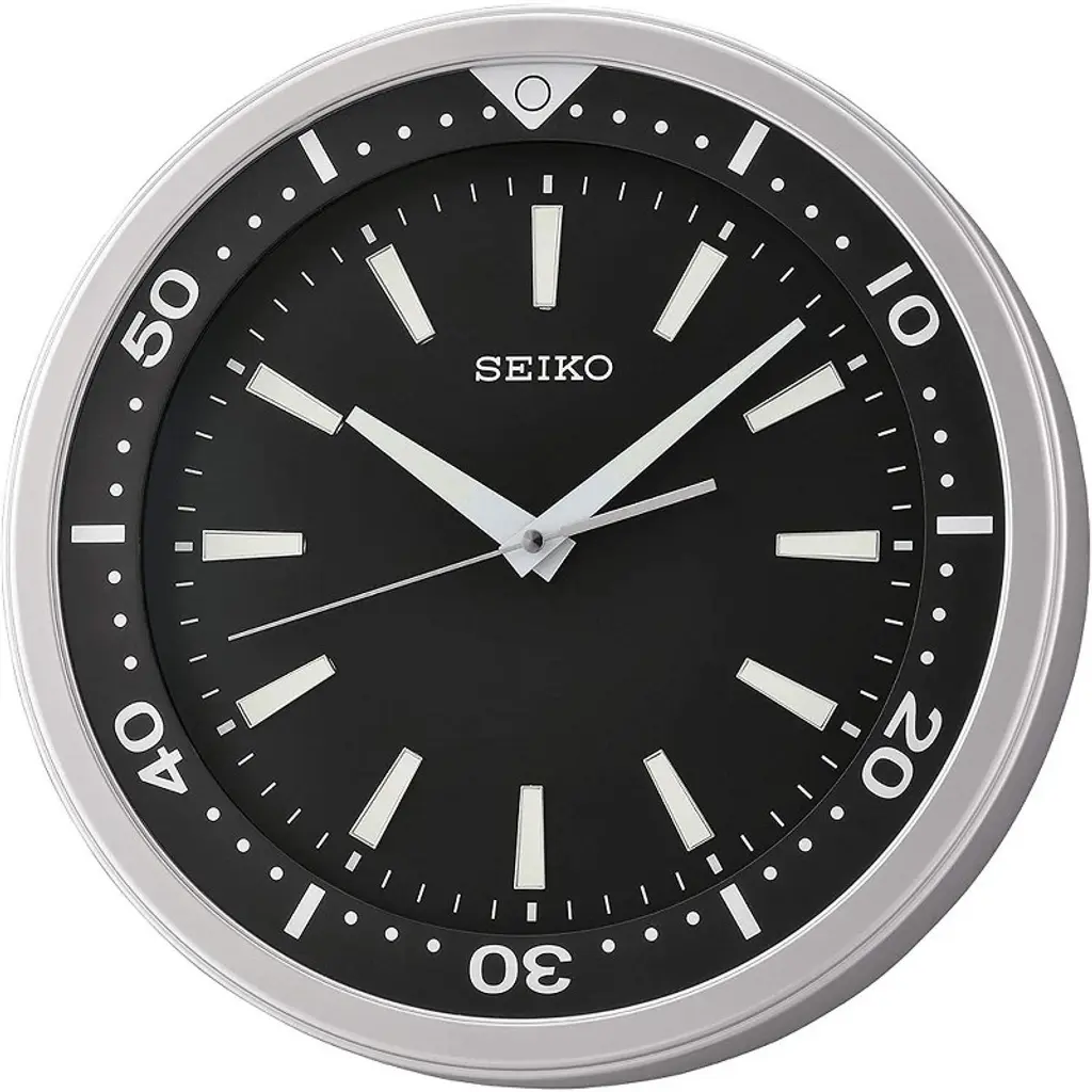 This Seiko 14" simple, ultra-modern wall clock brings simplistic style to any space. It features a round silver colored plastic frame with easy-to-read white markers, second hand sweep, 3D index with LumiBrite and hands with LumiBrite. Powered by 1 AA battery (included). Overall dimensions: 13.78 X 13.78 X 2.13 inches. Perfect for any office or any space.