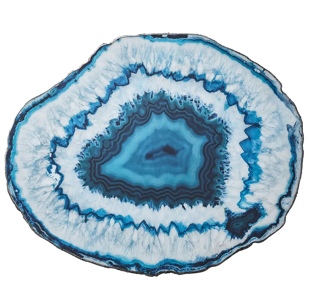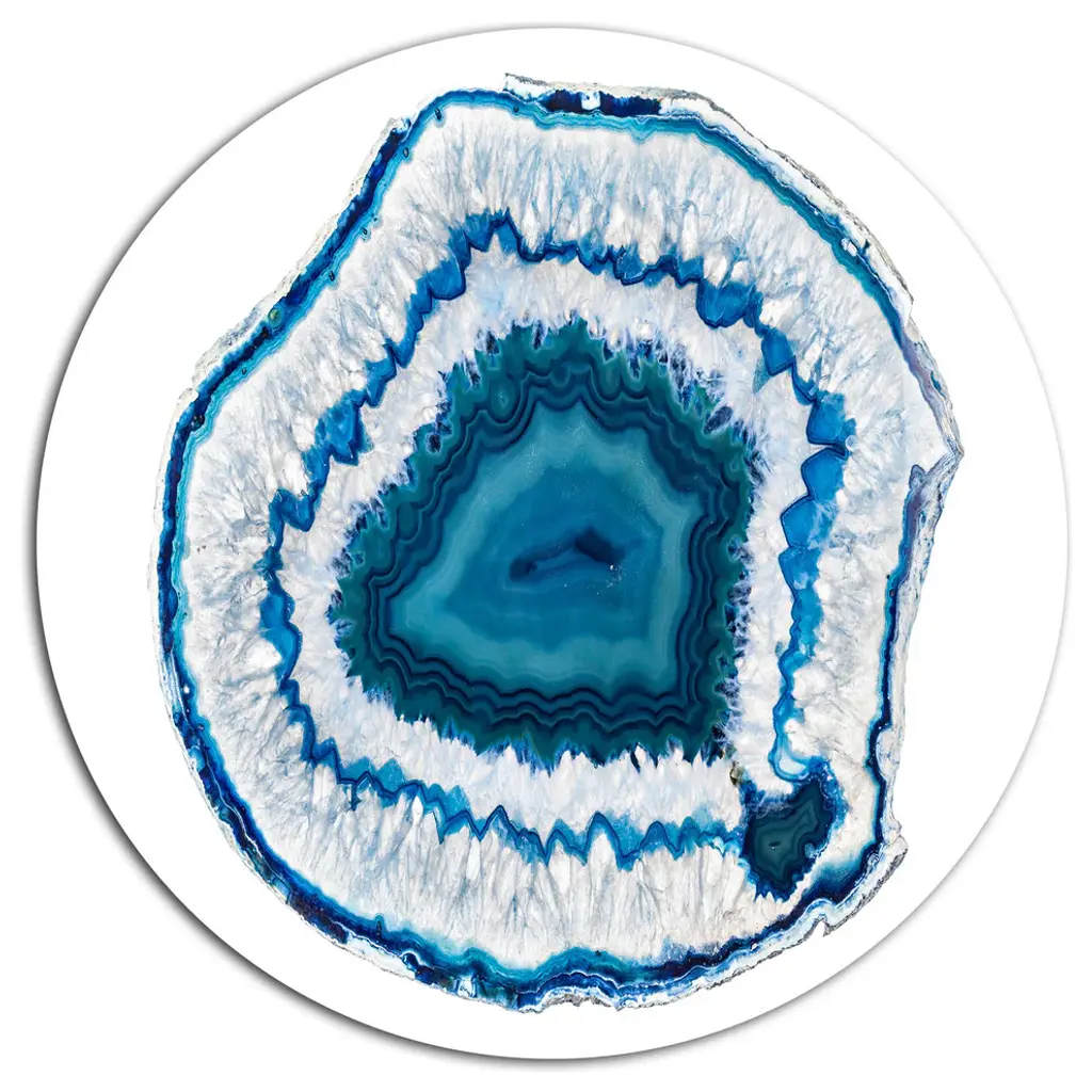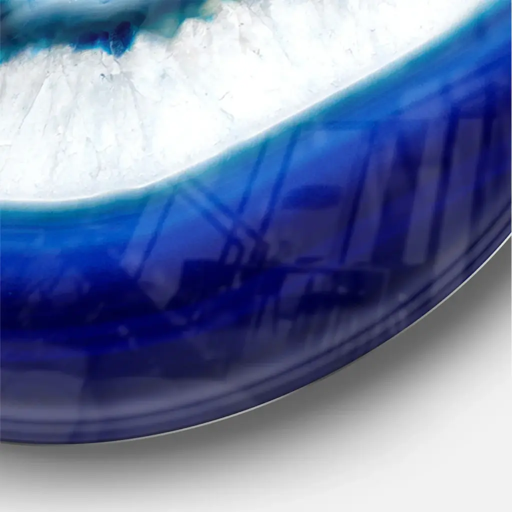 A beautiful addition to any home or office, this Modern and Contemporary round wall clock is made on 100% solid aluminum. It has a highly reflective glossy finish creating a sleek modern look. This Slice of blue agate crystal wall clock arrives completely ready to hang on the wall. Simply insert the �AAA� battery included with your order.Available in several size, this Modern Oversized Clock makes it the focal point of any room.Features - Ultra Gloss Coating ensures colors are extra vibrant with light reflection. - 1mm Aluminum grade sheet metal. - 1-inch mounting frame gives the illusion of artwork floating on the wall. - Mounting brackets and instructions are included. - High quality digital images are created directly into a glossy aluminum panel, producing a stunning and captivating print in the glossy finish of the metal. - Looks better than any photo paper and guaranteed to last at least 20 years. - Easy to clean with a microfiber cloth. - "AAA" battery included with your order. - Easy to hang. - Style: Modern and Contemporary - Material: Metal - Shape: RoundSee Options drop down for available sizes.