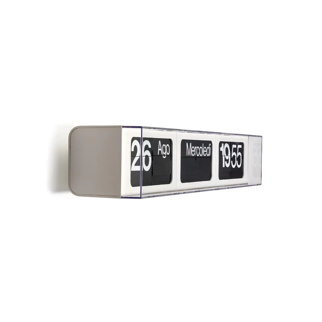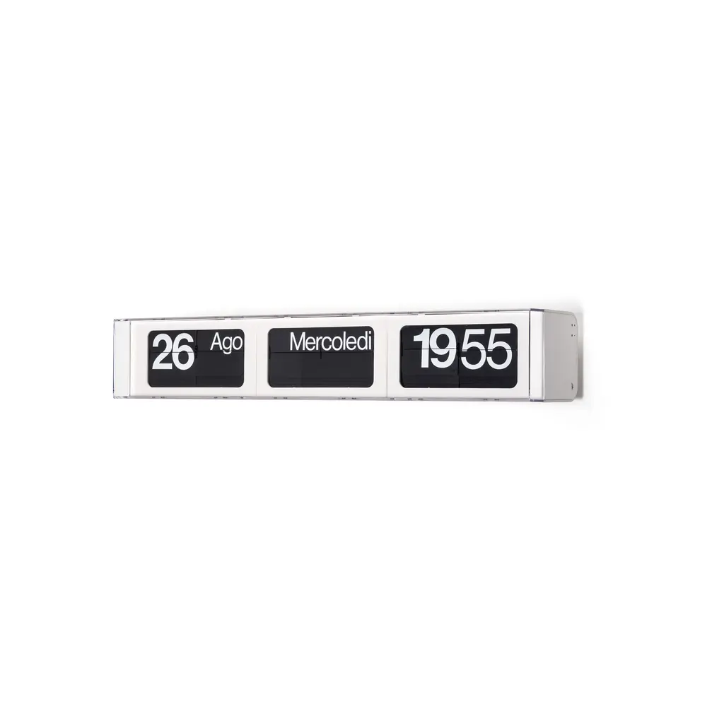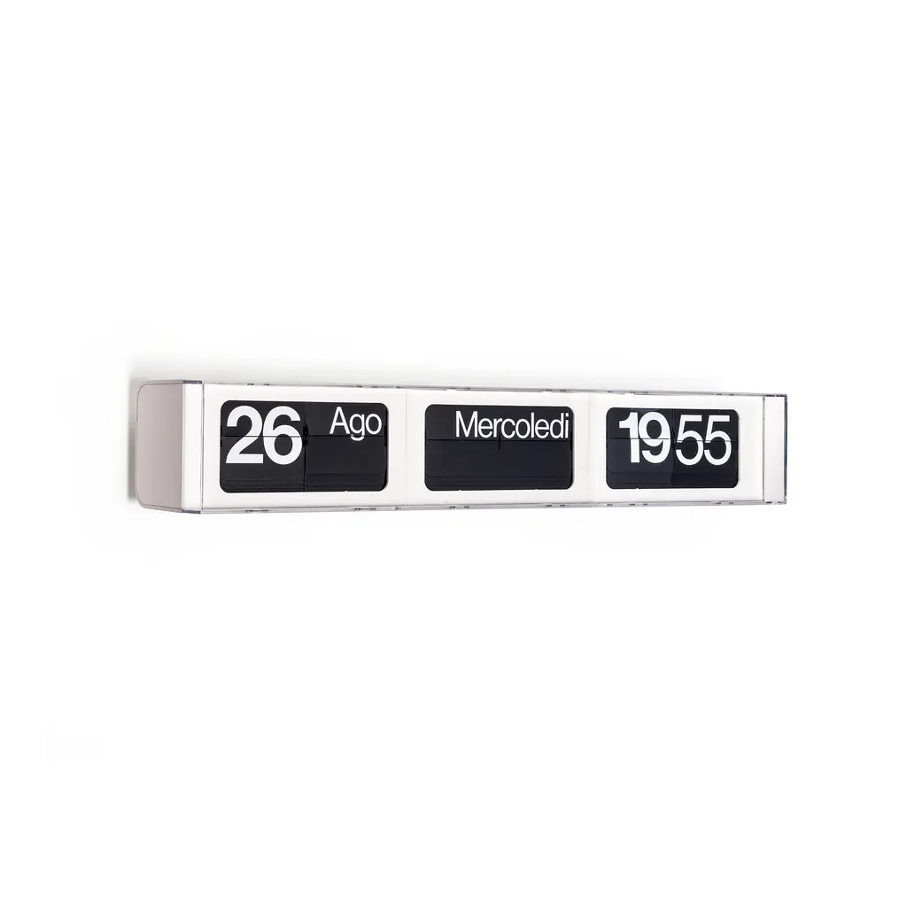 Mid-century charm and a retro flip system make the Dator 60 White clock a must-have for design lovers. Part of the Solari collection, this timepiece features a stepper motor and a flip display inspired by old information panels in train stations and airports. A design object that blends style and function, the clock displays the date, the day of the week, and the time with split-flaps that make a distinctive sound whenever they turn over. Created with legibility in mind, the display features black PVC cards with bright white lettering and digits. Dator 60 is also extremely versatile, as it can be used as a table and shelf clock or as a wall clock. Like other Solari timepieces, this clock is proudly made in Italy. A vertical version of this design is also available.