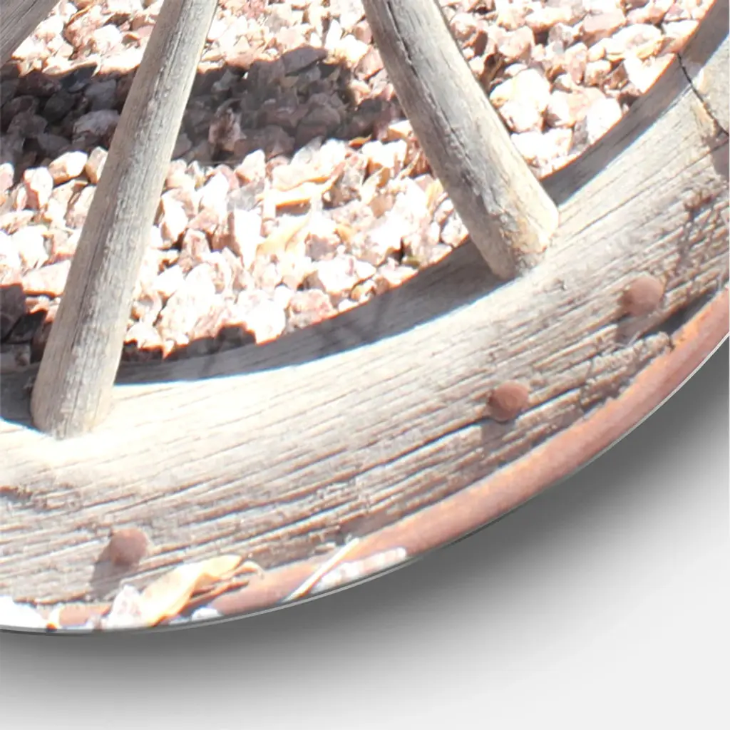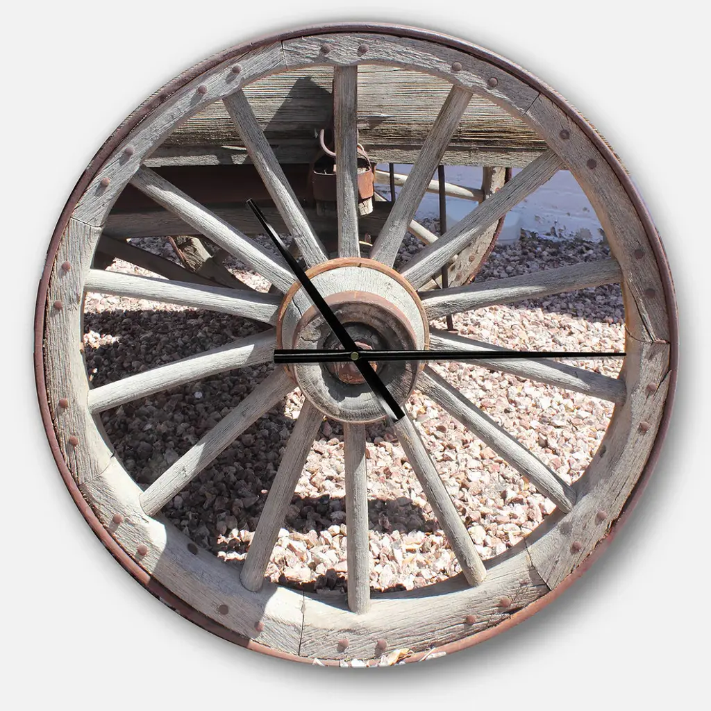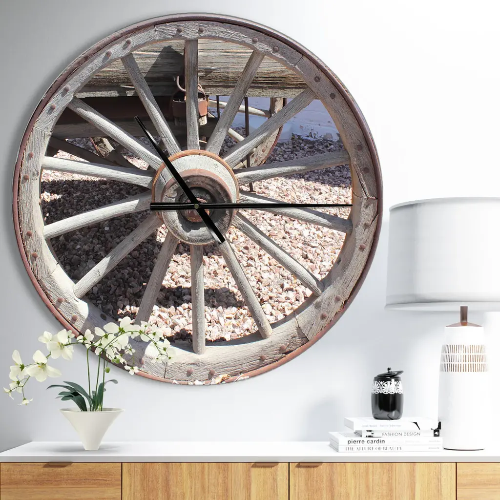 A beautiful addition to any home or office, this Farmhouse round wall clock is made on 100% solid aluminum. It has a highly reflective glossy finish creating a sleek modern look. This Spanish Cottage Carriage Wheel wall clock arrives completely ready to hang on the wall. Simply insert the �AAA� battery included with your order.Available in several size, this Modern Oversized Clock makes it the focal point of any room.Features - Ultra Gloss Coating ensures colors are extra vibrant with light reflection. - 1mm Aluminum grade sheet metal. - 1-inch mounting frame gives the illusion of artwork floating on the wall. - Mounting brackets and instructions are included. - High quality digital images are created directly into a glossy aluminum panel, producing a stunning and captivating print in the glossy finish of the metal. - Looks better than any photo paper and guaranteed to last at least 20 years. - Easy to clean with a microfiber cloth. - "AAA" battery included with your order. - Easy to hang. - Style: Farmhouse - Material: Metal - Shape: RoundSee Options drop down for available sizes.