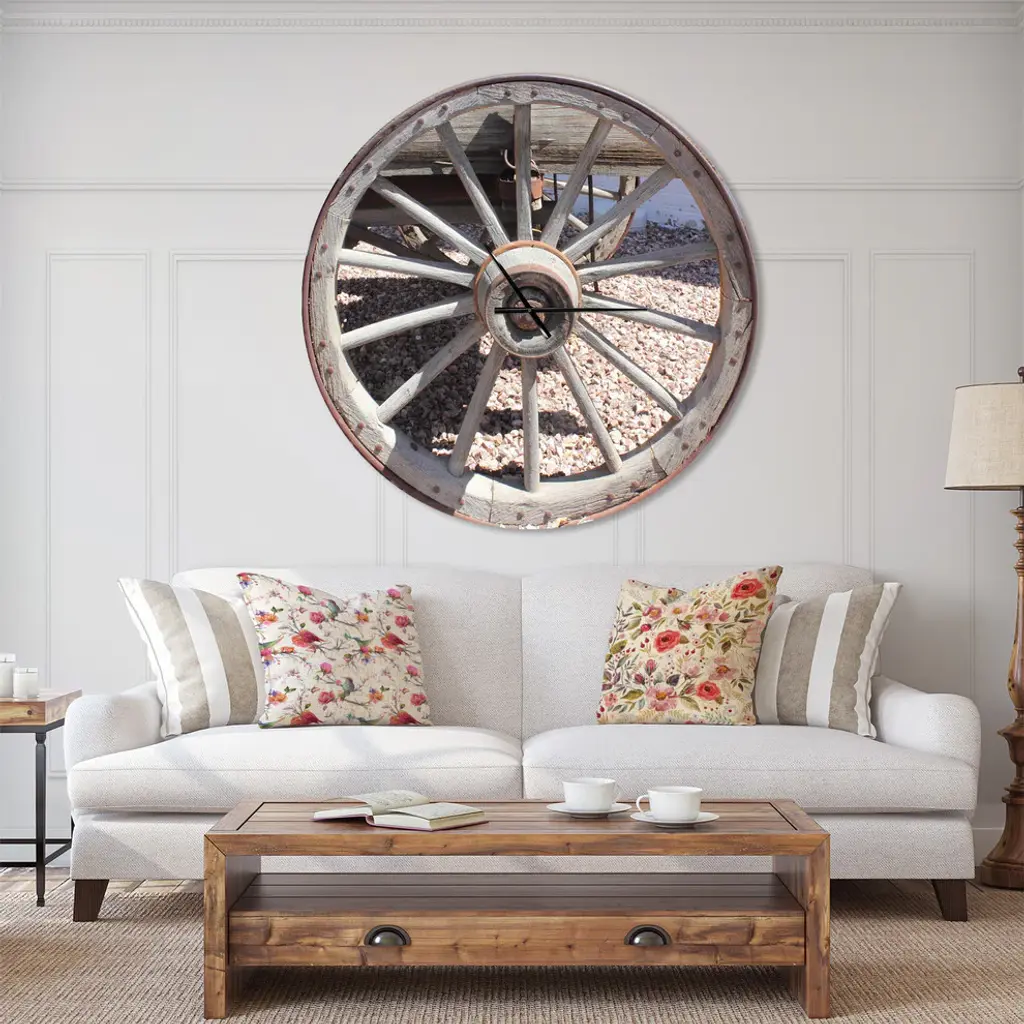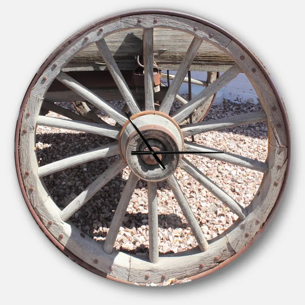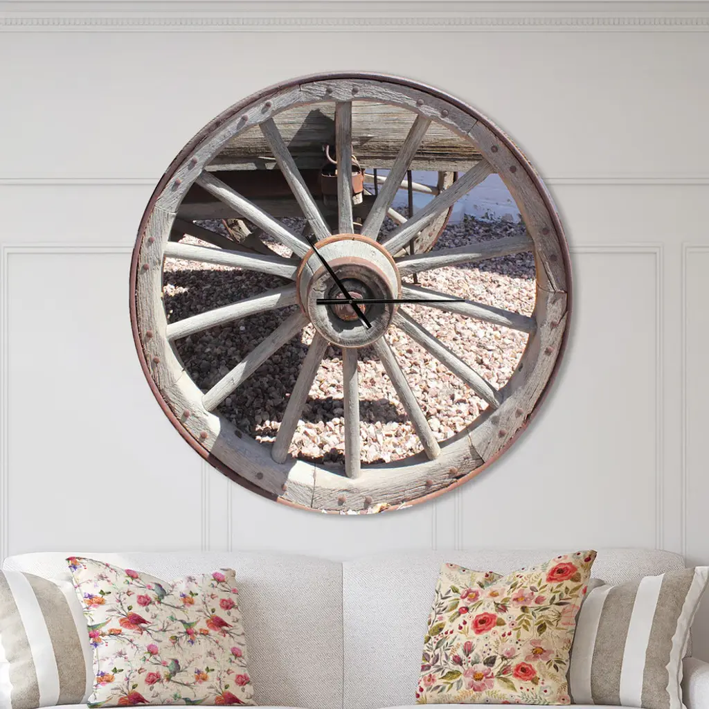 A beautiful addition to any home or office, this Farmhouse round wall clock is made on 100% solid aluminum. It has a highly reflective glossy finish creating a sleek modern look. This Spanish Cottage Carriage Wheel wall clock arrives completely ready to hang on the wall. Simply insert the �AAA� battery included with your order.Available in several size, this Modern Oversized Clock makes it the focal point of any room.Features - Ultra Gloss Coating ensures colors are extra vibrant with light reflection. - 1mm Aluminum grade sheet metal. - 1-inch mounting frame gives the illusion of artwork floating on the wall. - Mounting brackets and instructions are included. - High quality digital images are created directly into a glossy aluminum panel, producing a stunning and captivating print in the glossy finish of the metal. - Looks better than any photo paper and guaranteed to last at least 20 years. - Easy to clean with a microfiber cloth. - "AAA" battery included with your order. - Easy to hang. - Style: Farmhouse - Material: Metal - Shape: RoundSee Options drop down for available sizes.